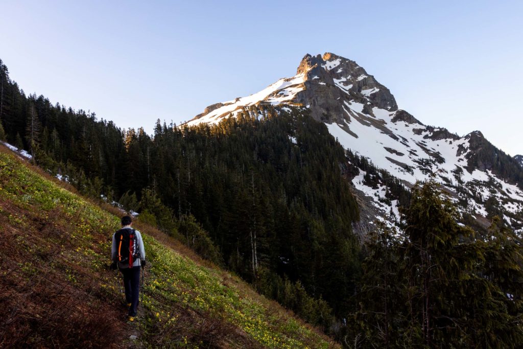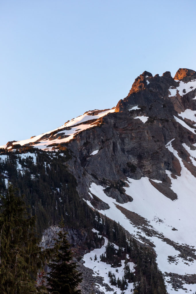 GPX tracks are quite useful so you don’t have to second guess when to turn north from the main trail. But if you keep your eyes open, right after crossing one of the main streams, you’ll start to see flagging. It’s really good if you can see them, but we found it a little difficult in the dark with just headlamps shining in front of you. I’ll take the blame for that one, and all the scratches for wearing shorts too. The climber’s trail is not terribly steep. I’d call it less steep than Eldorado, but less defined, hence straying away multiple times. Generally, you just want to go slightly looker’s right instead of straight up fall-line. It mellows out at the top before dumping you above the tree line. We barely made it for alpenglow and I definitely tried to scramble on the boulders a bit quicker to get a few pictures. Without much snow, alpenglow isn’t as wildly magnificent, but I’ll take what I get.