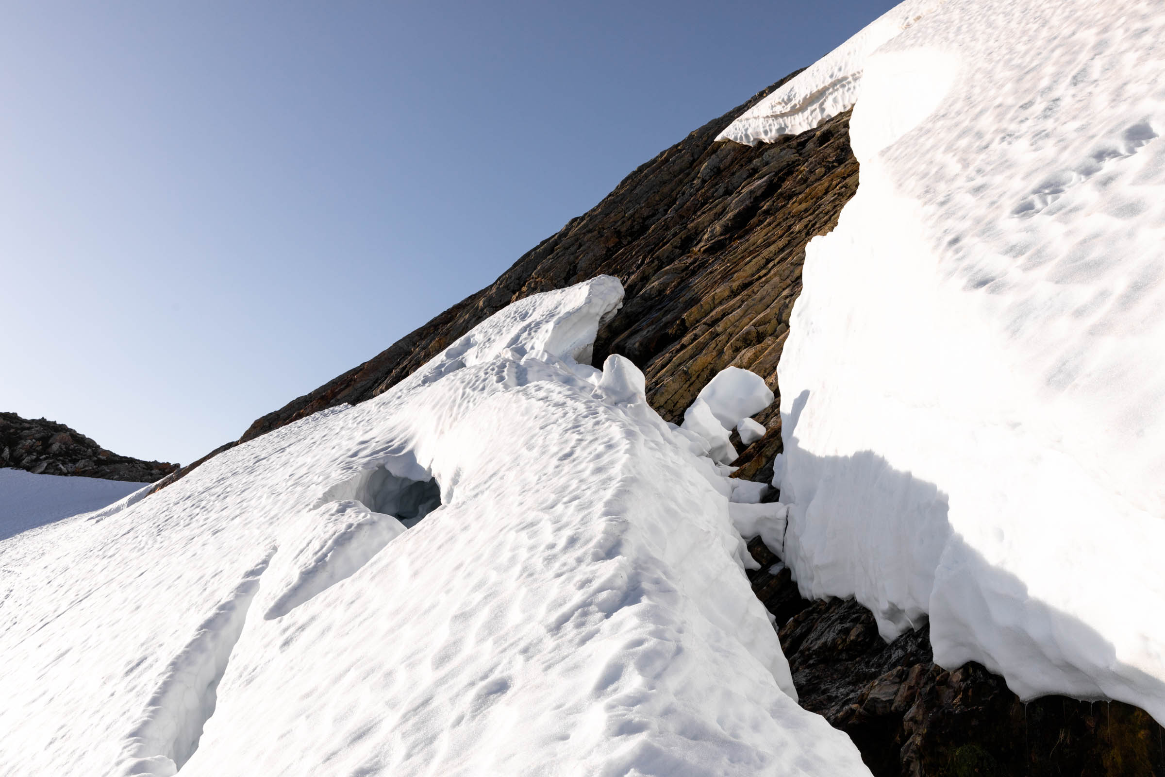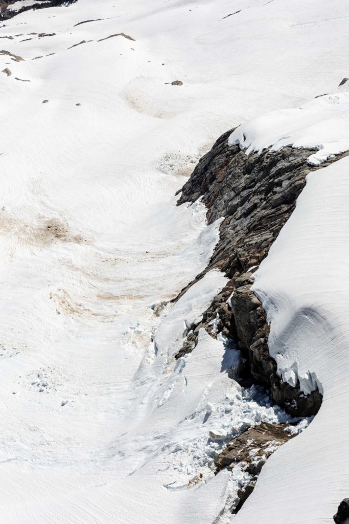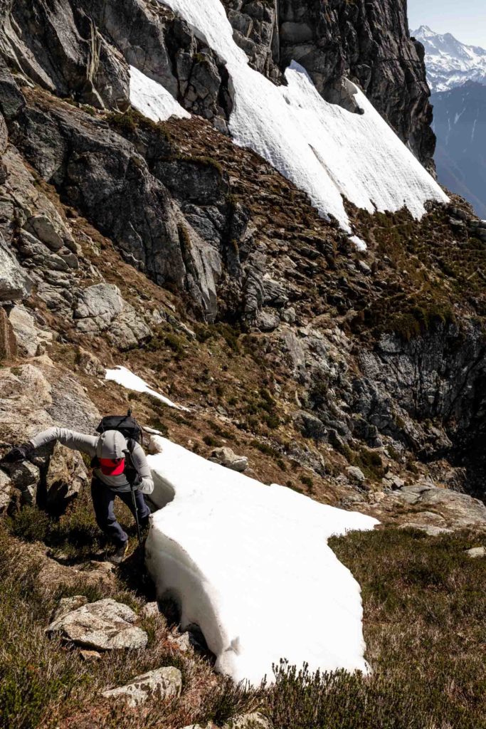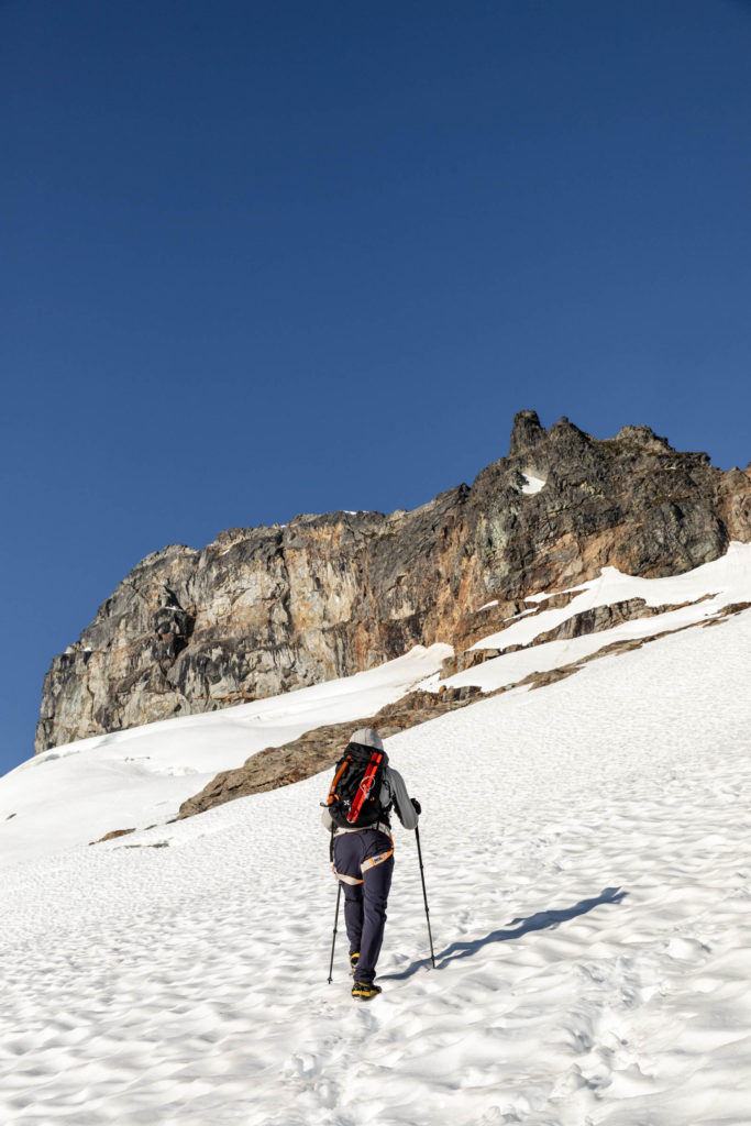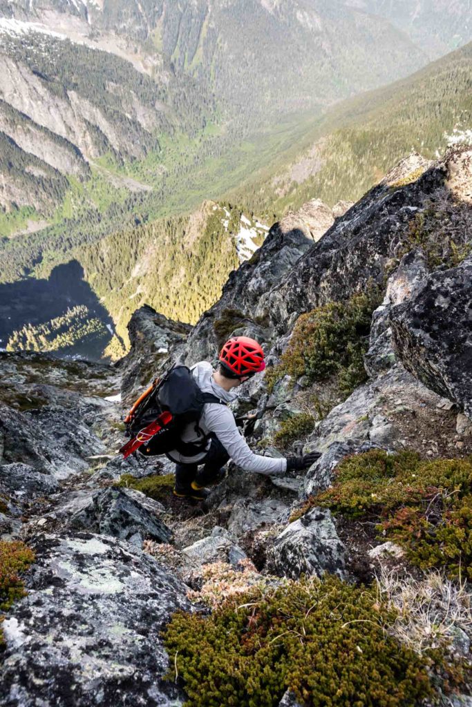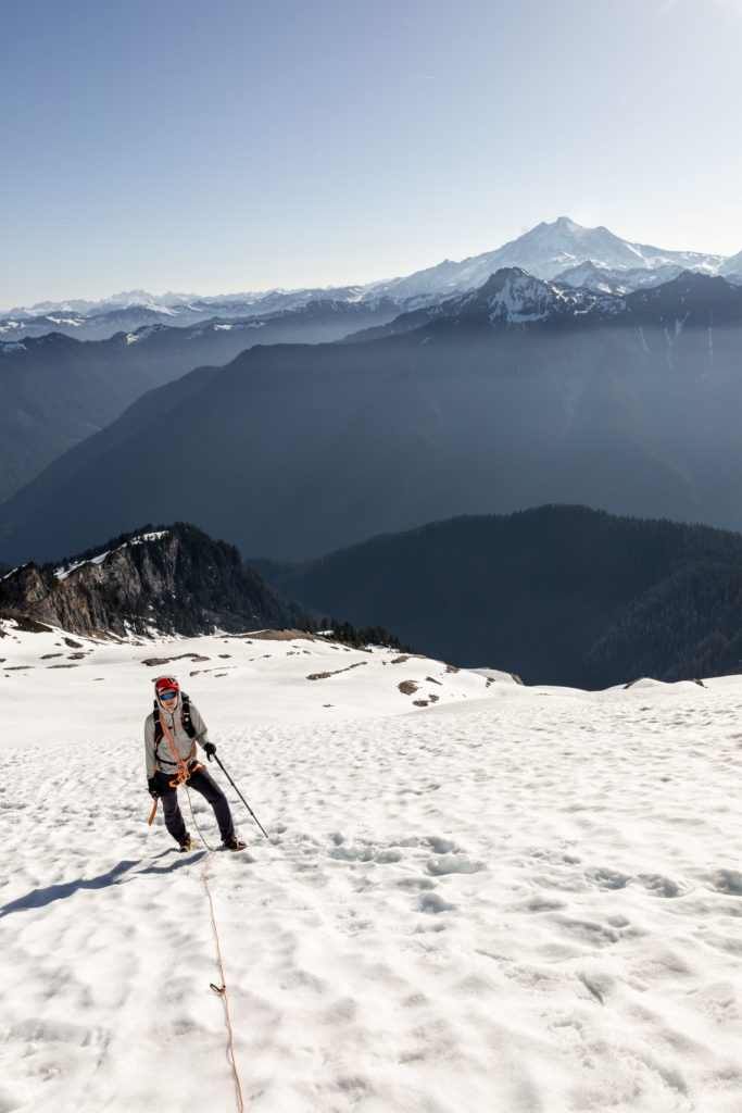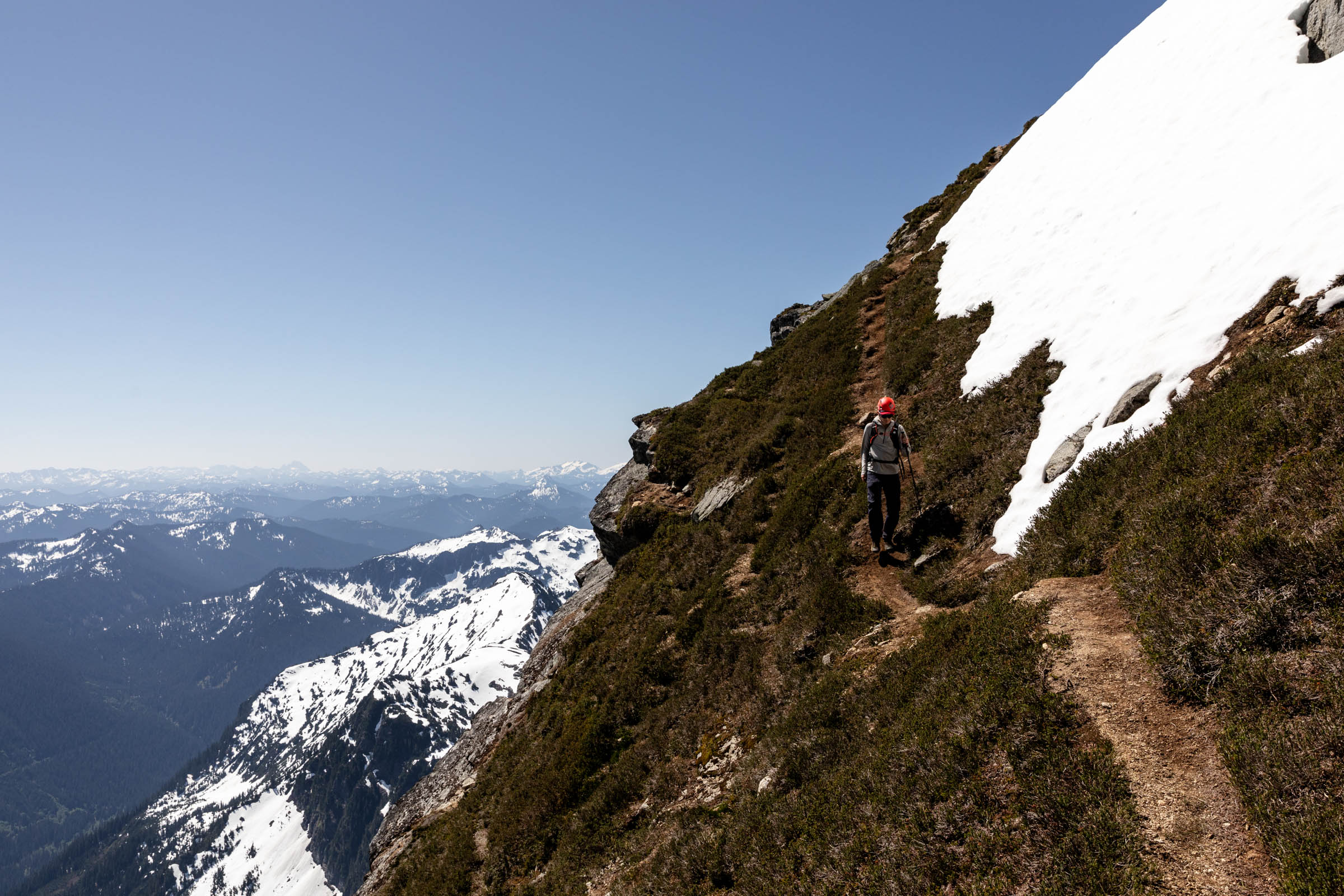 Moving on a rope team is often slow, but we made our way weaving between more than a handful of cracks in the snow. Before long, we had crossed the glacier and onto the rocky scramble again. We left our glacier gear at the base, a common thing to do to lessen your pack weight and minimize transition time. Since it was still early season, we had to skirt under a few snow patches, but generally, there’s a good heather terrace that allows you to step easily on the vegetated slope. We only caught the true trail on the way back down. Due to the snow, we had to go off the normal route a few times, which caught us in some moves I’d consider class 3+ for the exposure and big reaches. I had a grand ole time on the scramble, almost wished it was longer but I think I’d still prefer Del Campo over this scramble. The moves are just more aesthetic over there.