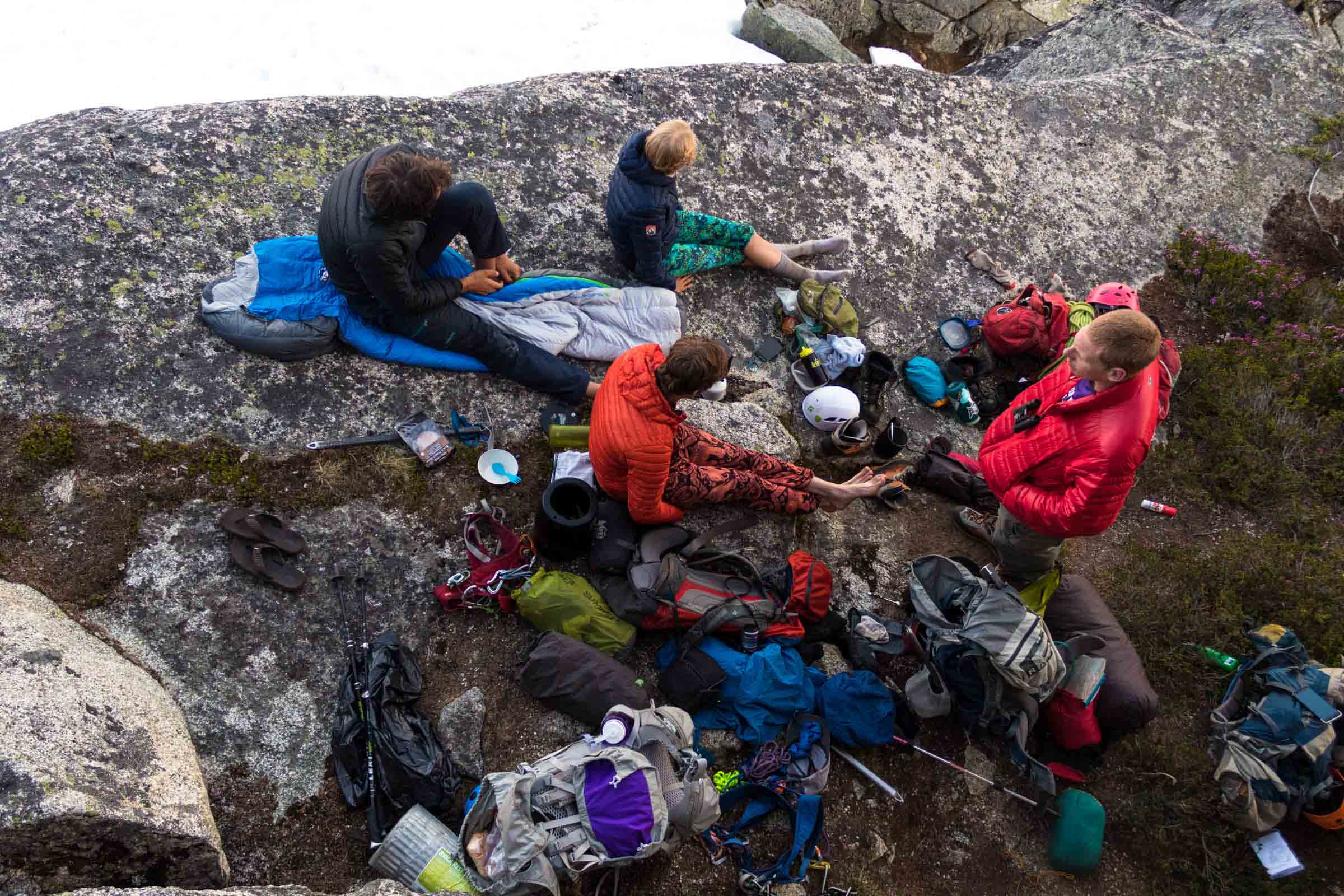 - If you’re using a bear barrel, stuff as much stuff as you can inside, doesn’t have to be food for the first night – could be easier to stuff clothes into it first. But this should go at the bottom right on top of your sleeping bag. It’s bulky.