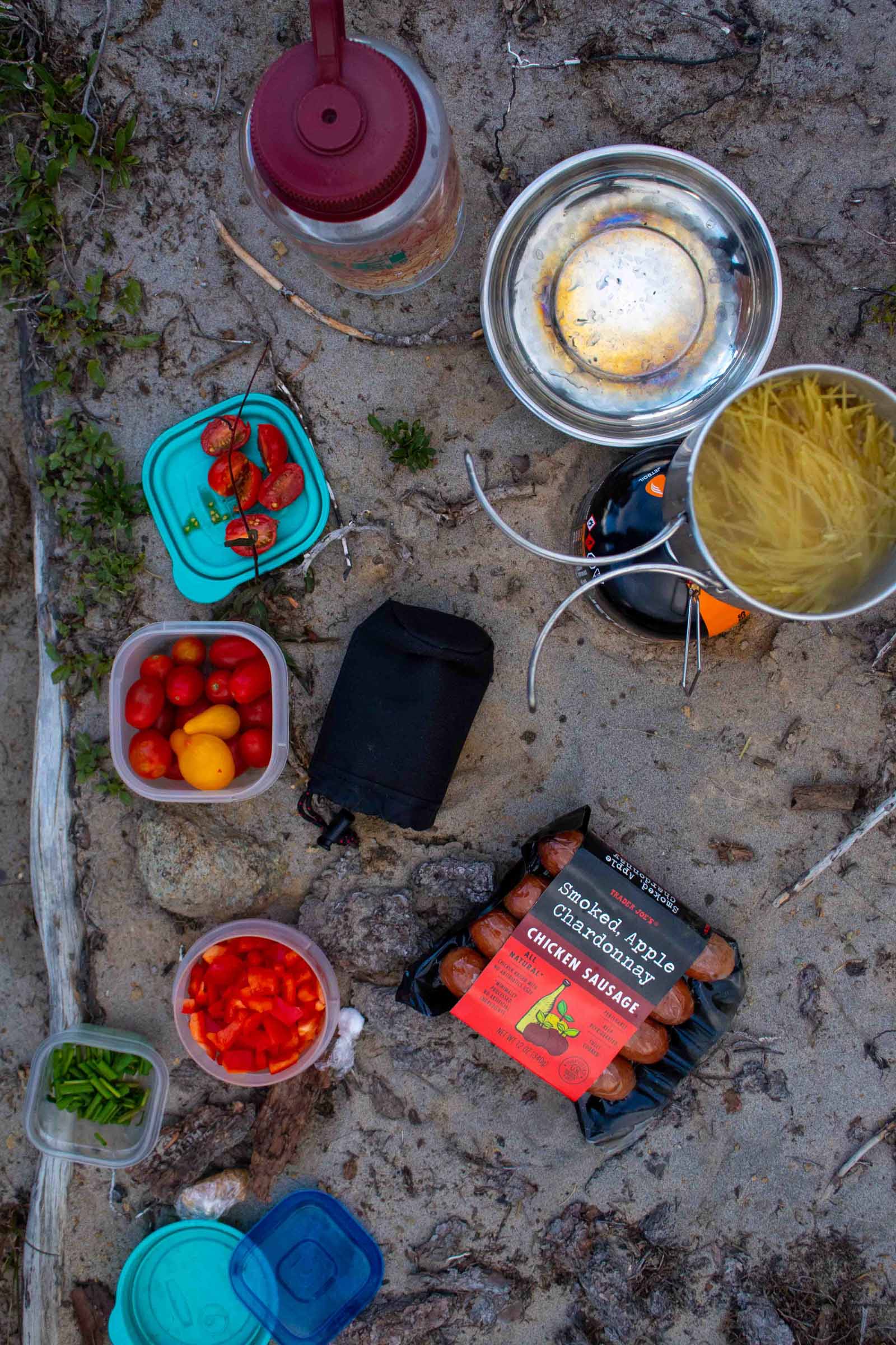 - Then add your cooking gear (pots/fuel/stove), dinner food and water filter.