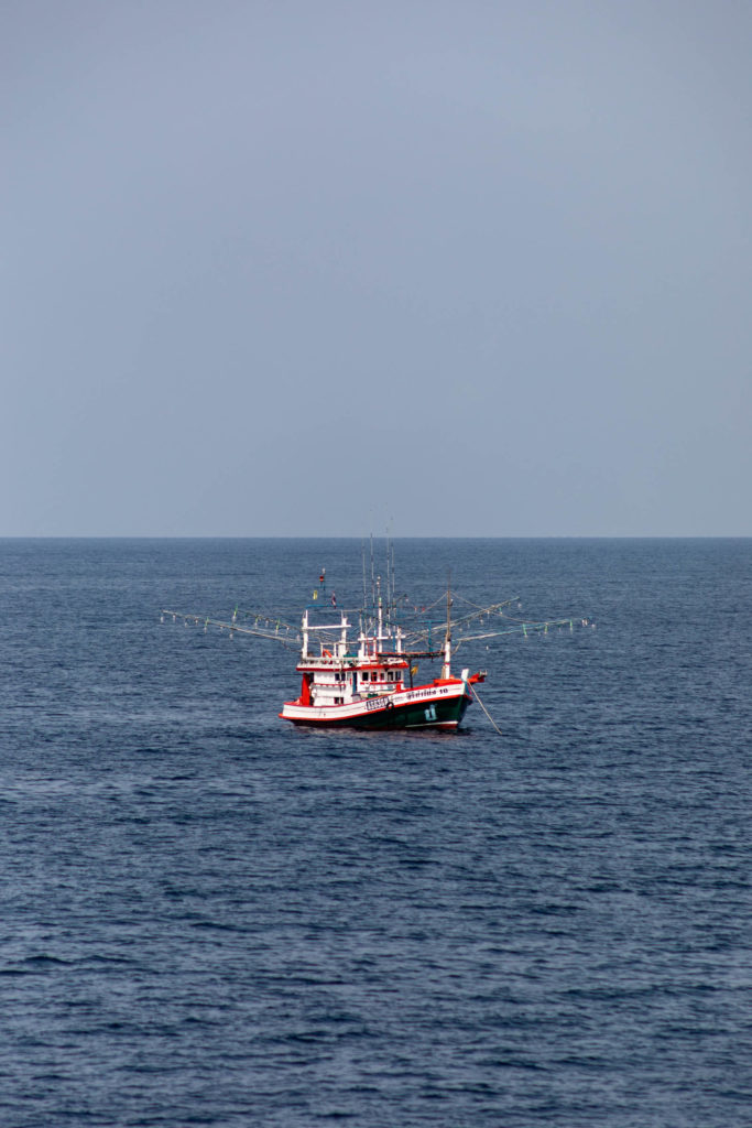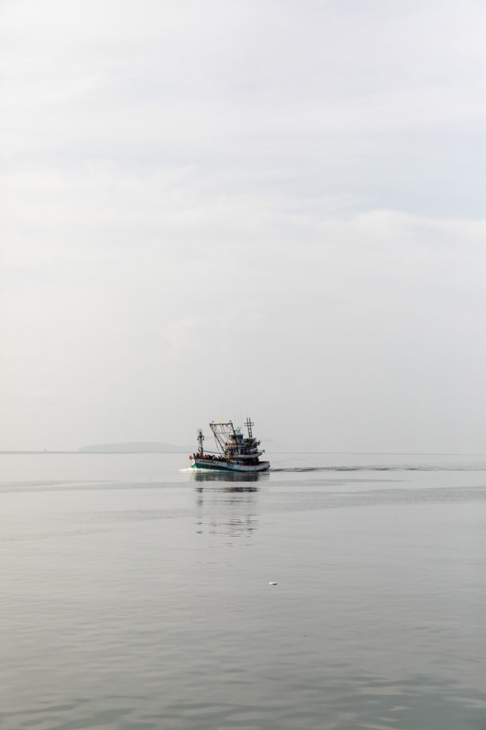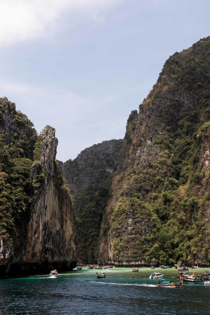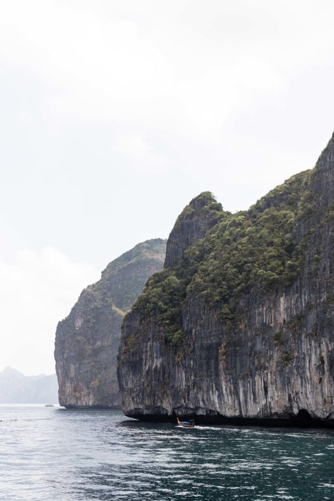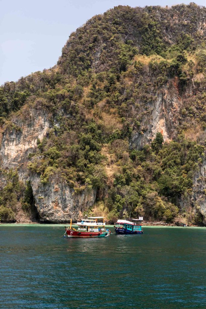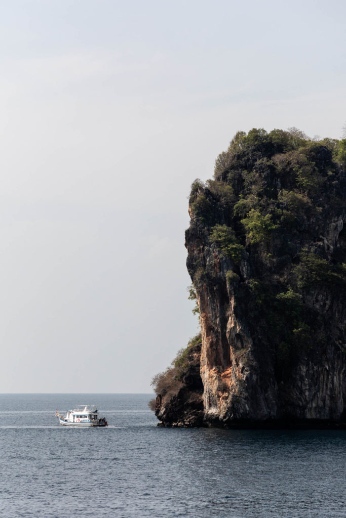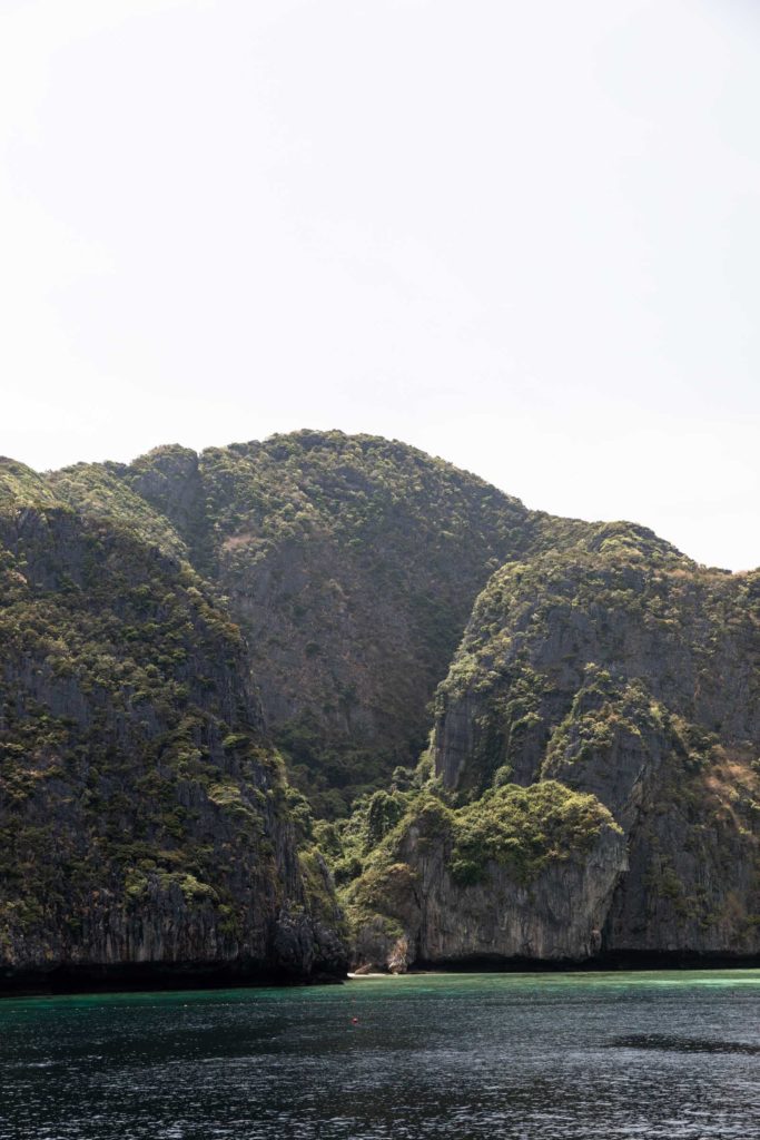 The slower ferries take about 2 hours to cross the bay instead of the 1 hour on a speed boat. I opted for the slower one for a slightly cheaper price and a smoother ride. You’re allowed to sit wherever and I sat on the top deck enjoying the breeze and got a little too much sun! Make sure you sunscreen enough here because the sun is very strong especially out on the water. On the way to Phi Phi’s Tonsai Pier, we passed a few rock islands and fishing boats.