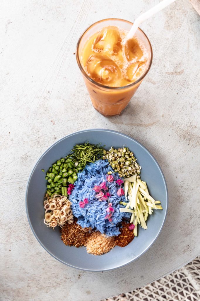 Having only booked the kayak for an hour, I started to return back and letting myself relax when I knew I wouldn’t be late. I dried off a little and walked along the boardwalk to find a lunch spot. I don’t think you could really find something that’s “local” per say, but nearly everything is Thai food, just often a little fancied up for tourists. So I ended up at the Phi Phi Princess Resort. I didn’t mind that all too much for the beautiful meal I got. I couldn’t resist the blue rice and what seemed like the perfect summer day meal. And thai tea on the side of course! All that cost just 230 THB, just under $7 even for having an up charge on location.