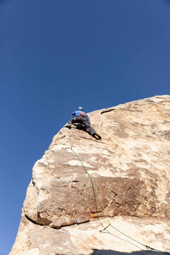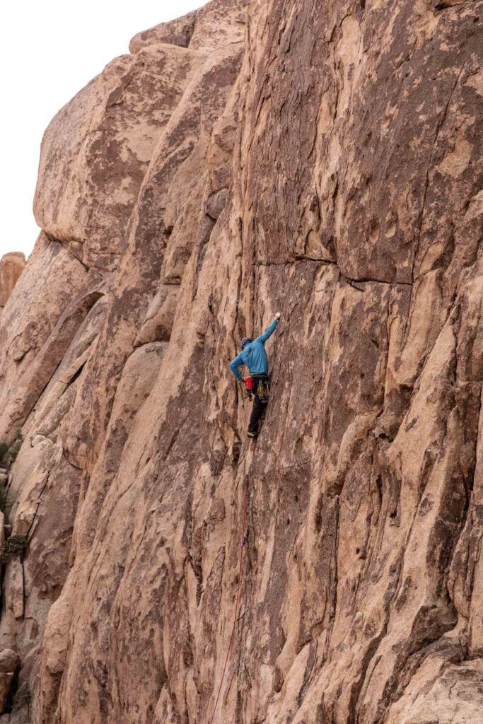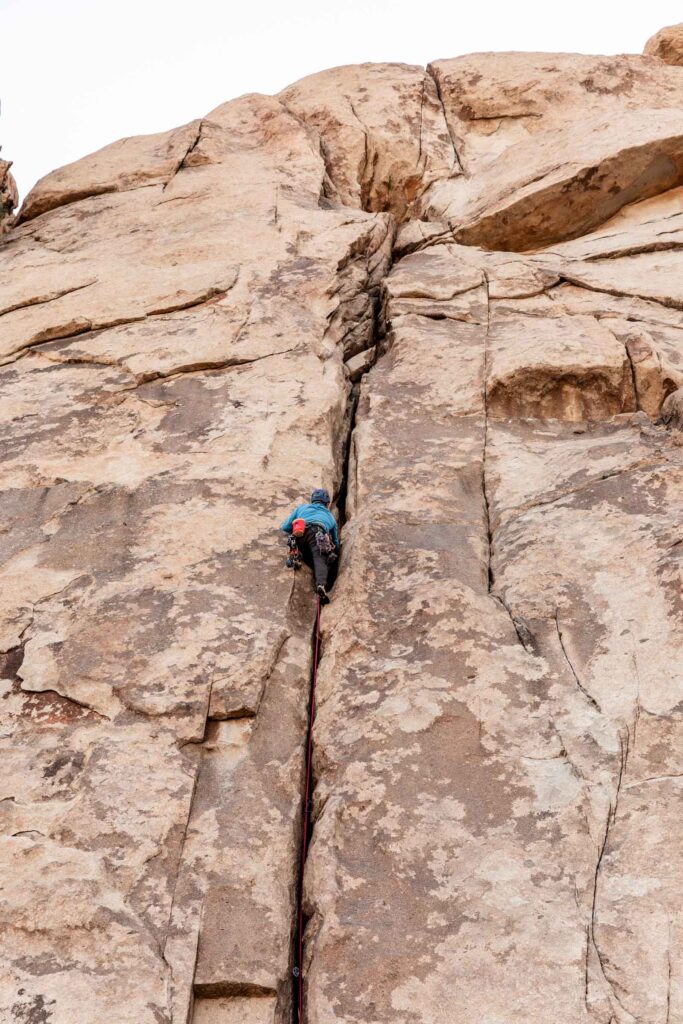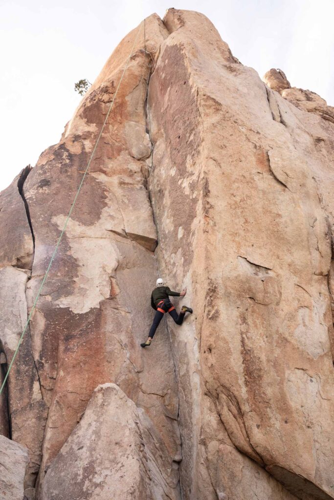 It was still early in the day, so there was plenty of climbing ahead of us! We went to claim our spot at the Headstone Wall, thinking that it would be crowded. But like every other climb, somehow post-Thanksgiving was pretty empty for the park. This crag is by Ryan Campground – make sure you park at day-use spots and not someone’s campsite. It’s a short walk and interesting big boulder scrambling to get to the base of the climb. It’s super airy, so it’s not for the faint of heart with bolts spread apart, it makes you commit to each move. SW Corner is rated a 5.6, which I would disagree for its exposure, but sure makes for some great pictures on this wall. You can set up a top rope from there to the equally famous Cryptic route (5.8). Get your cool no-legs “cut” picture! It gets breezy here by the way!