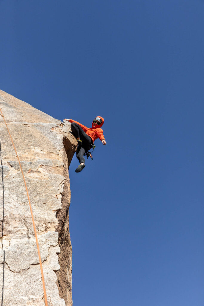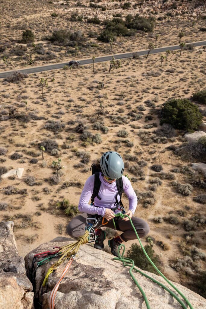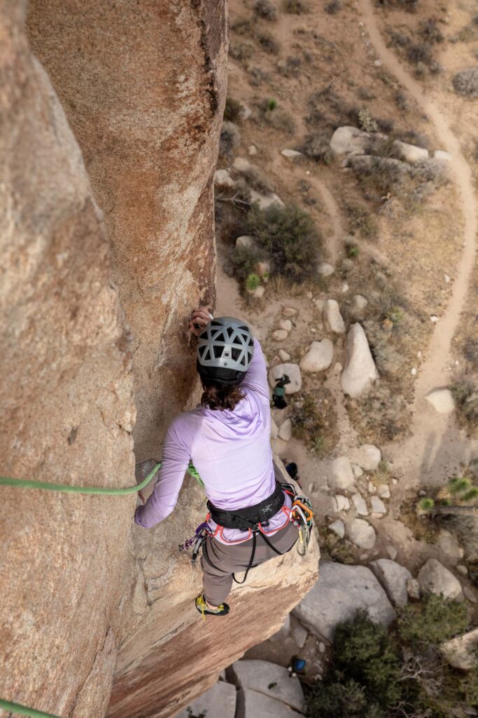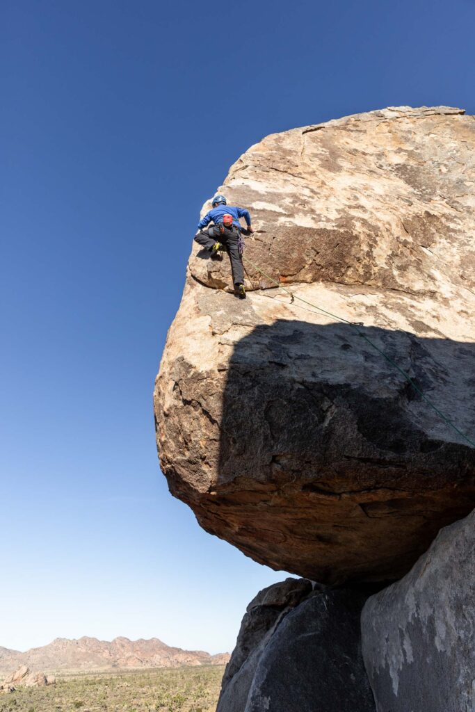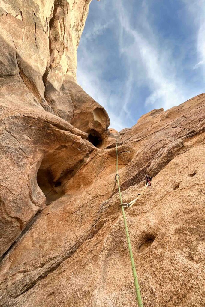 It was still early in the day, so there was plenty of climbing ahead of us! We went to claim our spot at the Headstone Wall, thinking that it would be crowded. But like every other climb, somehow post-Thanksgiving was pretty empty for the park. This crag is by Ryan Campground – make sure you park at day-use spots and not someone’s campsite. It’s a short walk and interesting big boulder scrambling to get to the base of the climb. It’s super airy, so it’s not for the faint of heart with bolts spread apart, it makes you commit to each move. SW Corner is rated a 5.6, which I would disagree for its exposure, but sure makes for some great pictures on this wall. You can set up a top rope from there to the equally famous Cryptic route (5.8). Get your cool no-legs “cut” picture! It gets breezy here by the way!