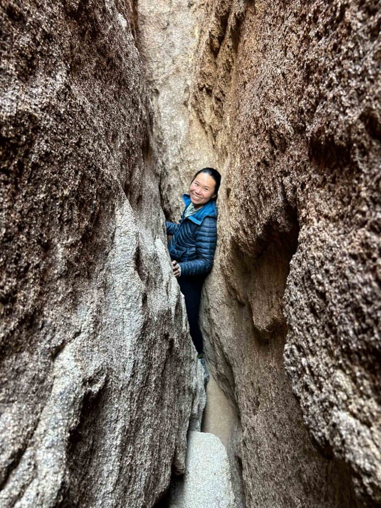 If you have time left, go over to the opposite rock for exploring the true Hall of Horrors. We entered on the east side and found lots of fun pathways, including a narrow shimmy pathway and lots of scrambling up and down. We exited out the west side where most people were found. It took some effort to “chimney” down, pressing my back to one side and my feet on the other side and slowly lowered myself to the ground. Obviously, do only as much as you can and make sure you can always go back out the way you came so you don’t get stuck! This was absolutely so much fun!