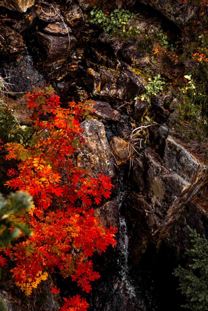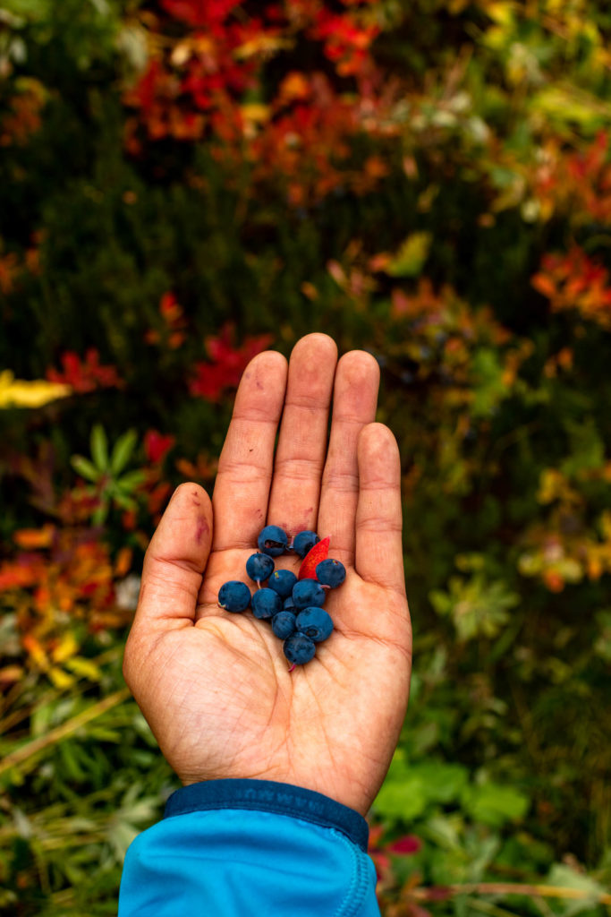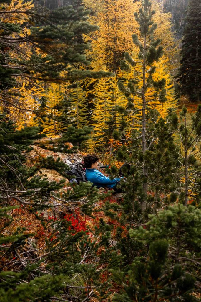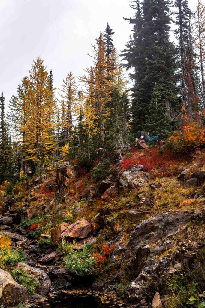 This area of the Chiwaukum was starkly different than the larch growth area in the Chelan-Sawtooth Wilderness. Fall colors were more abundant (as were blueberries), and the larches grown here are more spread apart. Initially, I wanted to get to the top of the ridge, but the closer we got, the more I got enthralled by the beauty of fall colors. This stream that led into the third lake was flowing through the most glorious colors. So much that I decided not to continue up the ridge and just wander along the stream. We set our packs down and started feasting on the largest mountain blueberries I’ve had. I couldn’t believe that they were still ripe this late in the season!