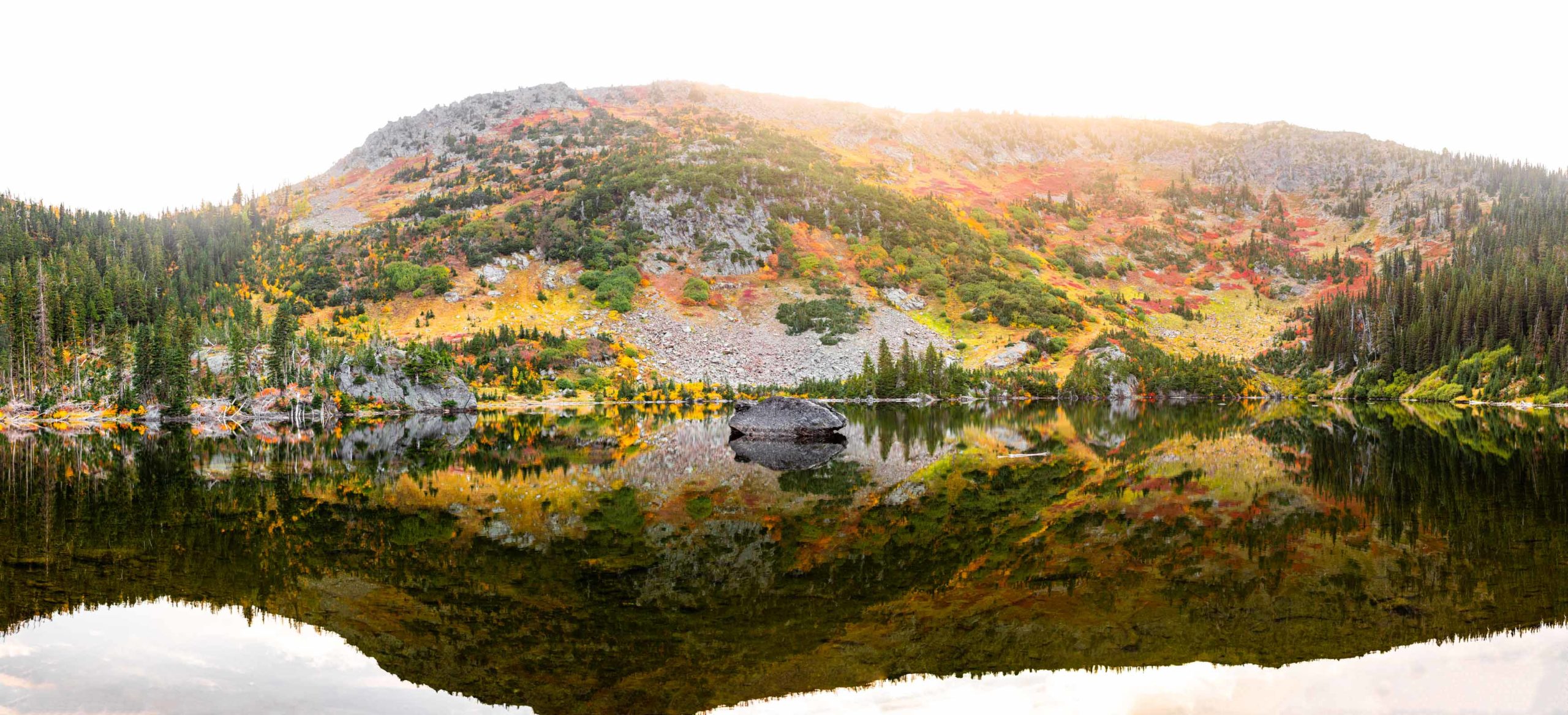 Surprised by how tired we got, we decided to stop at the first lake and set up camp there. We found several flat camp spots around the lake and randomly chose one not too far from the trail. When we took a little break over to check out the lake, ooh wow, the opposite side was brimming with colors! But in my chill state of mind, I honestly didn’t take too many pictures and just enjoyed it with my eyes in the present.