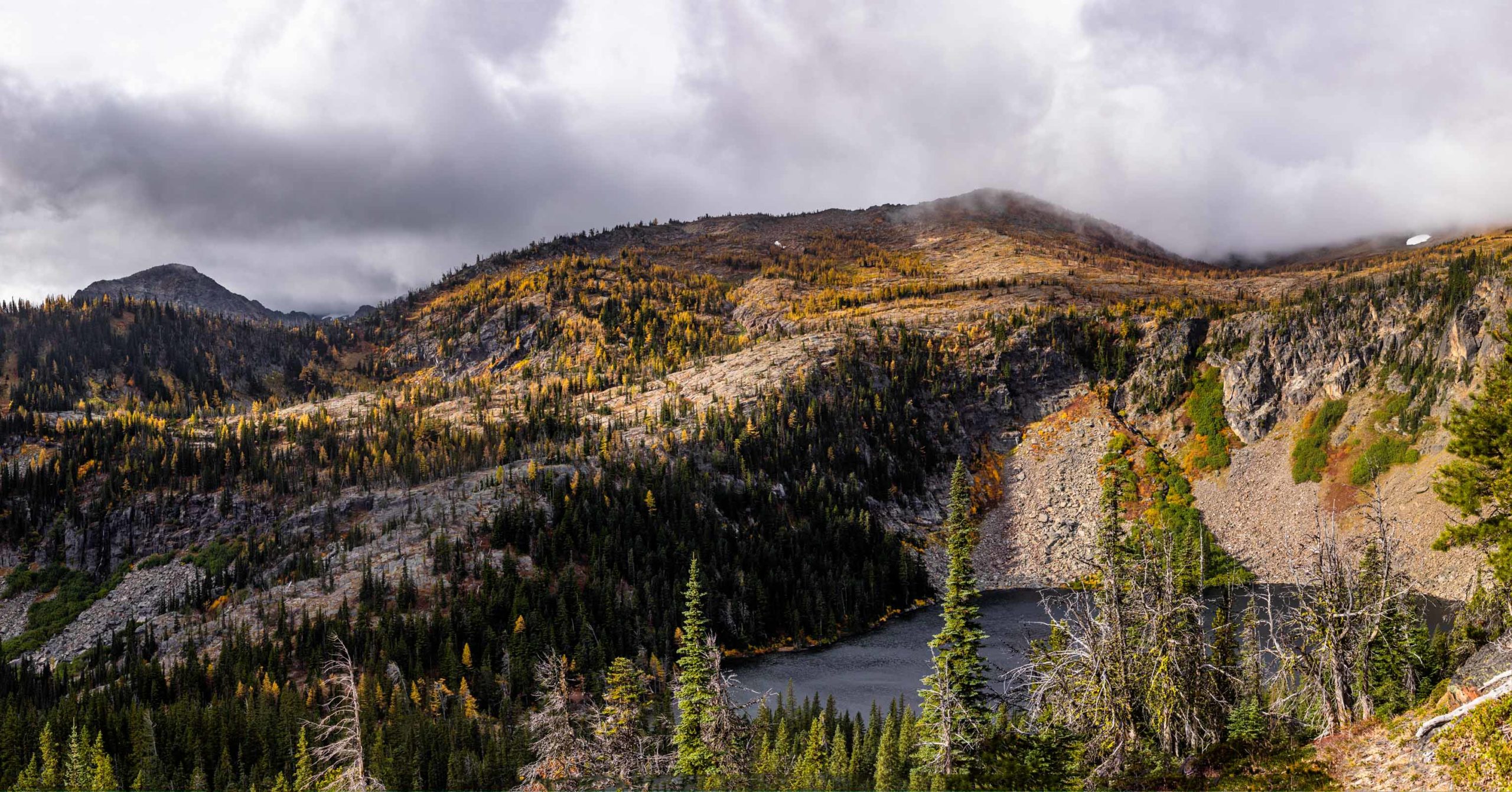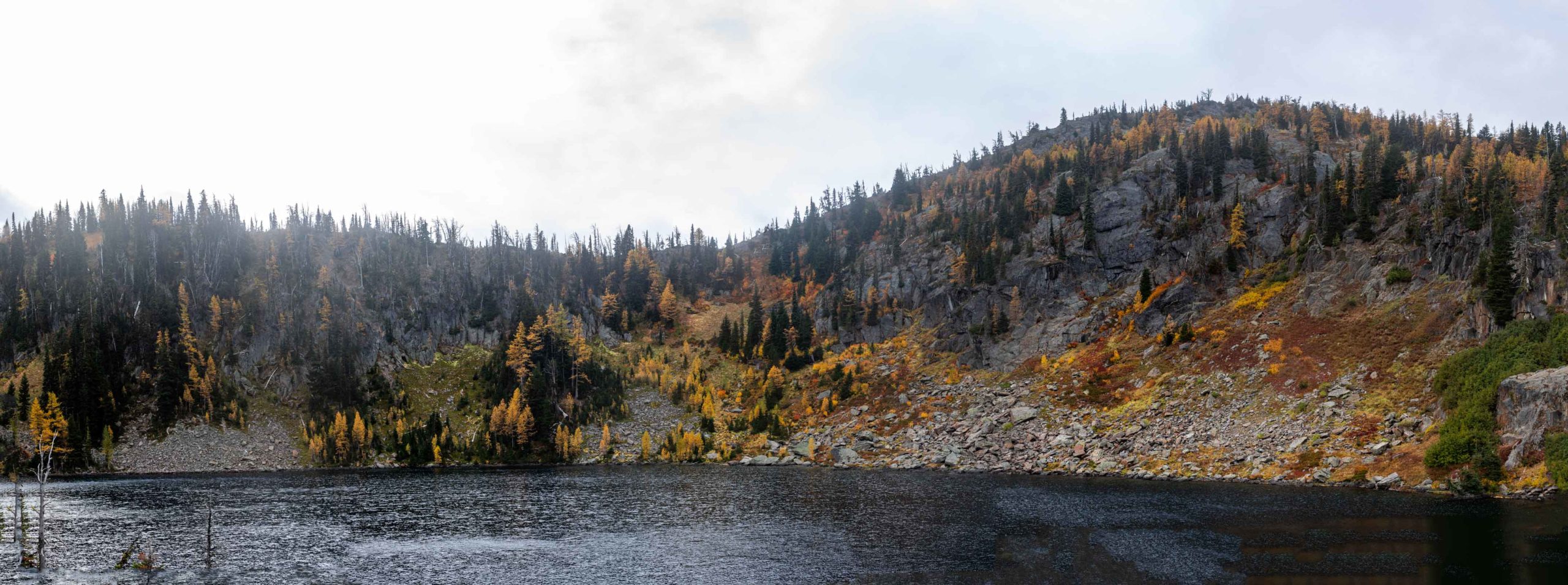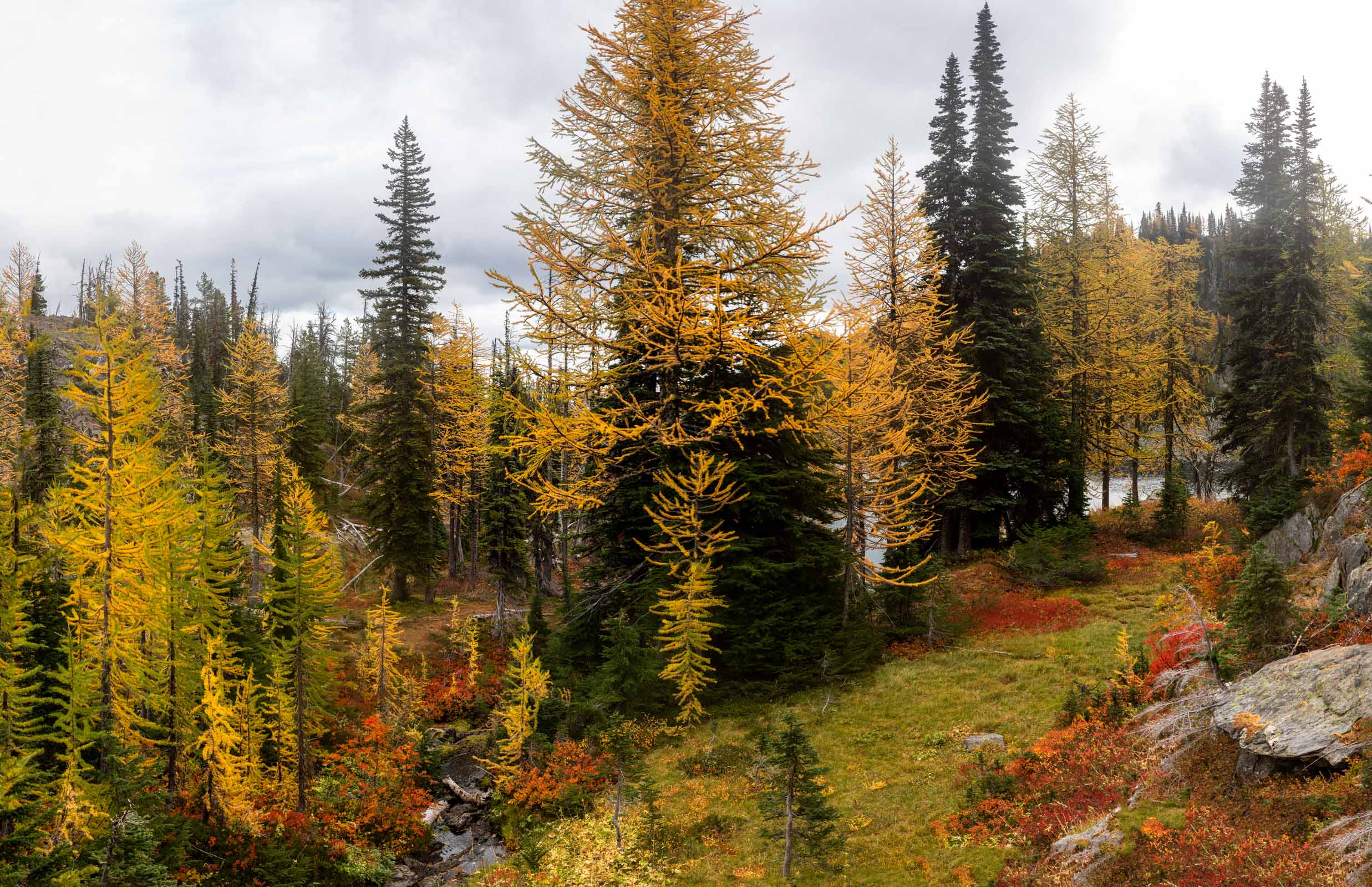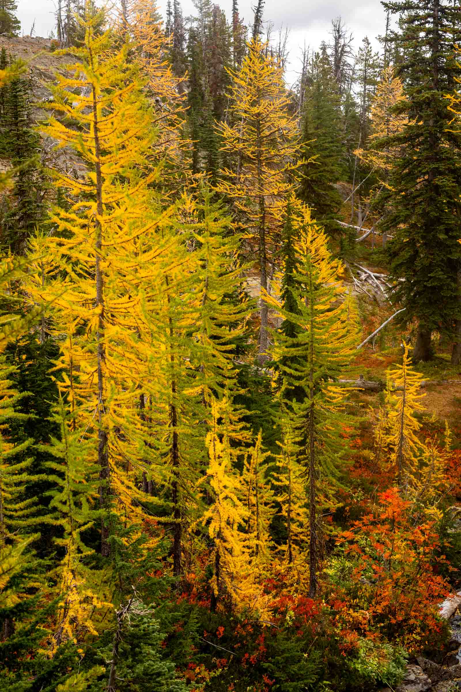 In the morning, it was too cloudy to properly enjoy a sunrise, so we took a lazy time to get going. We decided to wander over to the other lakes and find where more of the larches were. After all, this was supposed to be a larch backpacking trip! The few larches near our camp site just weren’t quite enough to wow us. As we descended down to the second lake, we found a few more backpackers and began our larch immersion.