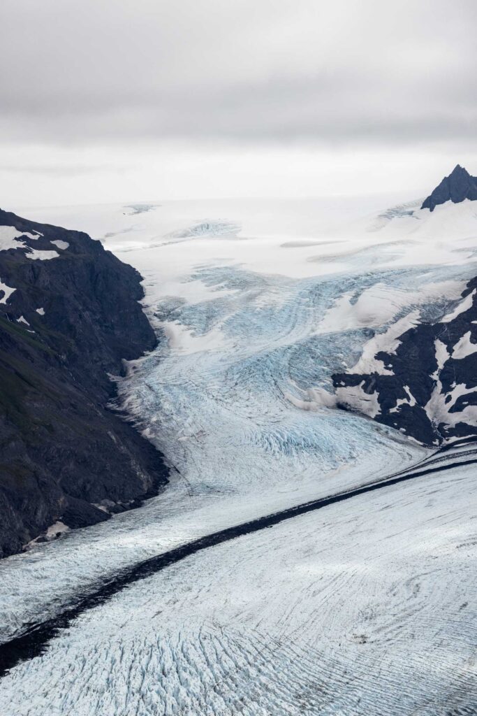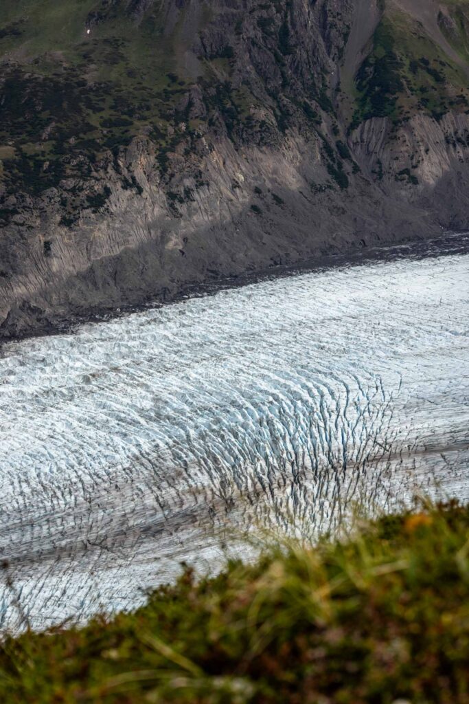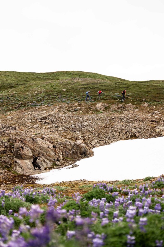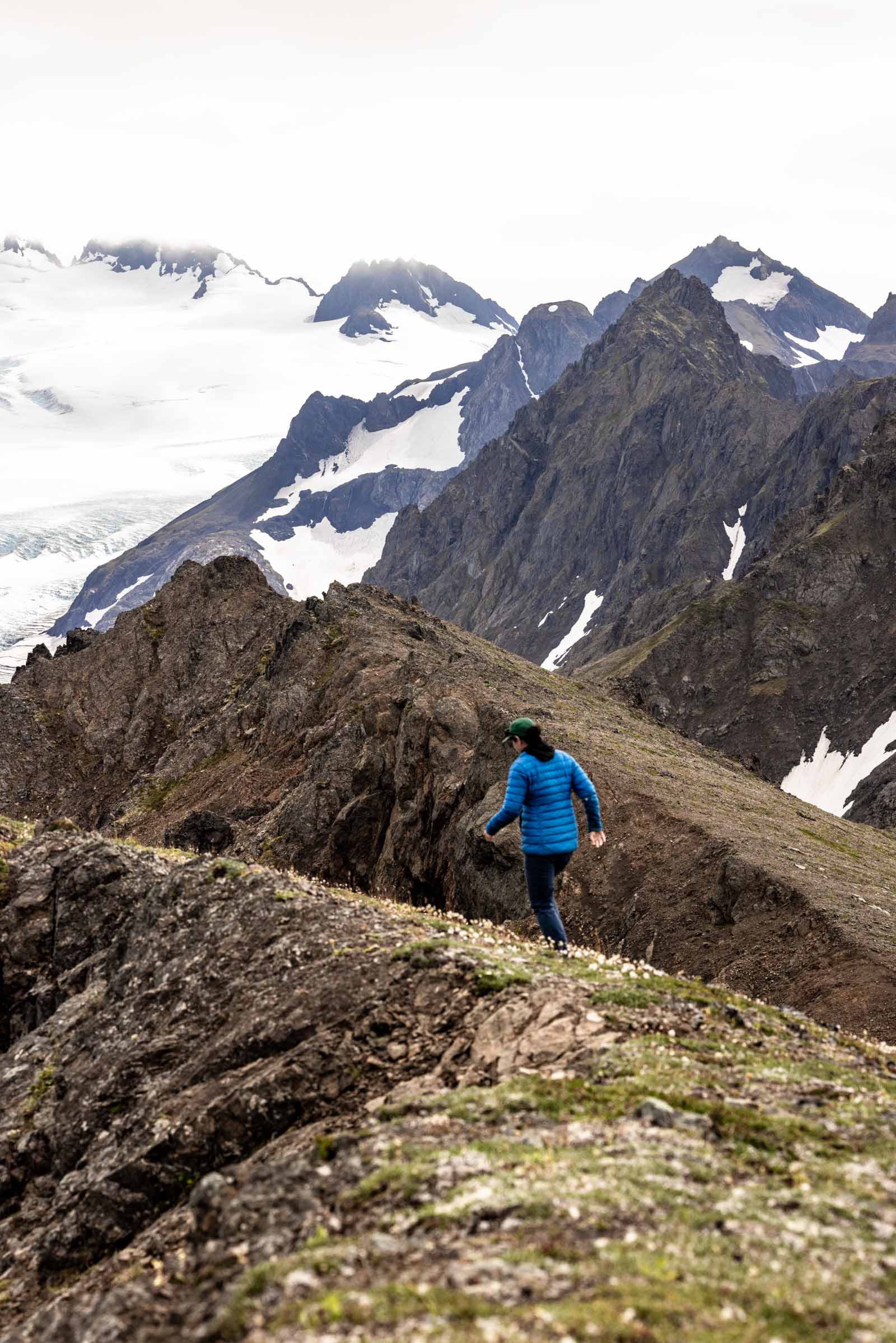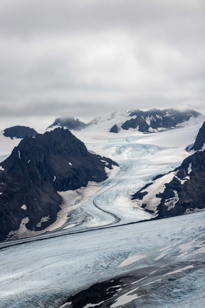 In August, the flowers are still blooming and it was gorgeous walking amongst them. We picked our way through ridge, which is largely flat at the top with cliffs that drop off steeply. At this point, there’s no true trail, so do your best to hike through being mindful of the plants when possible. We ended up hiking as far as we could along the ridge until we got a very incredible and clear view of the top of the glacier. On the other side of the peaks we could see was the start of Kenai Fjord National Park and immediately different glaciers drop off. It was mind-blowing seeing the vastness of the glaciers and the peaks surrounding them. I think the clouds added a cool effect of mystic.