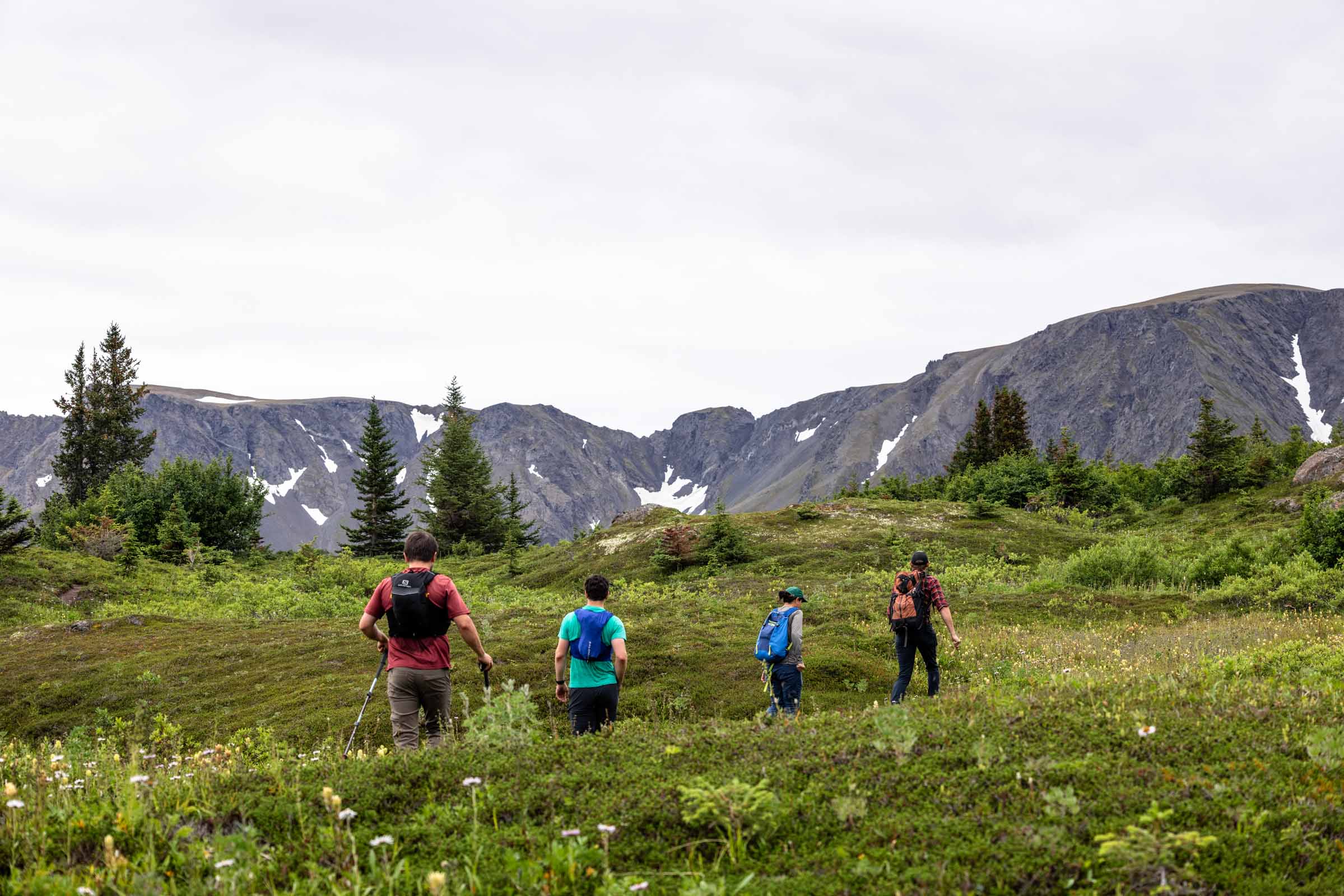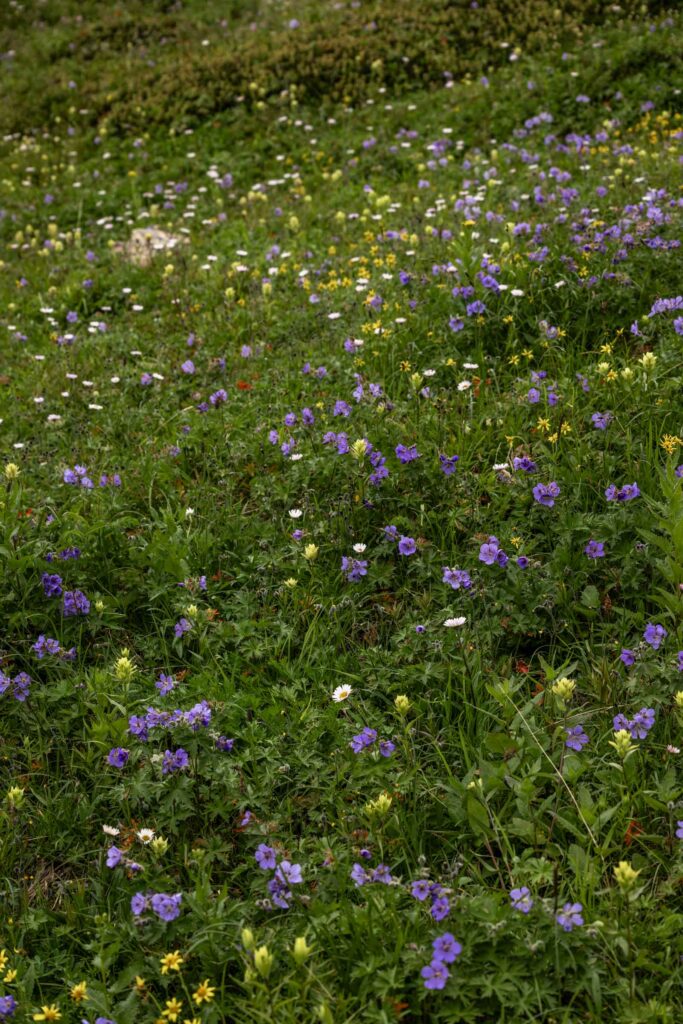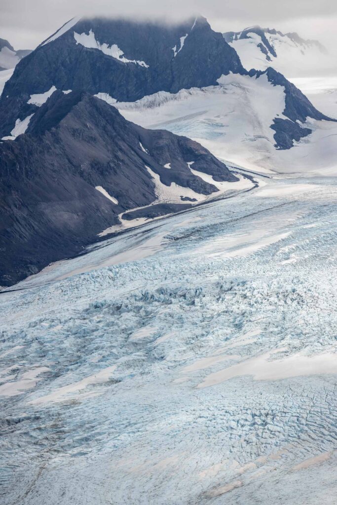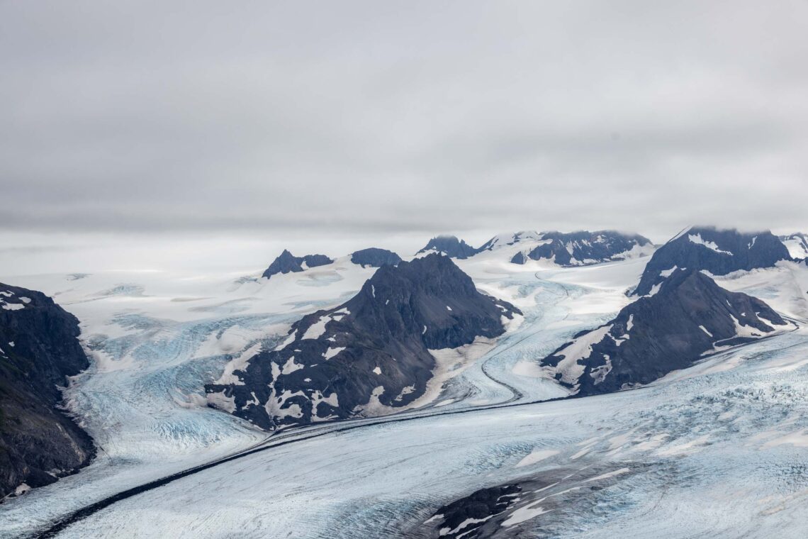 In August, the flowers are still blooming and it was gorgeous walking amongst them. We picked our way through ridge, which is largely flat at the top with cliffs that drop off steeply. At this point, there’s no true trail, so do your best to hike through being mindful of the plants when possible. We ended up hiking as far as we could along the ridge until we got a very incredible and clear view of the top of the glacier. On the other side of the peaks we could see was the start of Kenai Fjord National Park and immediately different glaciers drop off. It was mind-blowing seeing the vastness of the glaciers and the peaks surrounding them. I think the clouds added a cool effect of mystic.
