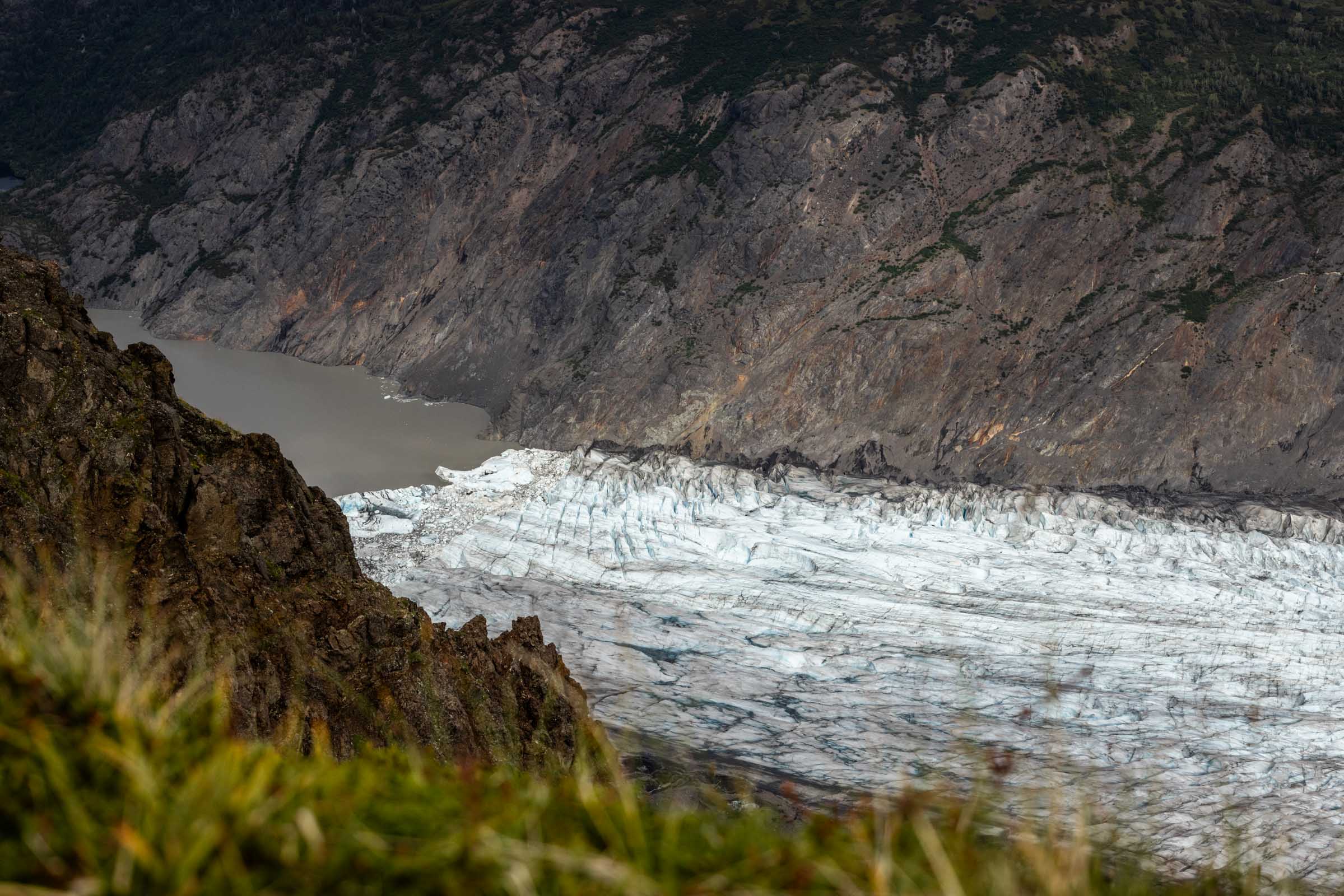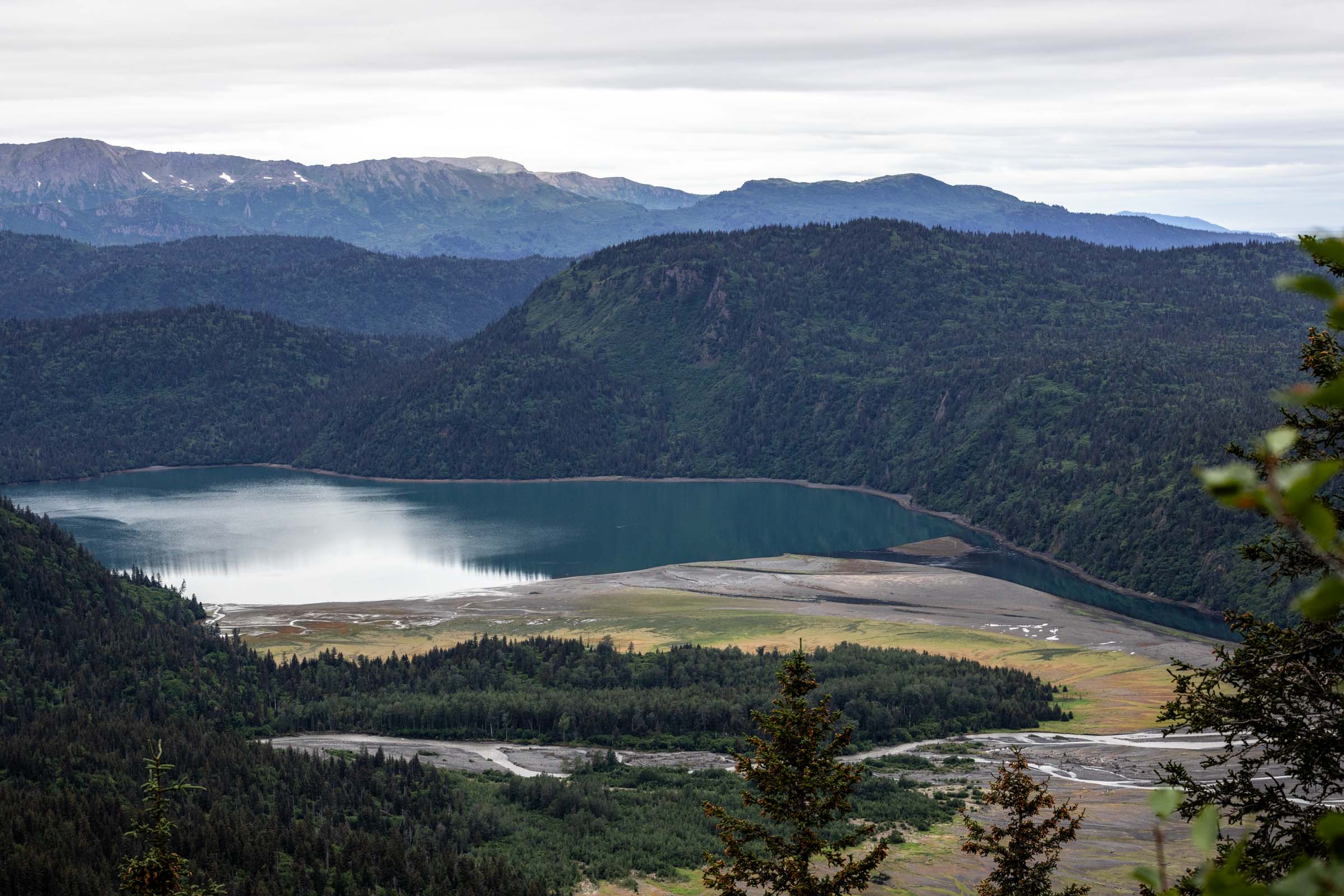 Along the ridge, you climb steeply through thick bushes for the first 2000 ft, just like any other Alaskan hike nearby. There’s some hand lines placed to assist some of the slick steep sections. Immediately after 2000 ft of elevation gain, the trail becomes pleasant and undulating. In and out, glaciers become visible. You’ll get a sneak peak of the Grewingk Glacier and its lake.