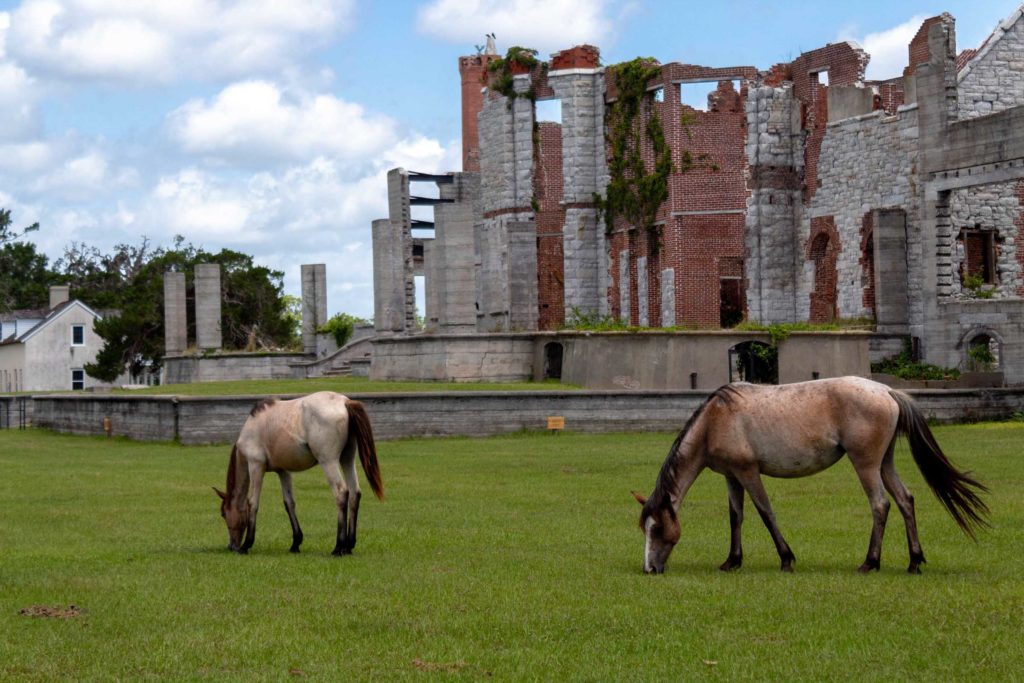 We honestly didn’t know if we’d see horses at all, since they’ll sometimes stay at the far end of the island, and the NPS didn’t guarantee horse sightings. But we were 100% wowed when we approached Dungeness Ruins. Everywhere we turned, we would find more groups of horses. Usually they roamed in groups of 2-5 or so. We continued exploring around the ruins, even towards the ranger housing area, where we found even more horses. Eventually, we returned back to the ruins and found new groups of horses that had replaced the previous ones. There was one foal we saw, and by golly it was cute!