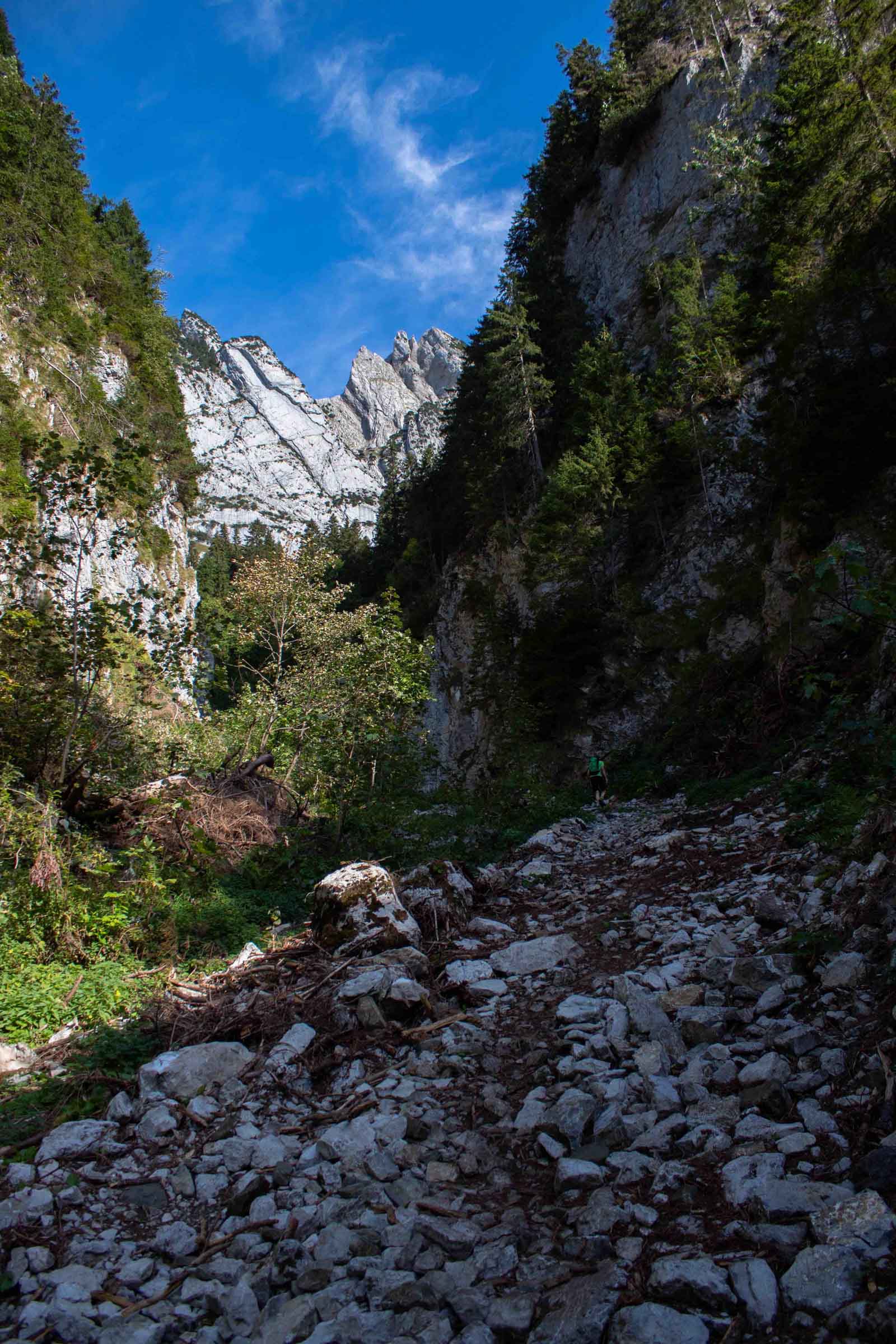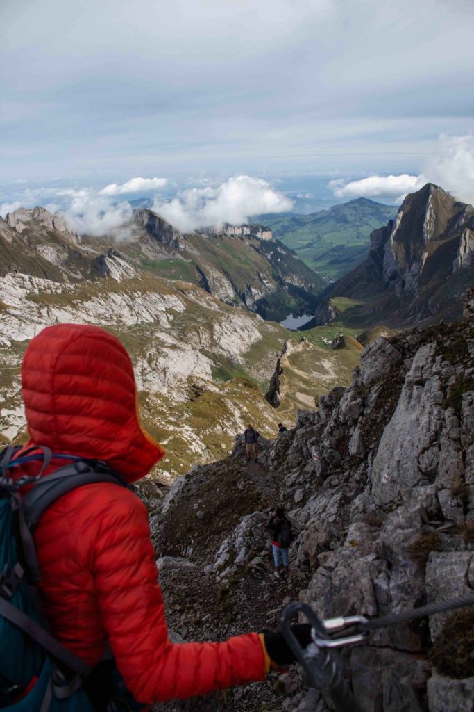 We probably spent too much time soaking it in, but little did we know we would have 11 more miles to hike this day, plus a long downhill and uphill before Säntis. As we descended down the other side of the ridge, we quickly realized that the route can be via ferrata. Via ferrata means going by iron, where typically one would be harnessed and hooked up to the steel cable secured on rocks. However, we were reassured by other hikers who were climbing up without technical gear. The steel cables were sturdy and reassuring when we down-climbed another 700 feet, while enjoying views of the Fälensee valley. We also saw quite a few people going both ways, but props to the lady who was hiking this while pregnant!