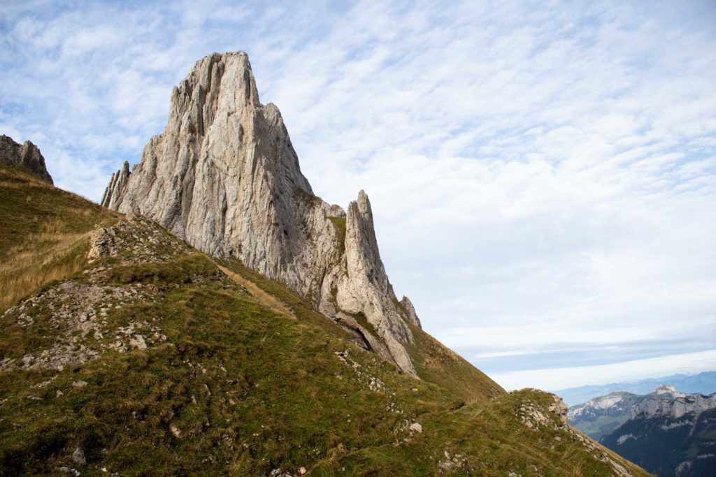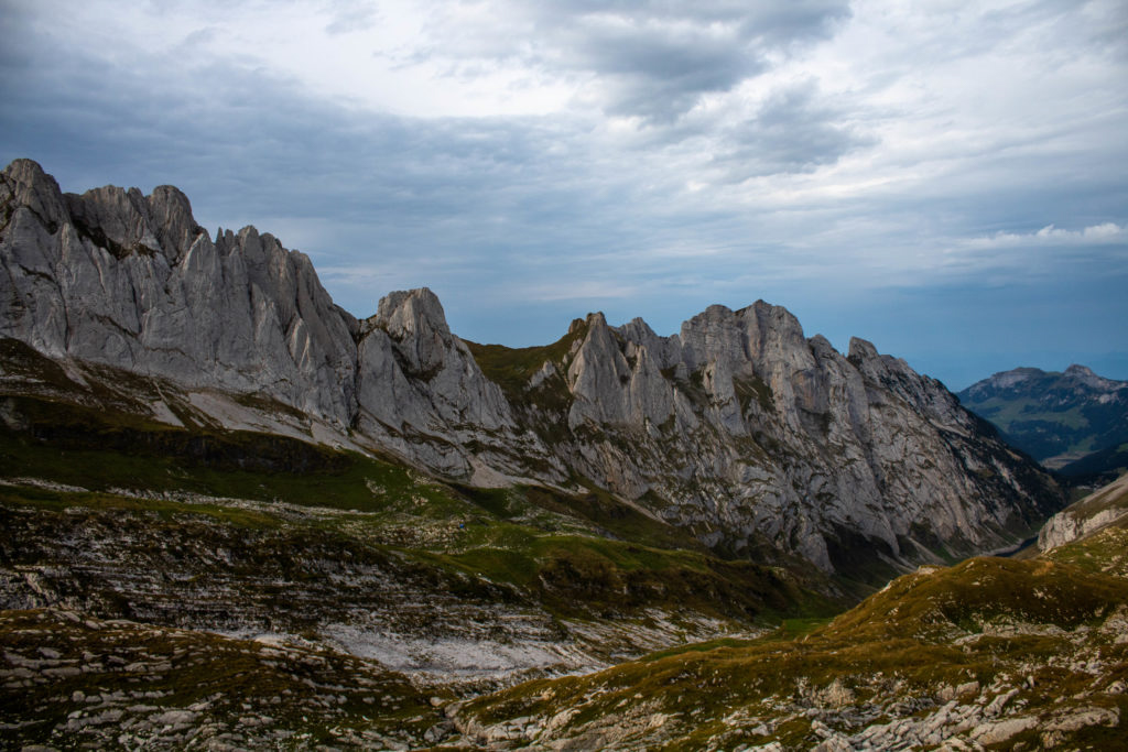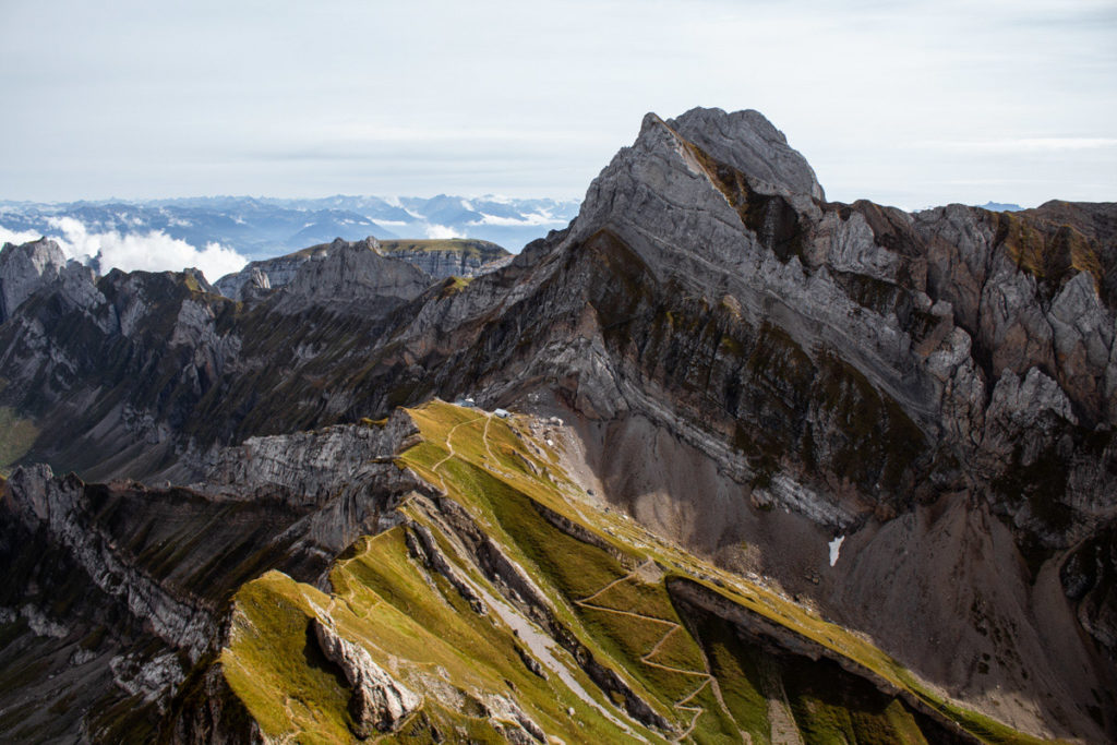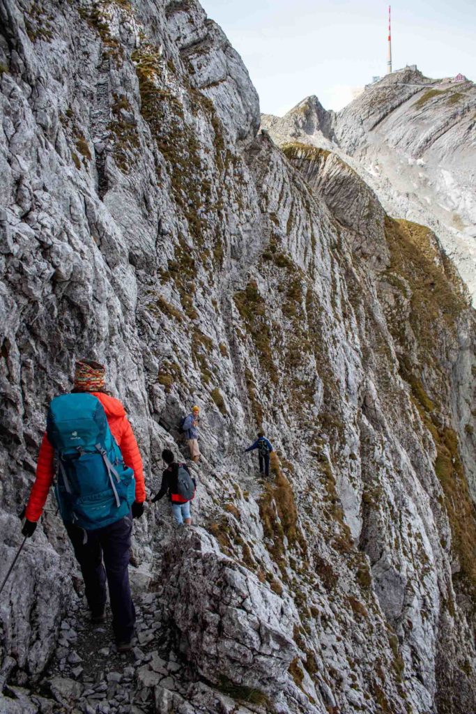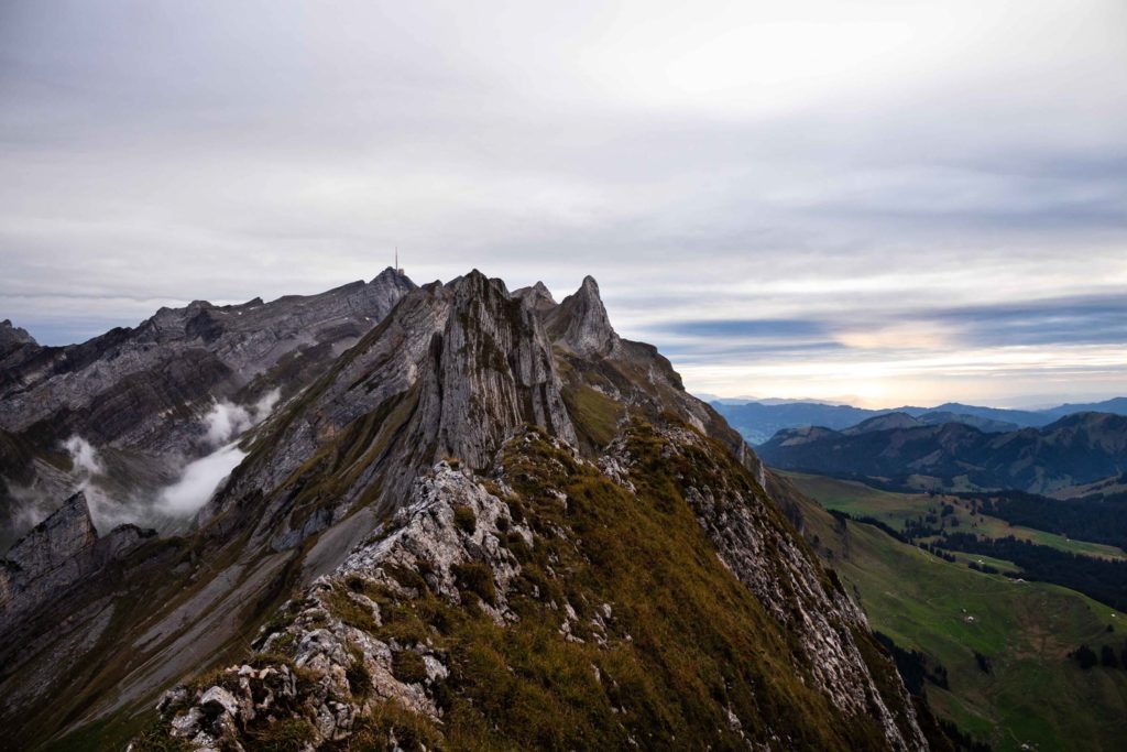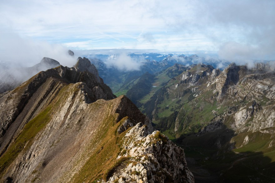In the morning we woke up to thick fog, that gently lifted up as we got ready to leave. In front of us was the giant wall of Altmann. The path took us directly up to a saddle point, another 1000 feet above the hut. This was the start of the rocky traverse. The closer we approached the next trail signage, the clearer I could see the knife-edge ridge. I could not tell how the path continued, but it had better not be the one with 1000-foot drop offs. At Altmannsattel, we were completely mesmerized by what laid around us, the hut below, the ridge line in front of us, and the next peak Säntis, another valley away.