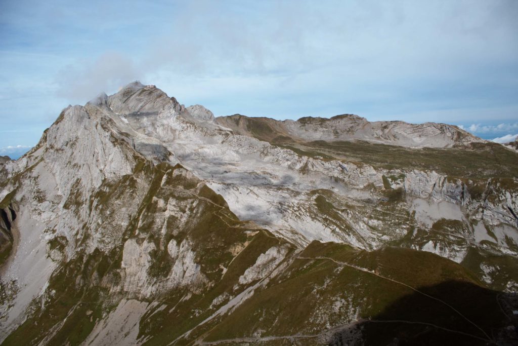 At the next mountain saddle, Rotsteinpass, we took a short snack break. We could already see the treacherous trail up to Säntis. Begrudgingly having lost so much elevation during the via ferrata section, we climbed up once again another 1300 feet. Truly, this was a ridge line hike, where you could see far on both sides of the ridge. The beautiful bright green grass made for a pleasant hike and a refreshing color from the stark grey and brown rock. The views were spectacular, but we quickly got more uncomfortable. The further up we went, the windier it got. Definitely helped to bring layers, but one of our hikers had only brought a sweatshirt and shorts – brrrr.