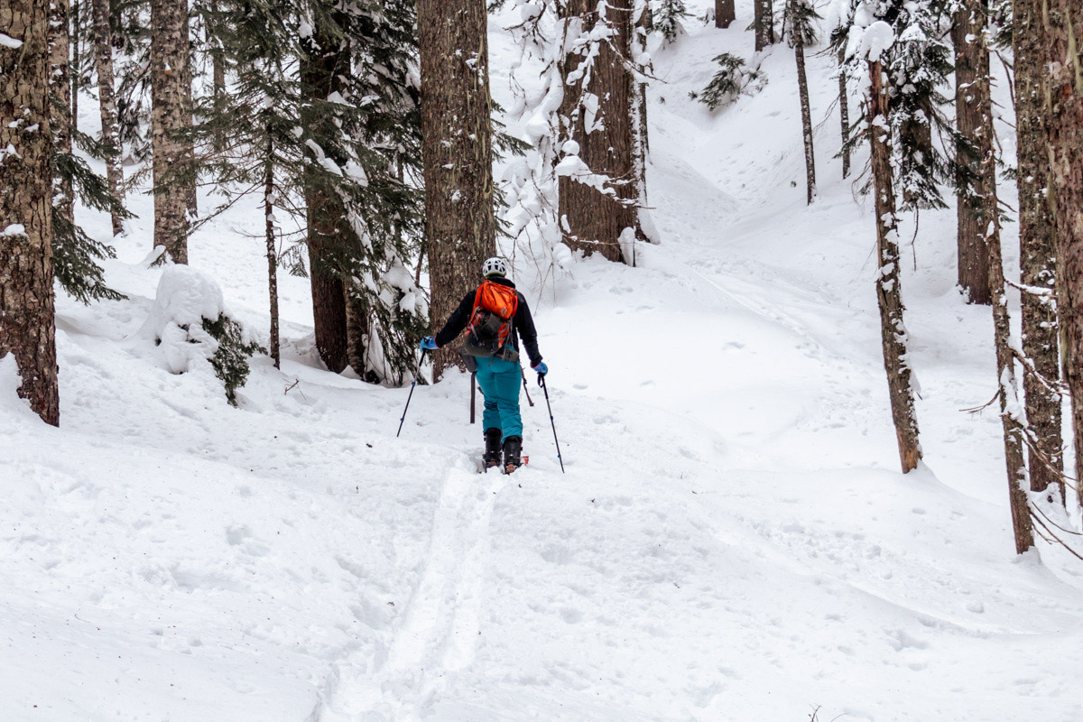 There are unofficial rules about setting a skin track. You want to go up safely but also don’t want to track out where you want to ski (mostly for the enjoyment). Likewise, don’t ski on top of a skin track when possible. Although impractical to take up the whole slope, sometimes it’s more efficient to traverse a longer distance before a switch back. This is because turns require more time and unless everyone is super efficient, it’ll be overall slower. For the first person, you might feel that you can set a steep skin track and have perfect skin contact to the snow. But for everyone else following, it’ll become more slick and more difficult to stay on the track. So start by setting a slightly less inclined than what you can comfortably do. Look ahead and see what obstacles (tree, cliff band…) you’ll need to navigate so your track can point under or over it or give yourself enough space to make a turn. There is an art to setting skin tracks, and although you’re not required to, it’s super pleasing to set a neat skin track.