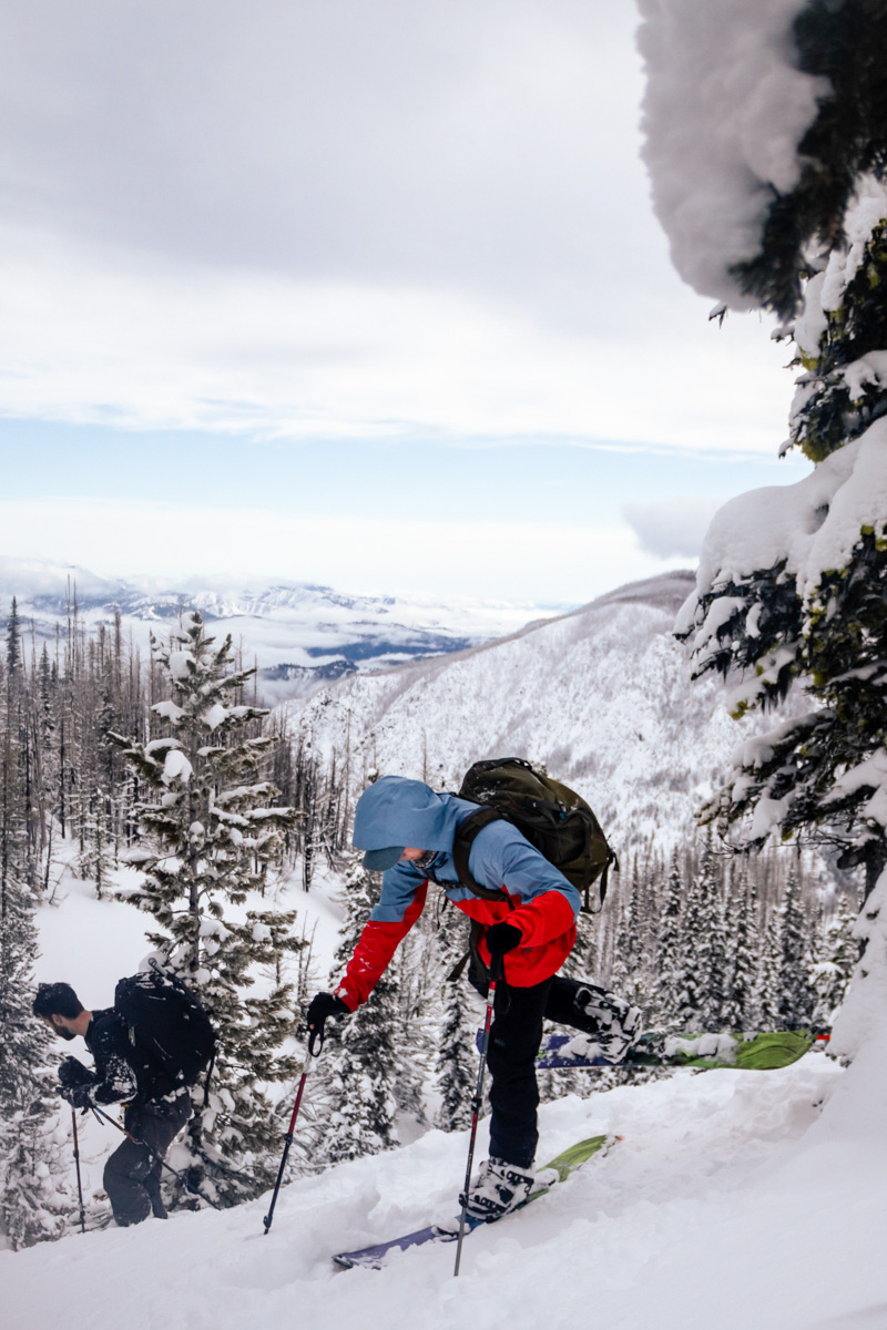 This is always an issue for beginners and even advanced ski tourers. Like my friend once said, it’s all about the balance. Unlike hiking, you actually want to lean back into your heels as you go up steep tracks. This is so your weight can push down the middle of your ski so the skin will stick properly to the ski. Before beginning a steep slope, test it out. Try leaning forward and then leaning backwards. Forwards will cause slipping and backwards, it’ll stick amazingly. Whenever you start slipping, reset and feel your weight under your heel before continuing again. One trick people like to use is to keep the poles a little behind you for extra support and to remind you to have your chest up instead of leaning forward too much. If all else fails, use trees branches to help pull yourself up or set a new skin track to meet up with the existing one. It happens all the time!