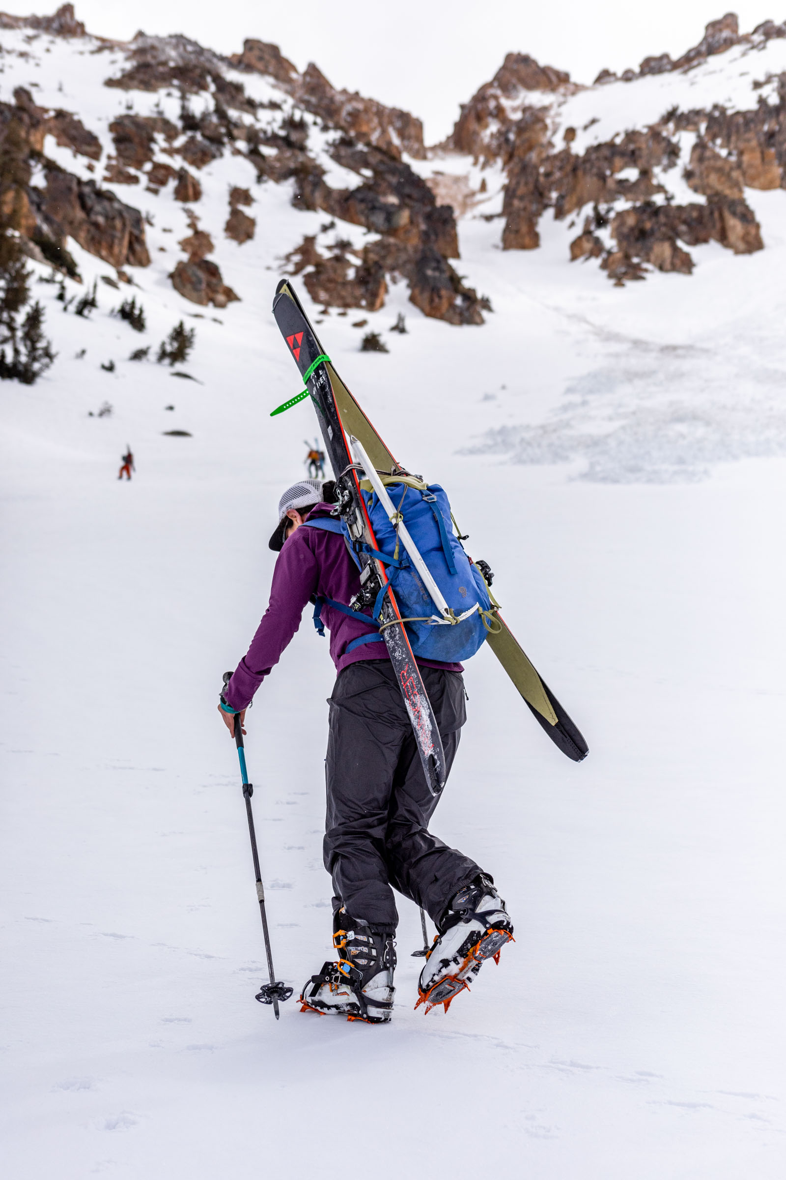 If snow is firm, you may benefit from booting and carrying skis on your pack. Then you can go straight up the mountain without traversing. If it’s firm but you post hole when booting, then skinning with ski crampons might be the way to go. The skis help you stay on top of the crusty layer and your ski crampons can help grab the ice. You can also try ski crampons on other icy terrain. But generally you’ll probably want to go straight to crampons on boots and an ice axe in hand.