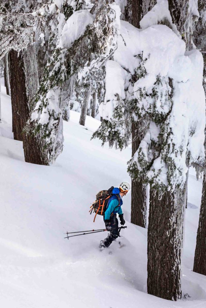 This can be scary for many people. You can’t lean forward because your heels are still unlocked and you’d fall on your face if you do lean forward. But it doesn’t mean you must sit in the backseat and lean back a lot. Again, this is about balance. It’s possible to sideslip while skinning and pizza turns are okay here too! Use all you can to get down and take it easy because you don’t have as much control with skins on and heels unlocked.