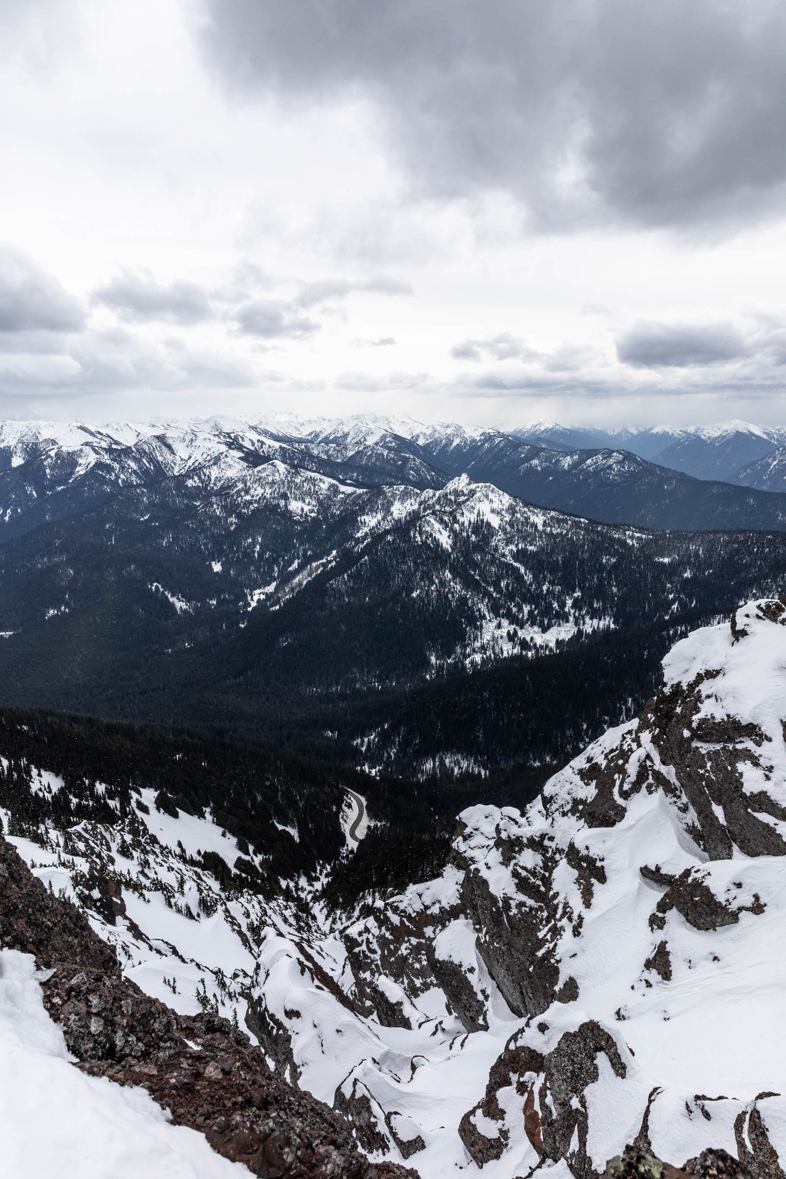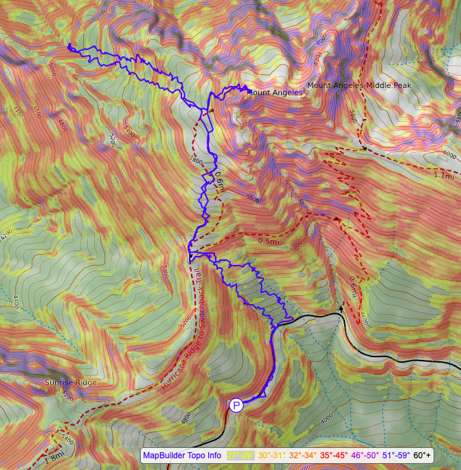 I lead most of the way up, setting a nice mellow skin track. If you were to zoom in on the tracks, you could see where that happens – from going straight up the mountain to the mellow back and forth. Great kick turn practice for everyone! We continued up past our old skin tracks and up towards the summit of Mount Angeles. I was doubtful that we could easily cross the ridge. I’ve been burned one too many times with winter ridges and ridges in the Olympics. To me, this combination of both meant pokey rocks that create impasse. We started booting up the last pitch of steep 40 degree snow. But when we peered over the ridge, we realized that it required very good technical skiing skills (i.e. jump turns) or down climbing steep snow, which was no bueno for me without an ice axe. The other methods we considered were equally unappetizing. So after a restful ridge top break and scouting, we called it a day for heading straight back to the car so we had enough time to get out before the national park gates closed on us.
