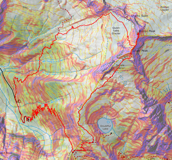 - Route: Clockwise from Boston Basin to finish on a low-grade trail to Cascade Pass. This allowed us to start with the more technical bits first.