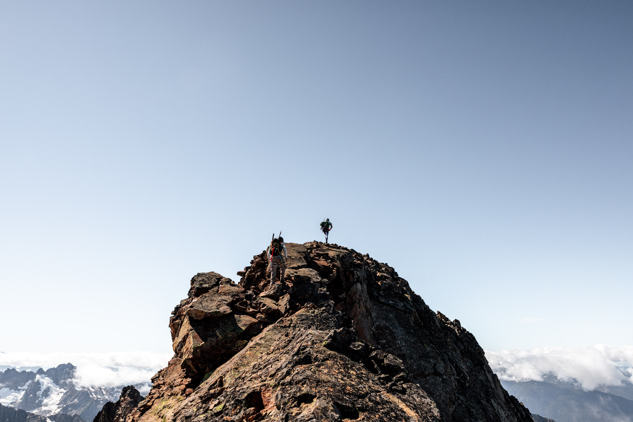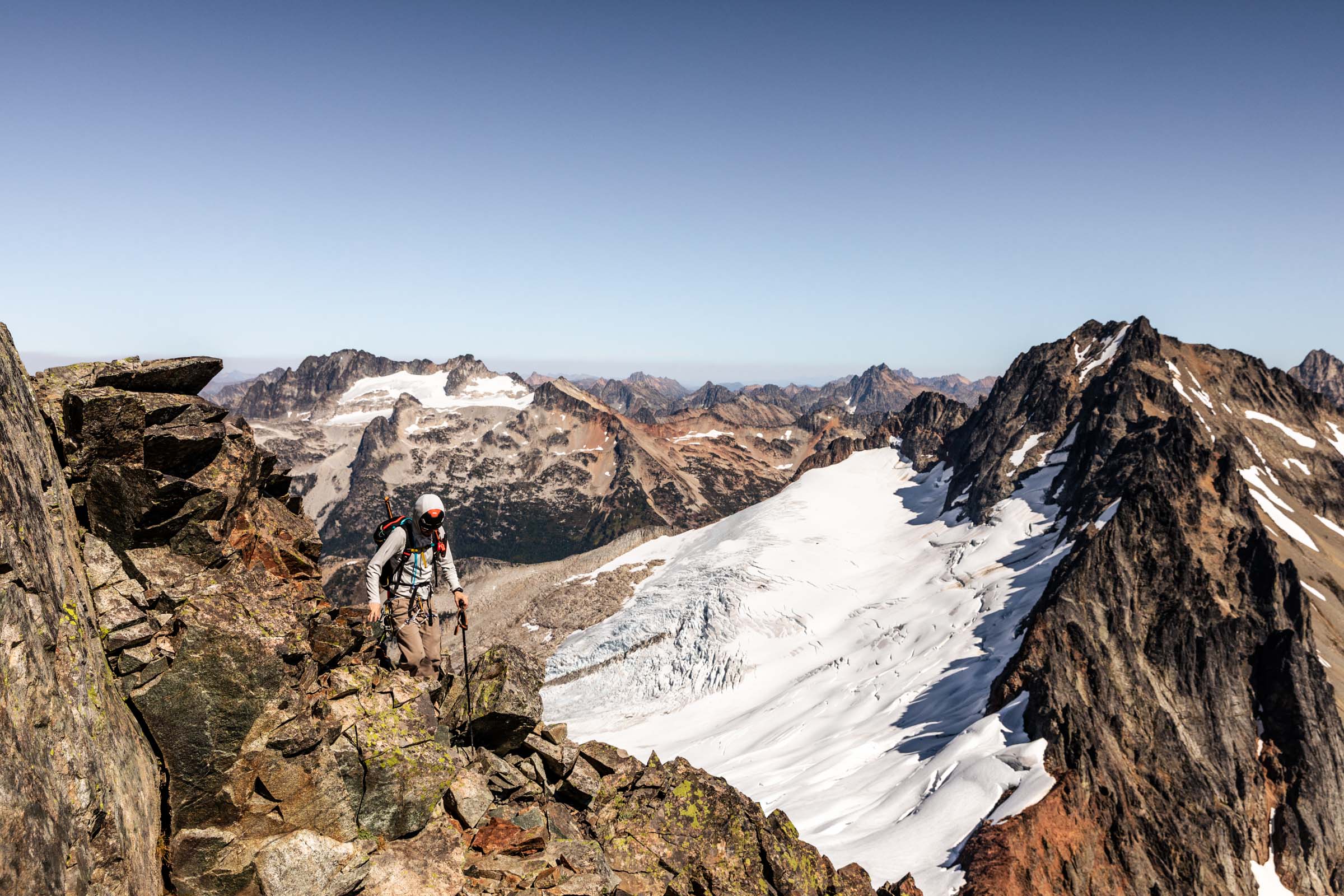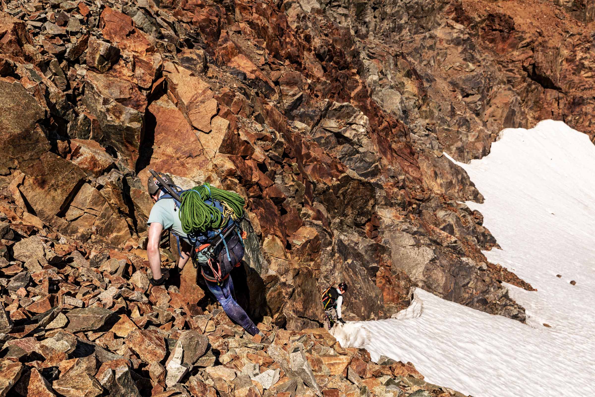 Unfortunately I can’t speak to the scramble to Sahale Peak, but it looks like a fairly straightforward corkscrew route with minimal but not non-existing exposure. It may have been faster to scramble down, but we had rope, so we decided to rappel. Which was great for me because that also meant more time on the summit for pictures. We even met Uli Steidl who’s well known for his Fastest Known Times and had just summited Eldorado earlier that day in 4.5 hours! I’m mind blown.