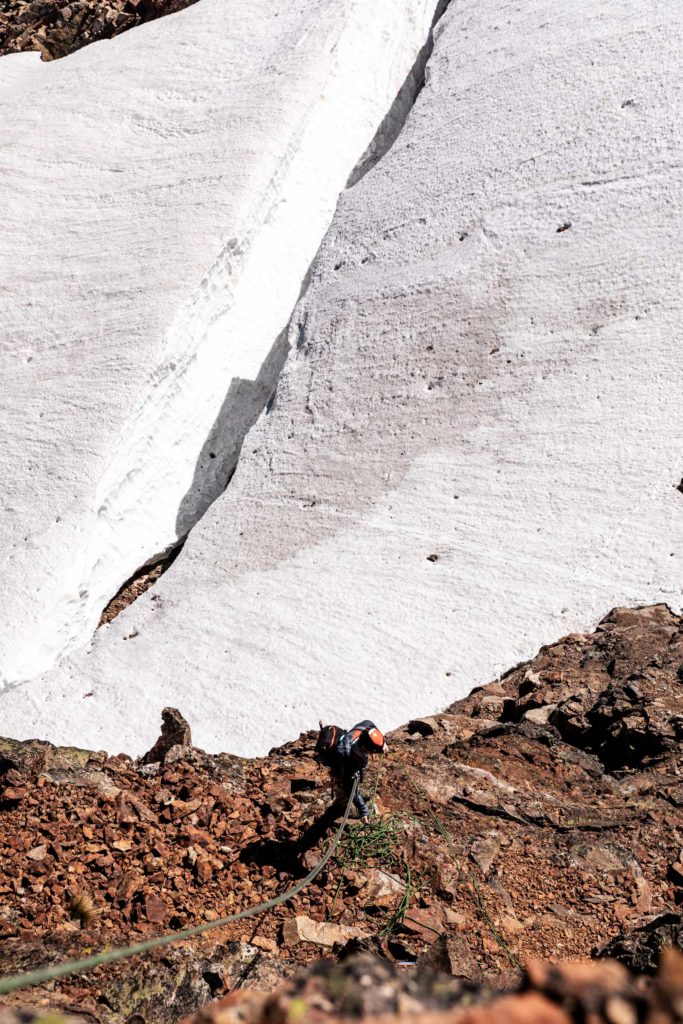 I’m very thankful for my partners because they did a lot of the heavy lifting for setting up all ropes while I snapped away with my camera. We down scrambled a couple rocks to find the first rappel station on Boston Peak, just south of the summit. The tat is easy to see from the moat as you’re coming up. Rappelling is one of my favorite things to do, and something I hadn’t done in a long while, so I was both excited to rappel for the activity itself and also for bypassing the class 4 scramble that we came up. We brought a 70 m rope, so we were able to connect the first two rappels. Pulling the rope was very tough, so I’m wouldn’t 100% recommend it. The last rappel got us right on the moat where we could simply walk on the snow without getting in and out.