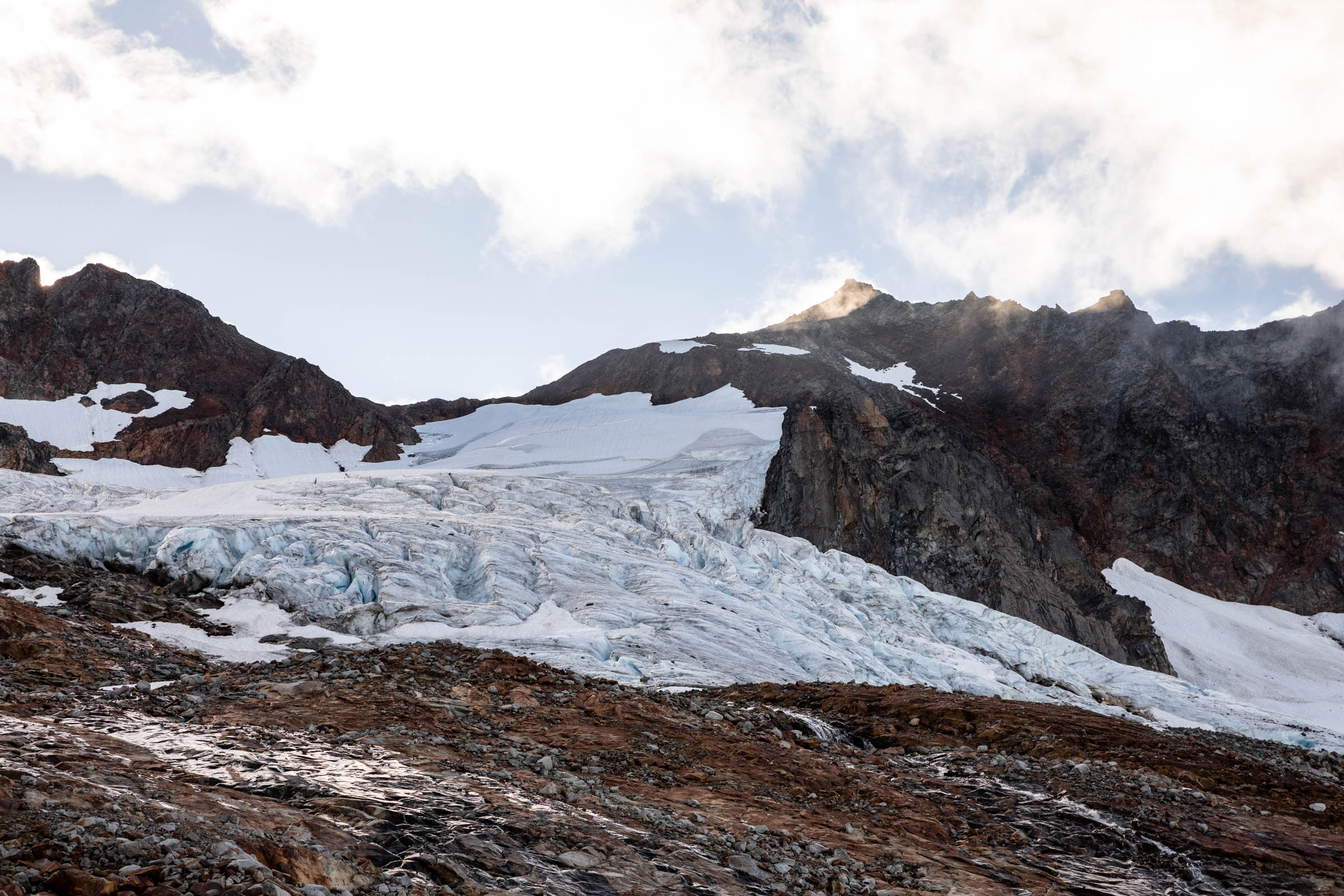 I love climbs like these because the changing terrains break up the climbs into bite sized pieces of only 1000-1500 ft at a time. This next section was a free for all easy “scramble” or walk up rocks all the way to the start of the glacier. We kept taking so many breaks. Not because we were tired (maybe I was haha), but because the views were just so good we couldn’t stop taking pictures.