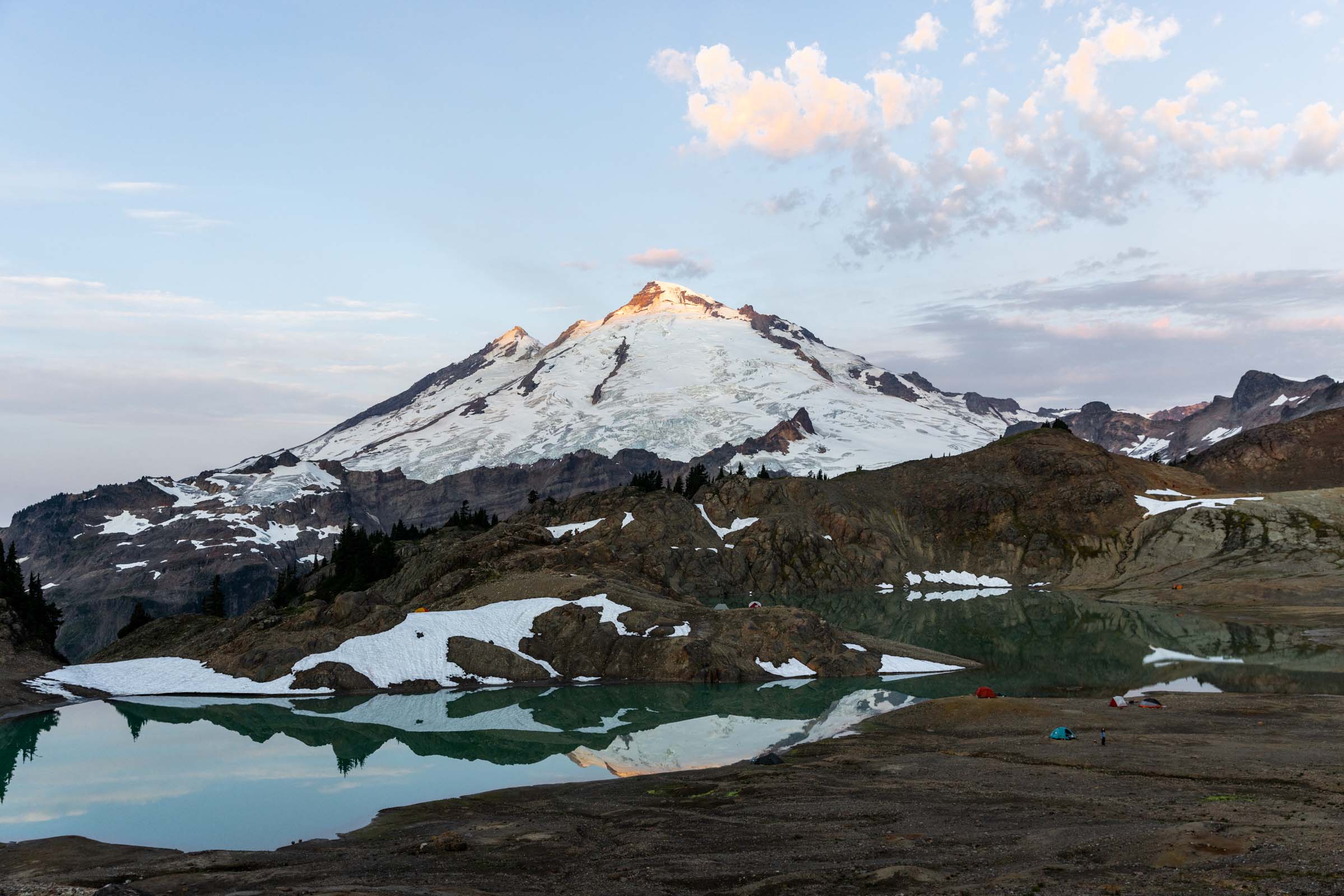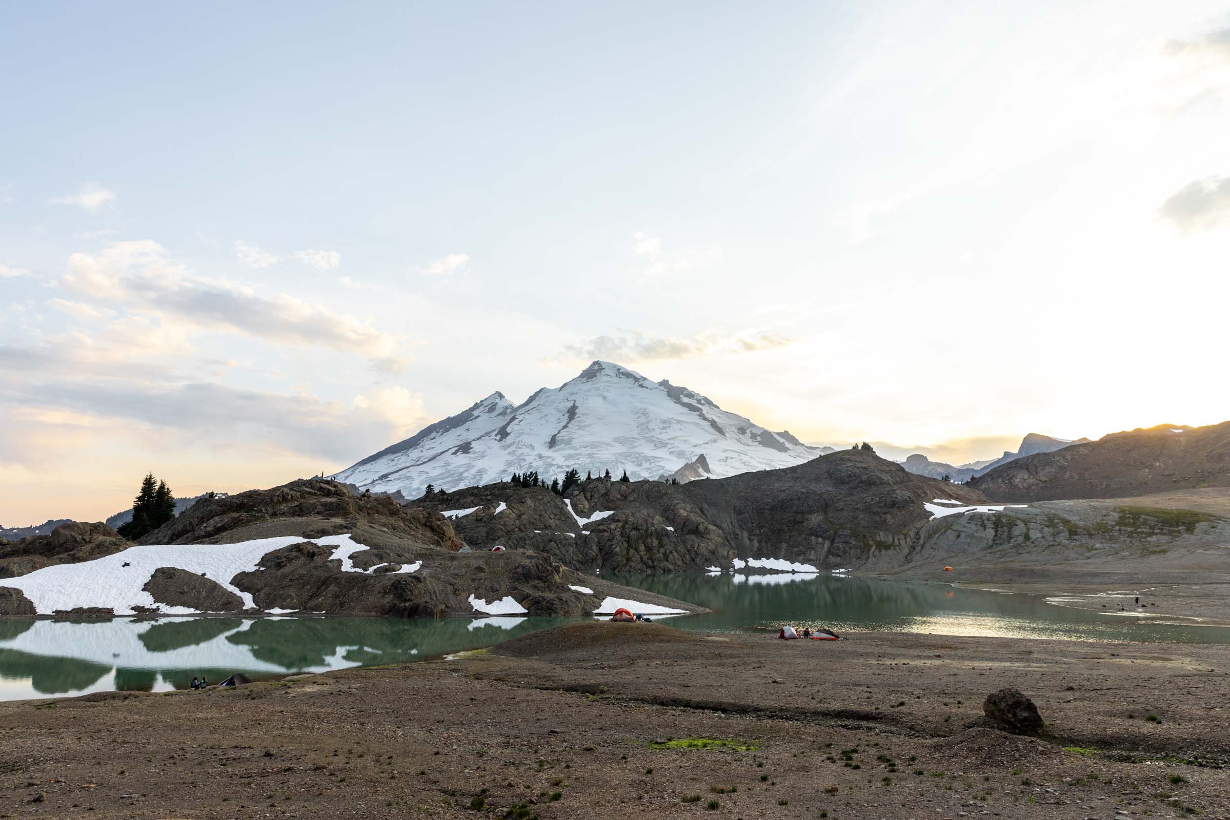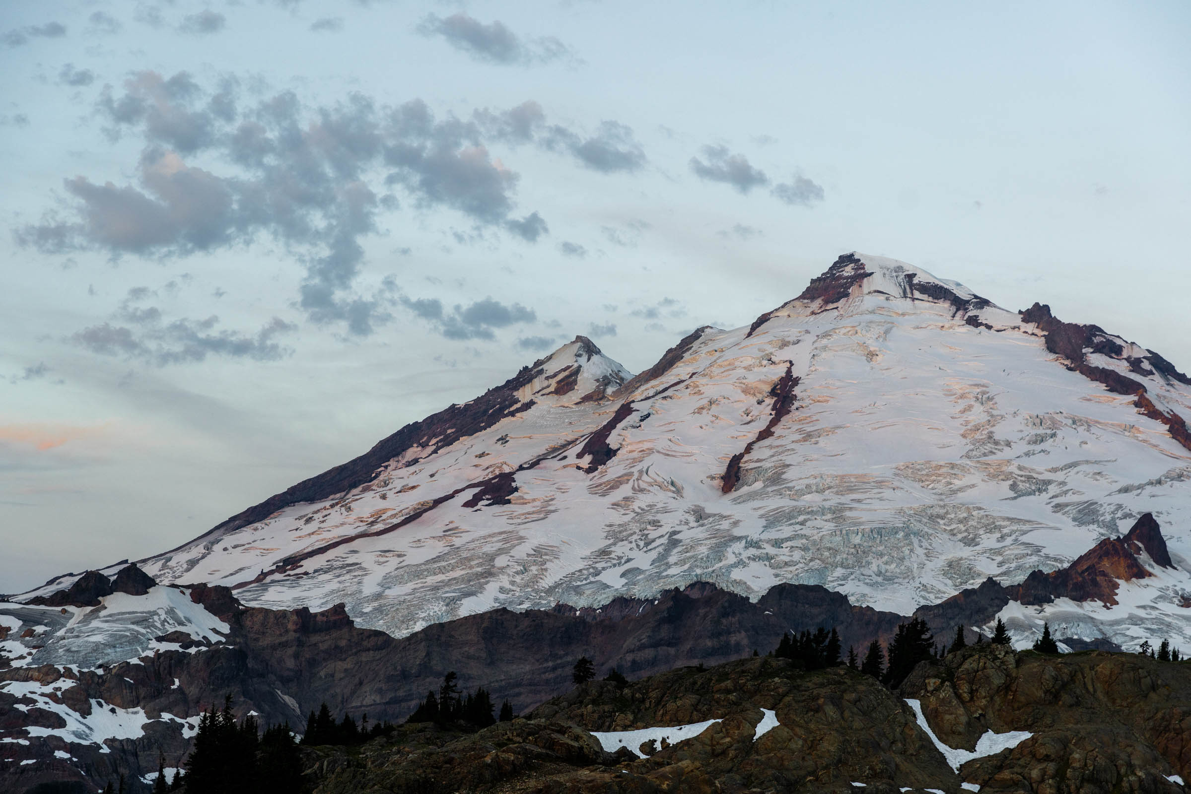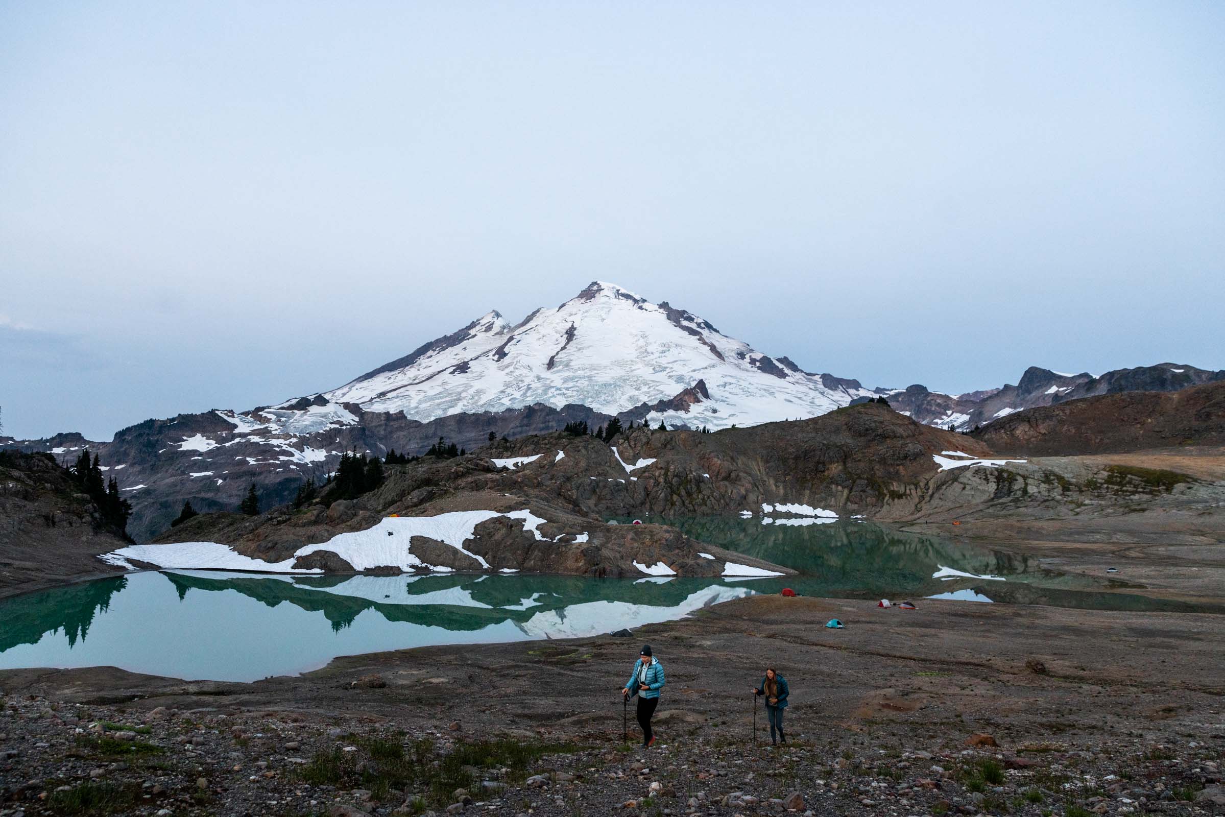 To our dismay, some low hanging clouds on the horizon for both sunrise and sunset prevented us from seeing a mind-blowing alpenglow on both mountains. Maybe next time! No matter, it was still so cool to be this close to the beautiful glaciers of Kulshan (Baker). We took our time back at camp to eat breakfast and pack up to go. I feel like we must have been one of the first groups to leave the area, though plenty of people were already hiking from the trailhead or returning from Camp Kiser.