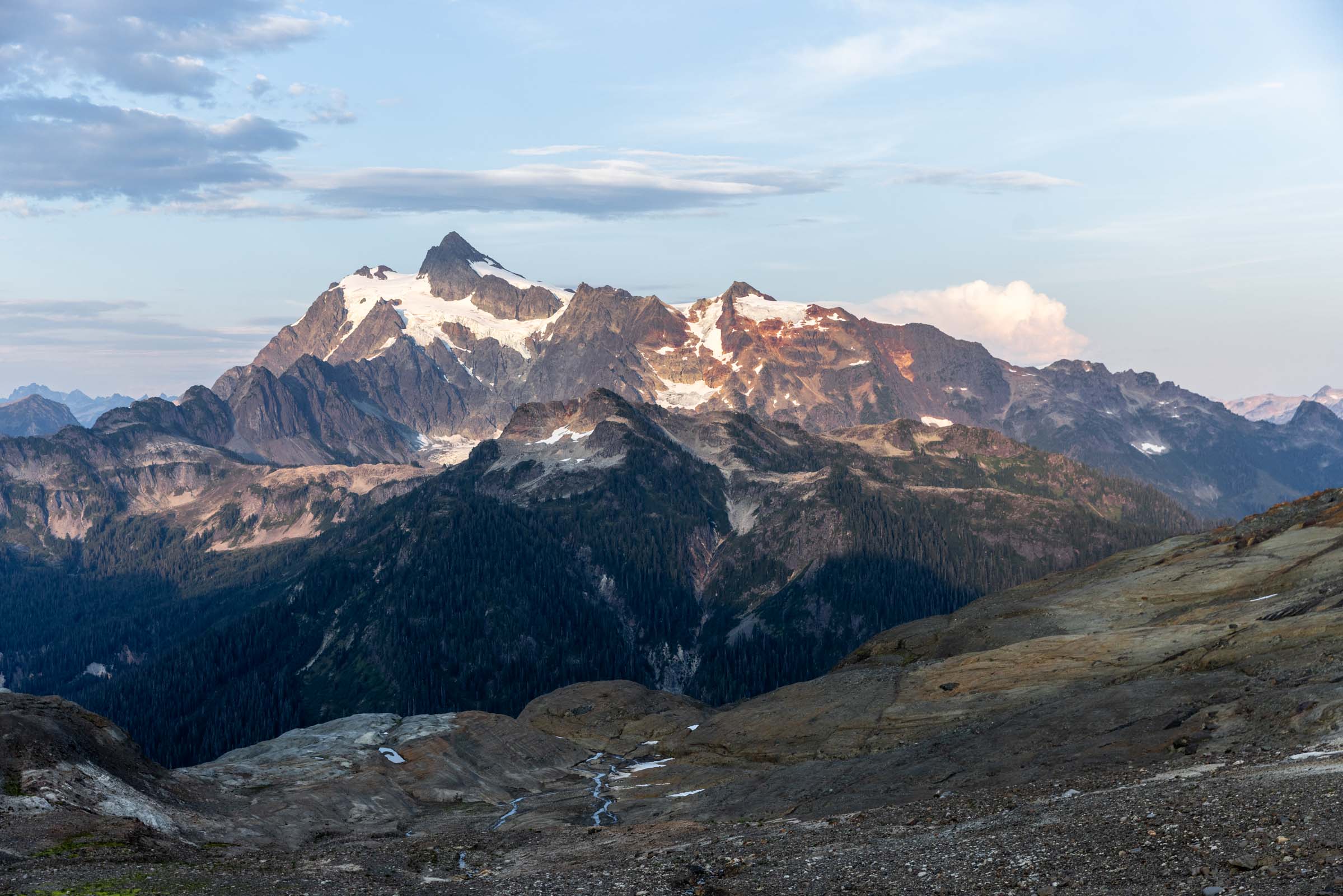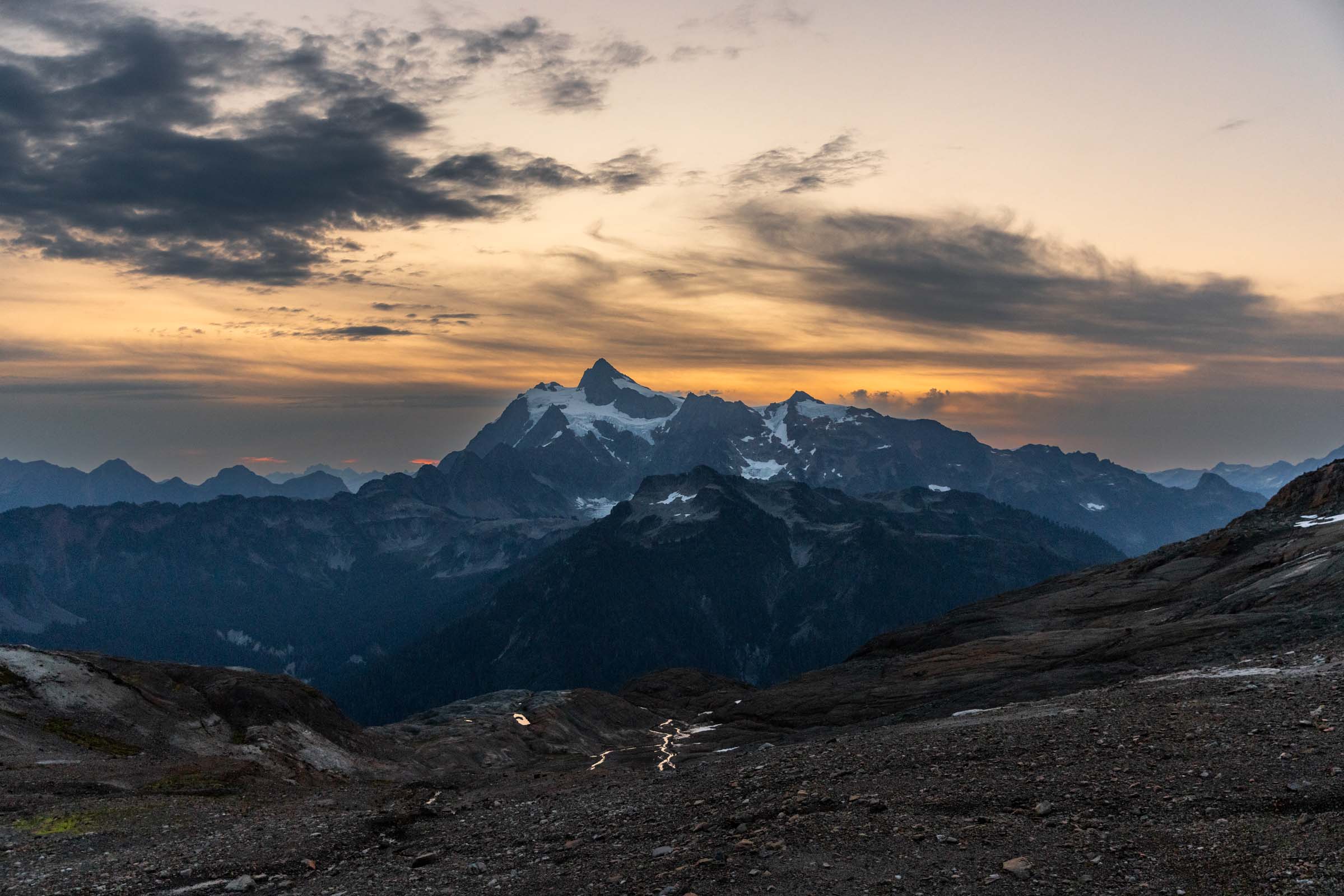 We took our time to make dinner, my first time in a really long time for Mountain House freeze dried and I’m happy to say it was good! Not terribly more expensive than creating my own meal for something that’s tasty instead of my usual mac and cheese, which has started to get old. Once we finished dinner, we geared up for sunset on the ridge for views of both Mount Baker and Mount Shuksan.