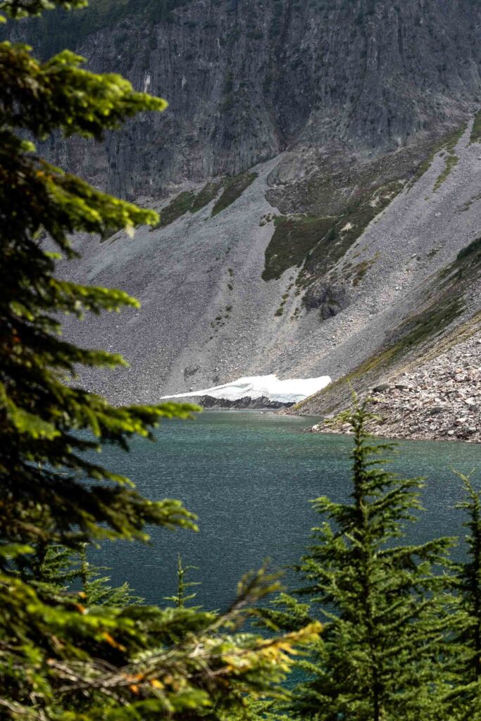 I mean with the heat and all, and stopping for blueberries, it was still a lengthy enough hike, but I loved not being pressed to hike faster. Just able to enjoy the trail and good company. As we rounded the corner of the trail under the Coleman Pinnacle, we saw the first glimpse of Goat Lake. It’s somehow not labeled anywhere but it’s quite obvious from the trail, so I see why it’s easy for people to hike the side trail.