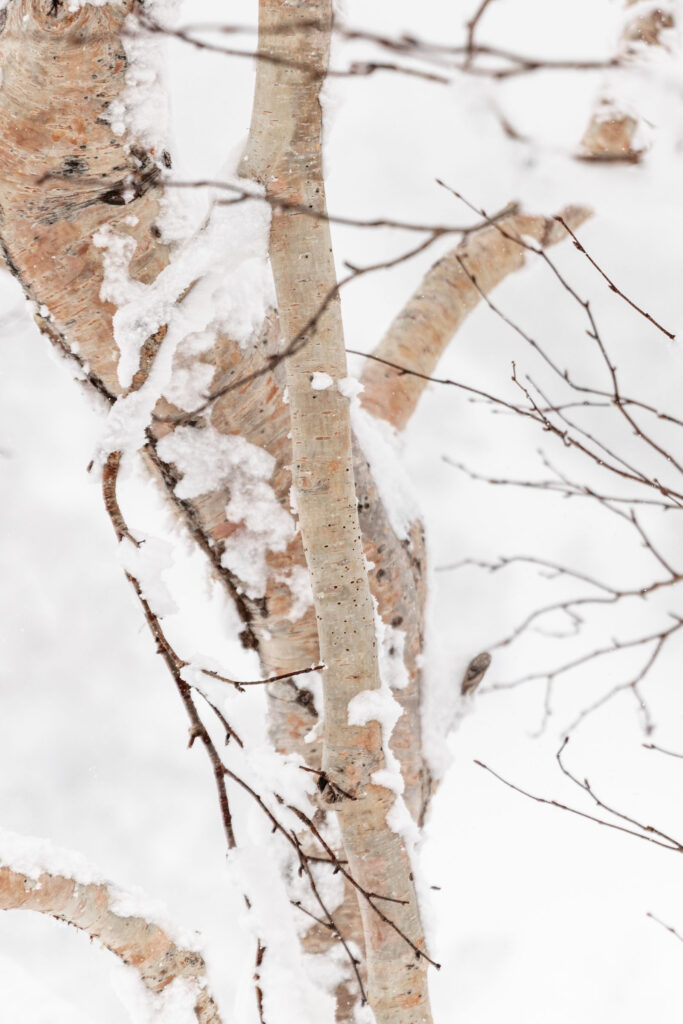 As I was ready to call it quits, we reconsidered our original plan to head up Kaun Bowl. The snow seemed better, we could follow the trees instead of being in a total white out. That seemed promising! So we kept breaking our own trail. Shout out to the convenience store onigiris for keeping us well fed.