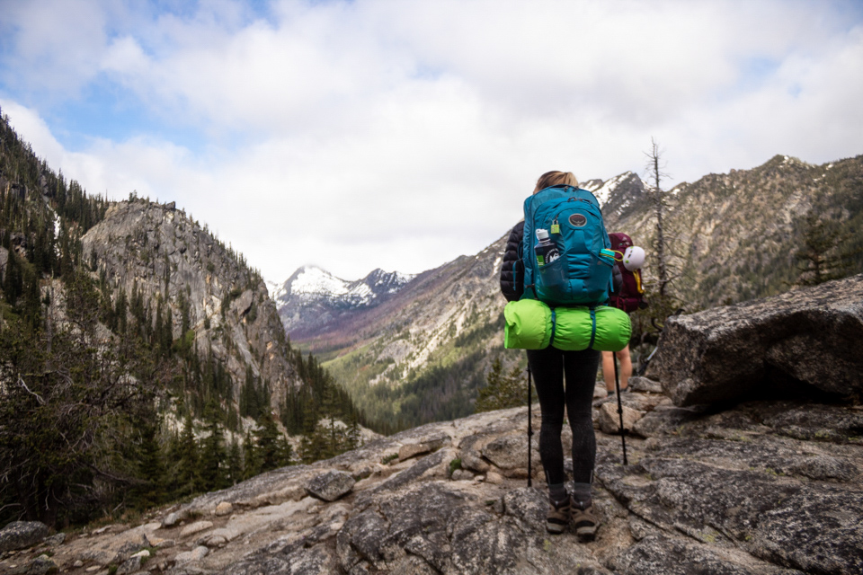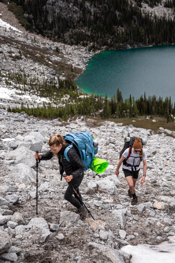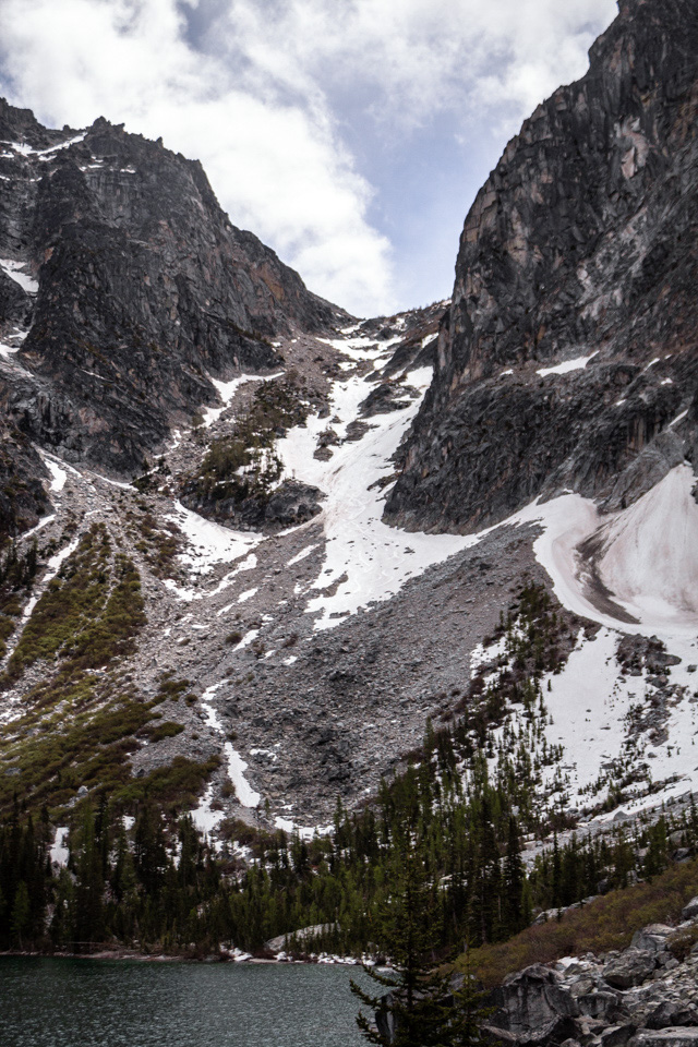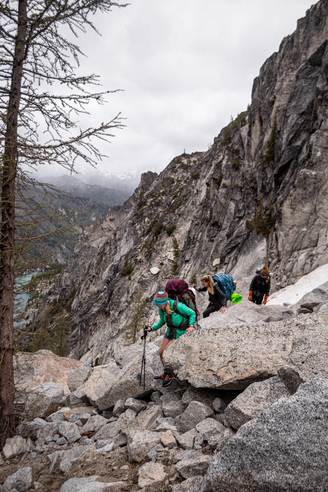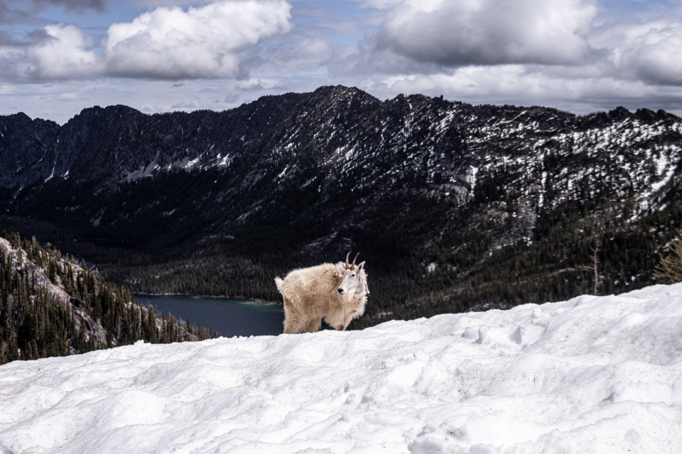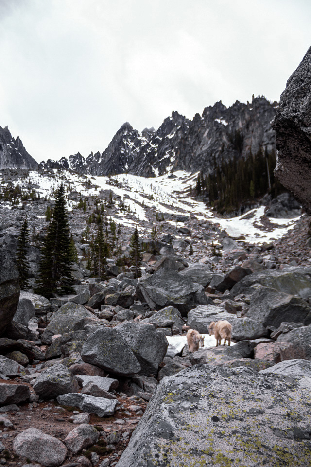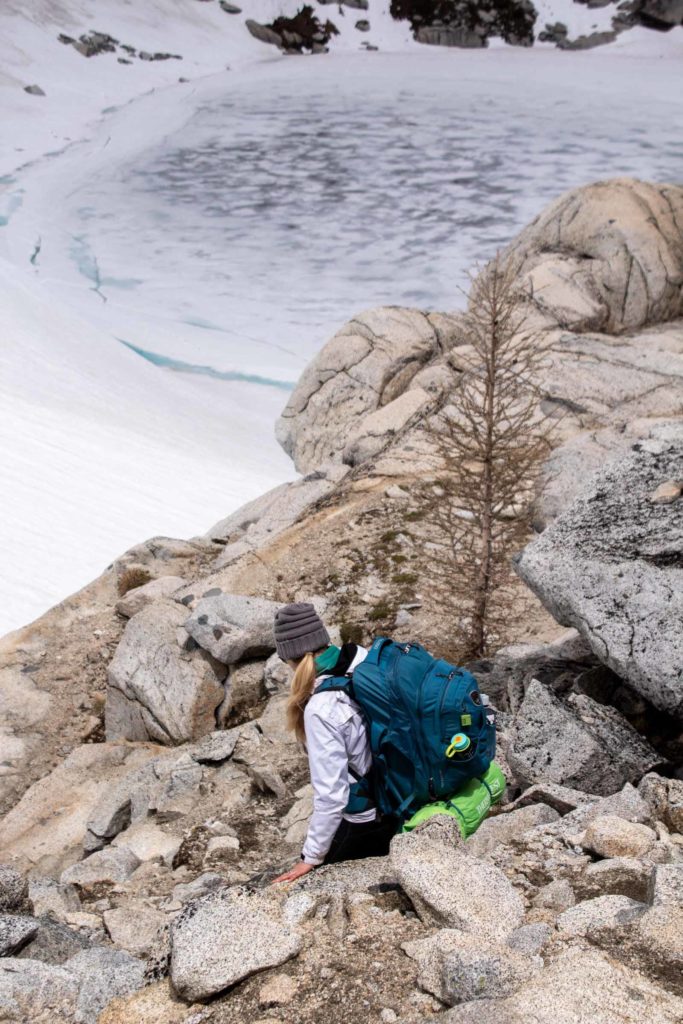 After a nice long break to soak in the sun and the beauty of the lake, we needed to get going on the next 2000 ft climb up Aasgard Pass. No it’s not Asgard home to Norse gods, but yes, it can seem like a daunting endeavor. In pictures, the pass is steeper than it is in reality. It’s a steep climb, but if you think of it as a staircase climb, it’s really not so bad if you stay on route. The way around the lake to the pass goes through some boulders – to the right is Colchuck Glacier, a great place to ski. I wish our trip would have allowed that, but instead I carried the skis all the way up to Core to find snow. As we boulder hopped, we encountered our first two mountain goats who were showing signs of summer wool shedding already. Soon we passed them too and were on our way to the steep climb. Hannah was doing so awesome already for scrambling around rocks with a big pack on her back! Not an easy skill for a first time backpacker for sure.