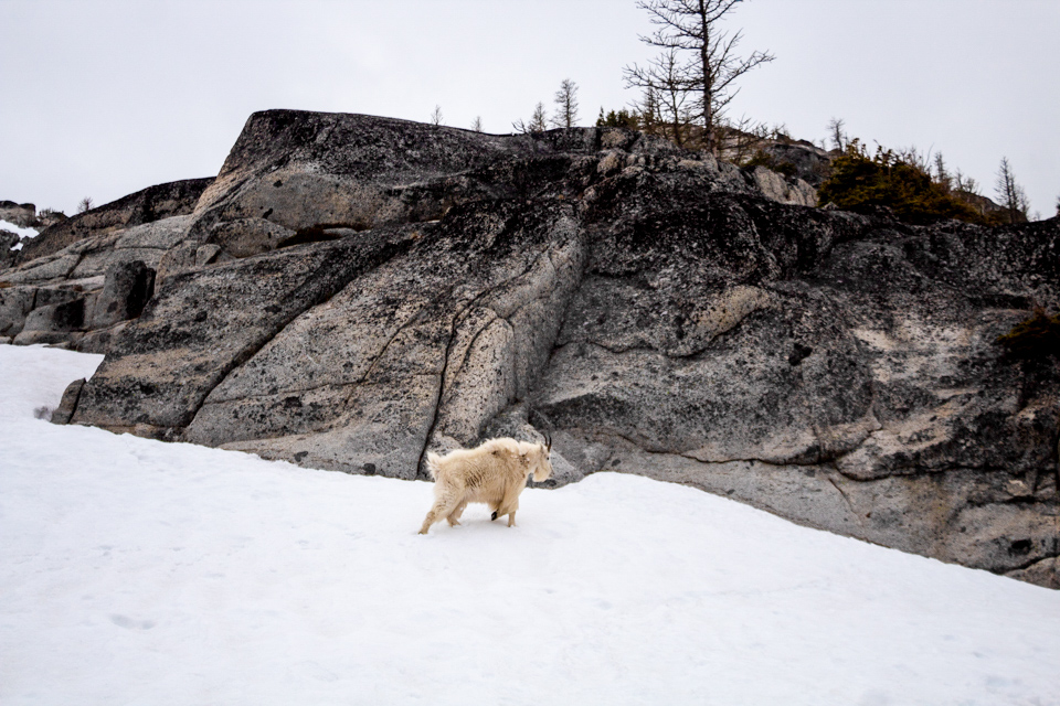 So through the rest of the Core zone we went, meeting goat #8, #9, and #10. The number of transitions I made on skis was too many to count – I still need to get quicker at getting my pin bindings aligned to my boots. We were a bit slow going for the 12 miles, but maybe half of it was slow snow travel and the other half, slow me-on-skis travel. But thank you to my friends for waiting ever so patiently! We were able to avoid some of the sketchy snow, but inadvertently followed some tracks straight on top of some ice on Lake Viviane. Oops, at least it was solid for the time being.