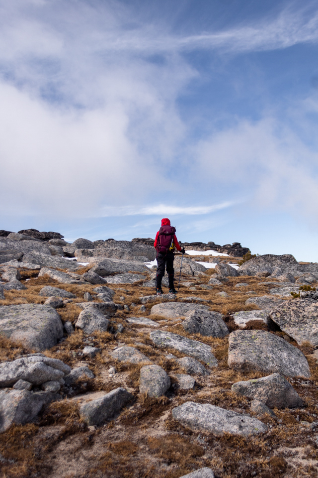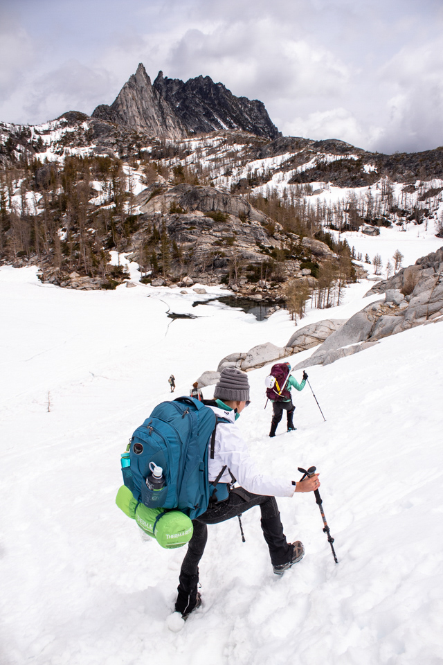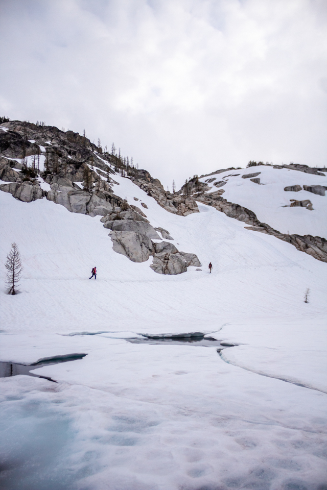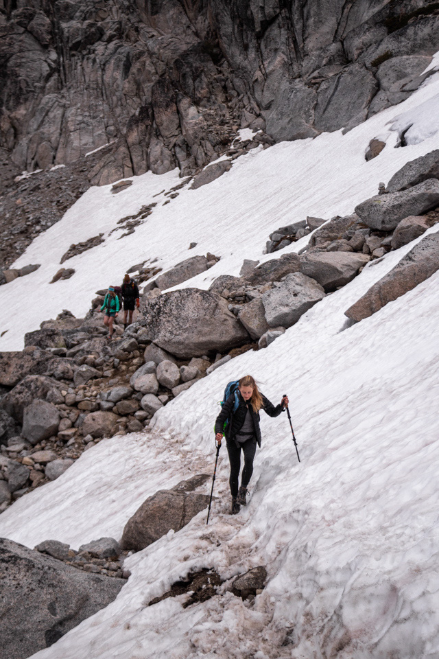 Sadly, the clouds were blowing over, obscuring many of the peaks that we wanted to climb. And it was super windy. Once we set up camp, it was much nicer to be cozy in our sleeping bags, sheltered from the intense weather. It was clear that the west cascades/Seattle was having quite the storm! And it all dissipated right around the Enchantments, clearing up the further east you looked. Props to Hannah for learning to use gaiters to keep hiking boots dry and setting up camp on snow!