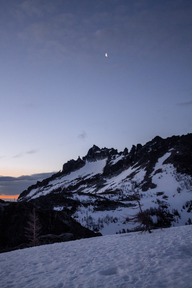 Okay, enough about how permits work and all! Let’s talk about the trip itself. We got 2 separate permits (each person can only have one enchantment permit a year so we had 2 people get 2 permits for the group), one Stuart and one Core. Colchuck permits filled up really fast, so the next best thing was Stuart. Friday night, we began our car shuttle – parking one car at the Snow Lake Trailhead and driving to the Colchuck Trailhead. Remember to put overnight parking passes in the dashboard (and NW Forest Pass if day hiking)! Most people were headed out, but we were going in – plenty of parking, especially for the reserved overnight space. We hiked in 2.5 miles to find a campsite as the sun set on Colchuck Peak. You could barely see the golden glow, but it was there! It took a little while, but we finally found pretty wide open area to camp. It’s important to only camp at pre-existing camp areas so you protect the fragile vegetation. Most maps will show designated campsites to make it easier to find.