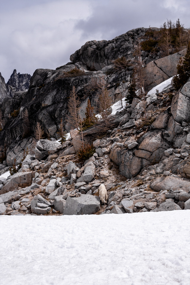 As we packed, a family of mountain goats (the 5th-6th ones) walked by. And then a guy stopped by to take his snack break. He said that he’s based in Bangkok but comes back to stay in different areas around the West Coast with his wife. Sounds like a fun life! We ended up passing each other multiple times all the way to Snow Lakes, due to him getting lost and taking pictures and us taking our time to get down different sections.