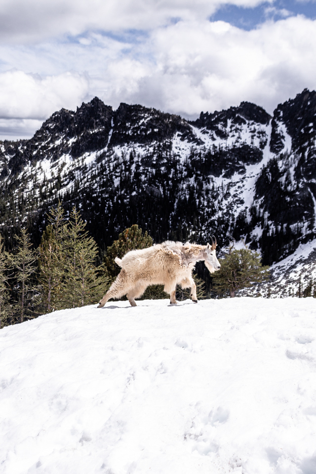 3 hours later, we found ourselves at the top of the pass and met mountain goat #3. Upon coming home, I weighed all my gear and apparently I had lugged up nearly 60 pounds of stuff! Almost half of it was gear and a good chunk was ski gear. So much effort for honestly little but quality skiing. I immediately switched to skis to decrease the weight on my back. I probably could have done without skins, but the top of Core is fairly flat so I kept them on as we continued forward to explore and find a campsite.