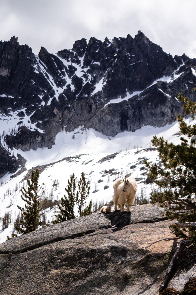 Trip reports are awesome because it helps you expect what the trail situation is like. For example, I read a couple reports claiming that snow really starts around Lake Viviane, so that’s when we took a long break to switch gears into our non-snow travel gear. And skis back on my back. We continue to walk down rock slabs and scrambling around others. Hannah was probably doing better than I was! I kept forgetting how wide my pack was with the ski boots pointing out, or how long the pack was, getting stuck on branches or hitting the skis on rocks while stepping down. When I remembered to clear the right side, I’d hit the left. Sometimes I’d remember to down climb facing the rock instead of stepping down, but then I’d turn around and hit something else. It was a struggle. But we also saw mountain goat momma #11 and little baby goat #12. The baby goat was so cute and had such bountiful energy as it bounded down the rocks. Wish I could do that effortlessly!