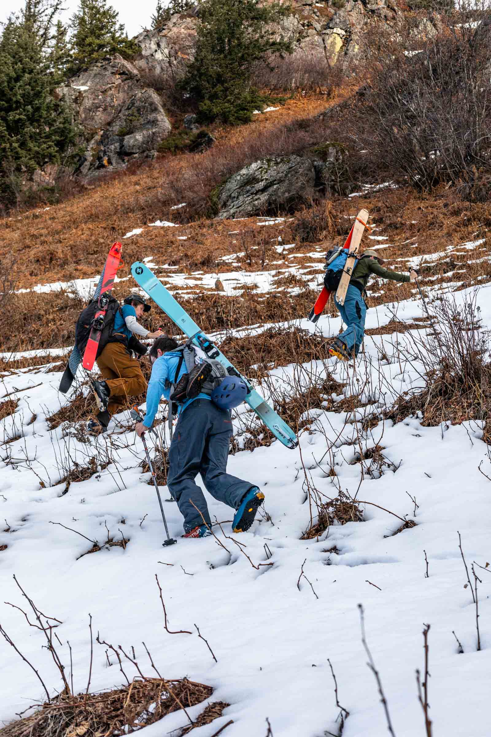 There was such little snow that I was doubtful that we could even ski anything. None of us brought quite the proper shoes to wear for the hike to get to the snow line, donning casual city boots (at least waterproof), crocs, approach shoes, and just normal shoes. But it was alright for the sunny day. Once we reached post-holing snow, we switched to ski boots so we could cut switchbacks (only okay in snow!!) and head straight up. Soon, the patchy snow became consistent and only 15 minutes or so of booting, we switched to skinning.