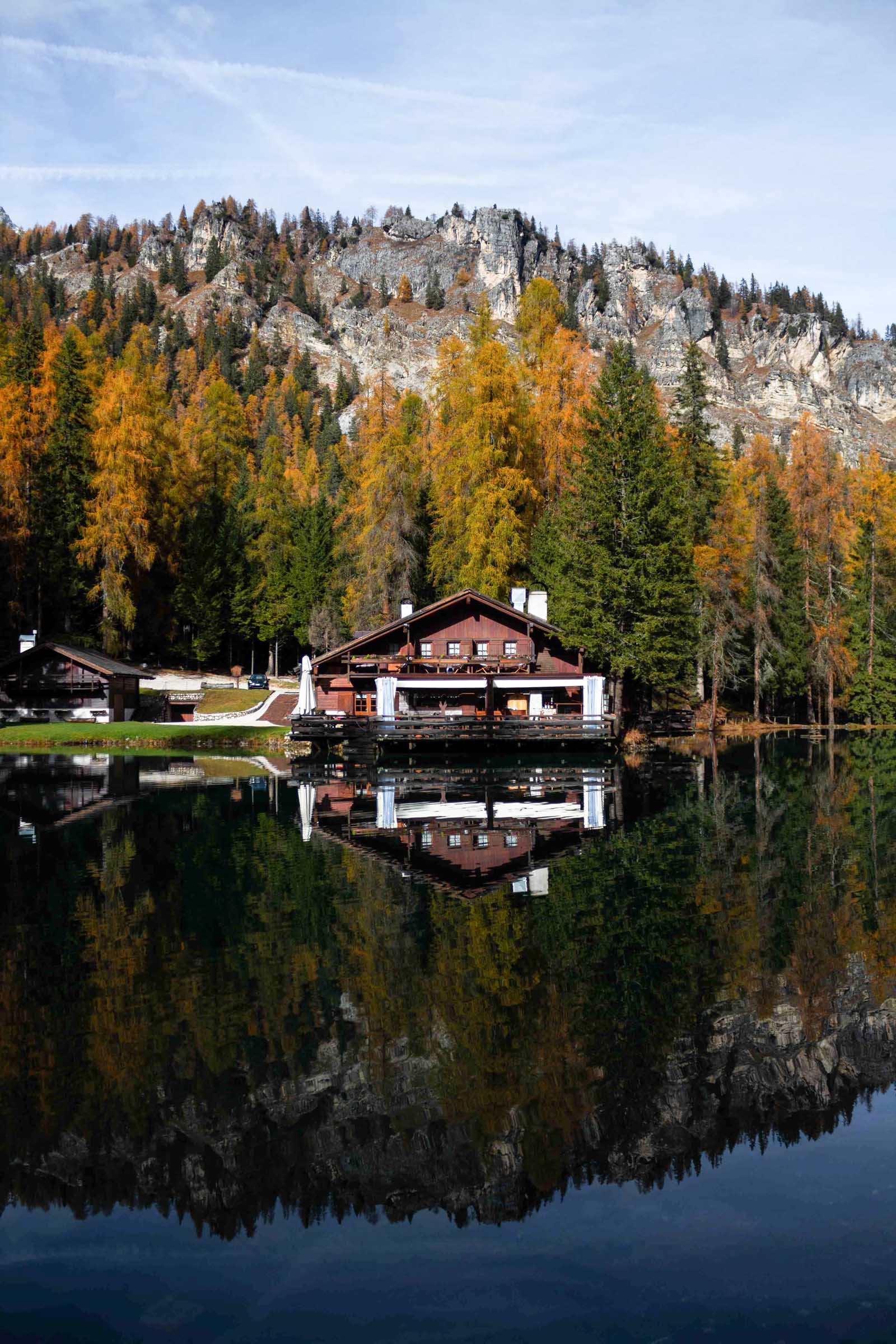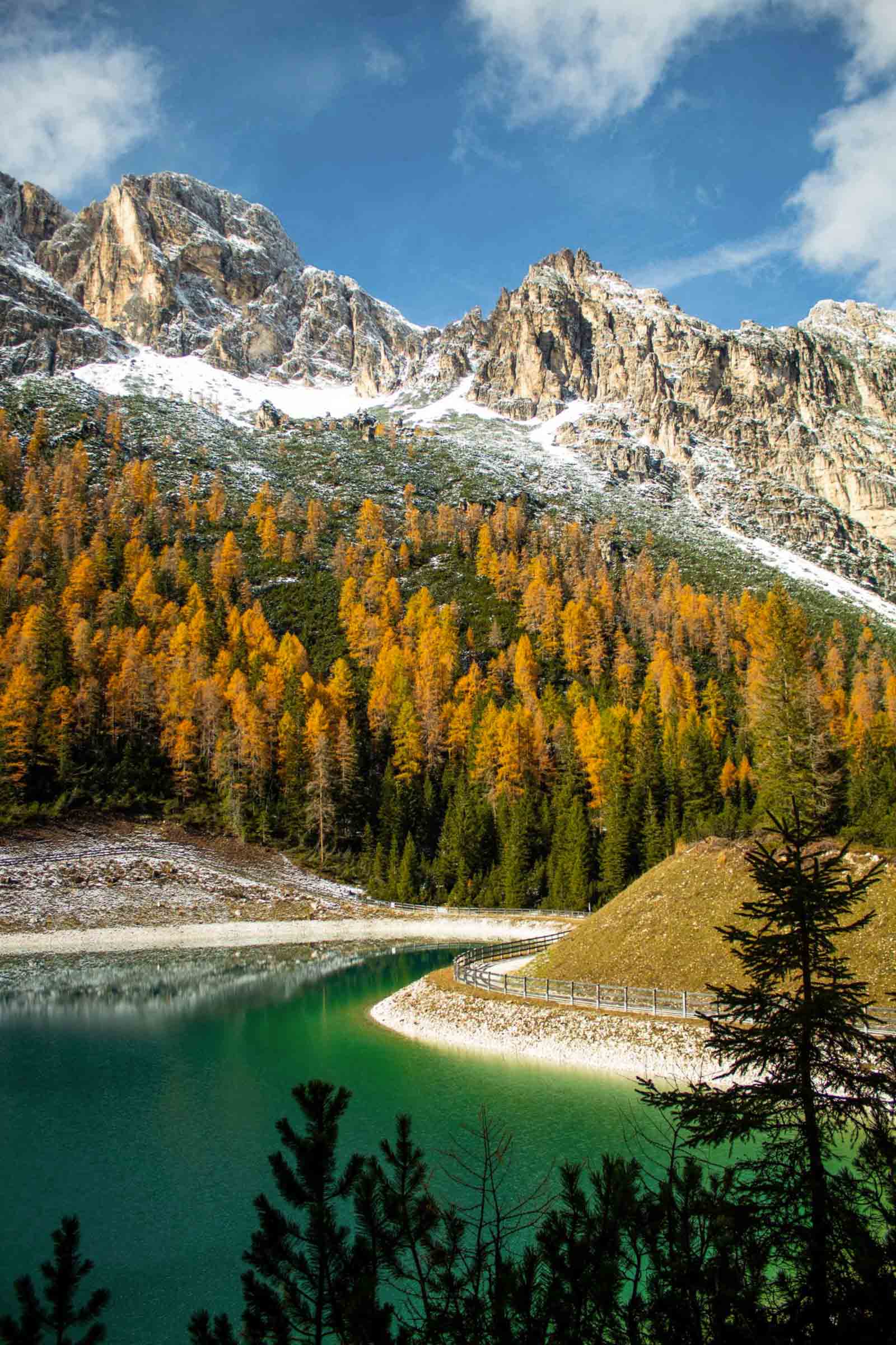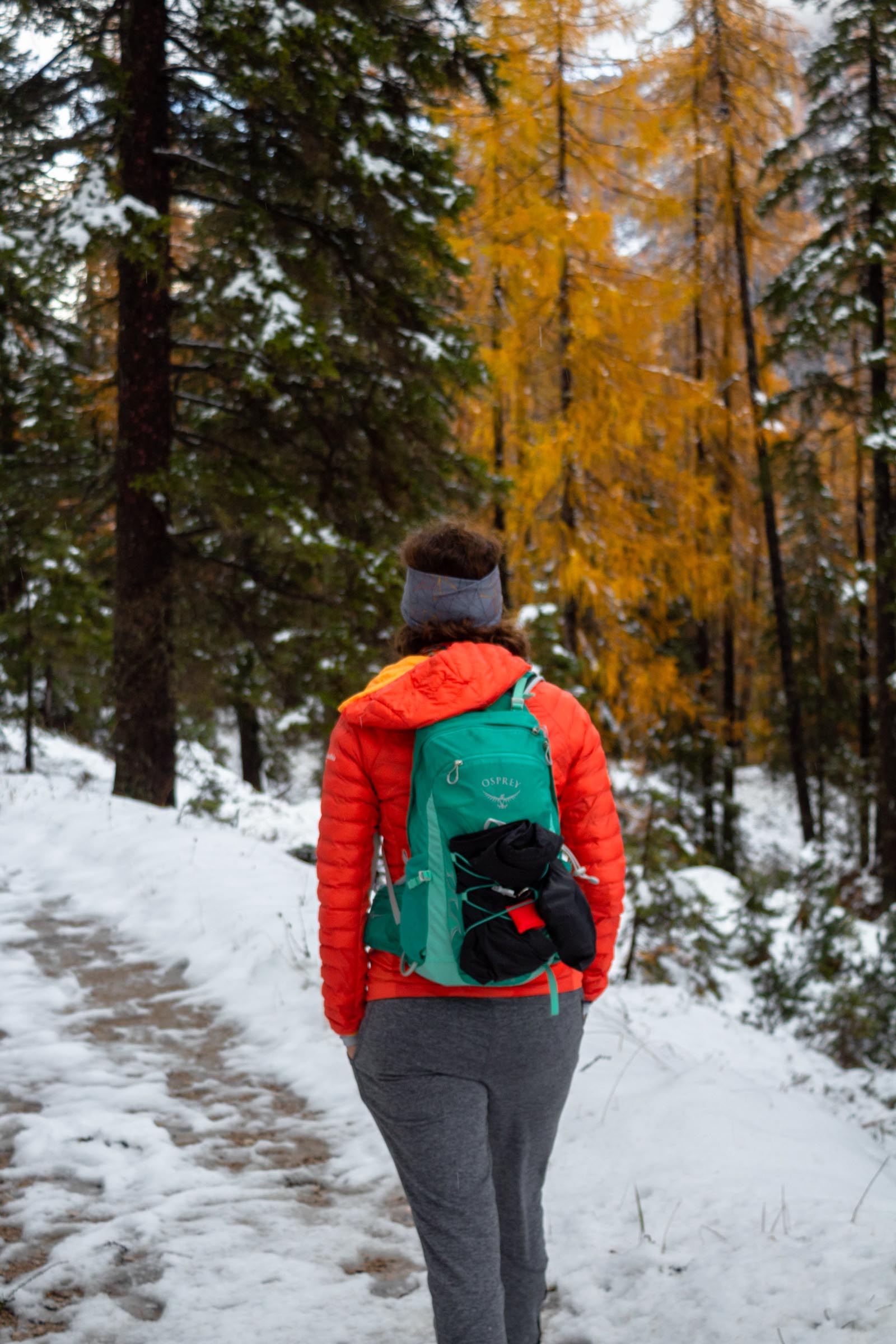 Off we went with our highlighted Cortina map of trails. Our first stop was the top of a ski lift, Col Drusciè. But to get there, we first hiked to Lago Ghedina which gave us a beautiful reflection of Tofana di Rozes against the fall color leaves. The theme of the hike was fall colors with a hint of winter snow. It was gorgeous! Everywhere along the trail, I was delighted. Little did I know that I was graced by golden larches (the very same ones I’ve been enthralled by in the PNW). We were recommended an awesome hike for an out-of-season time. We continued traversing along north and began to hit intermittent snow, which was soon unavoidable.