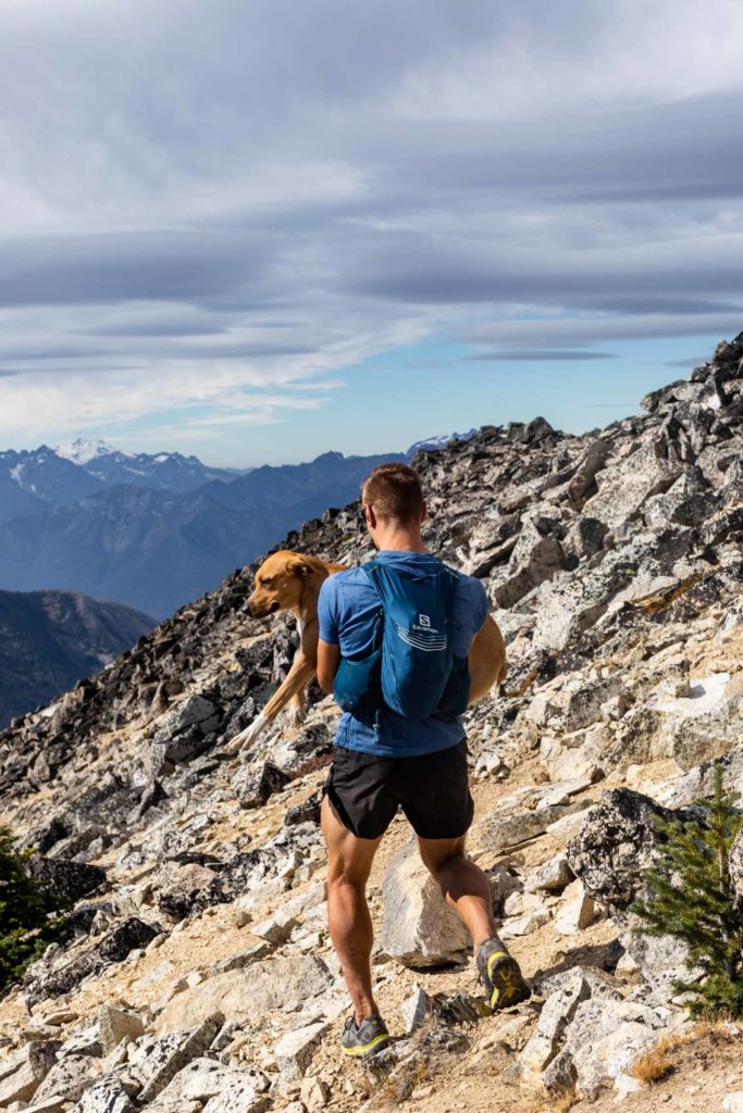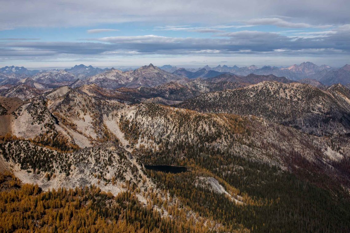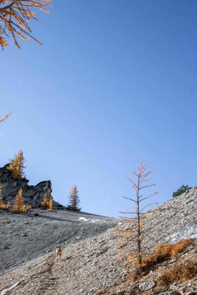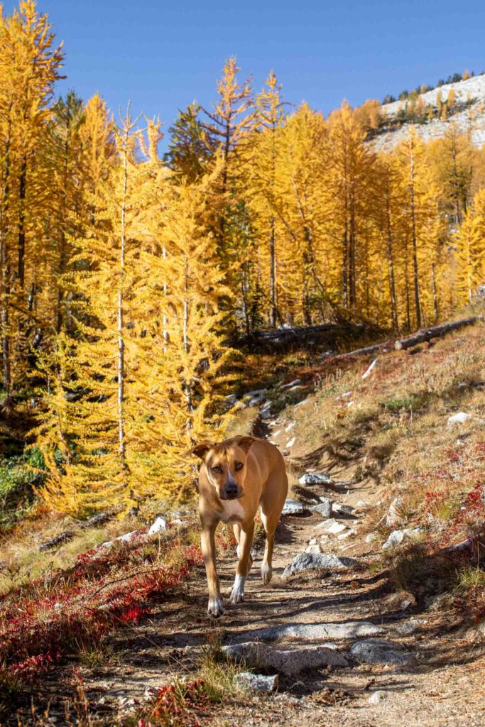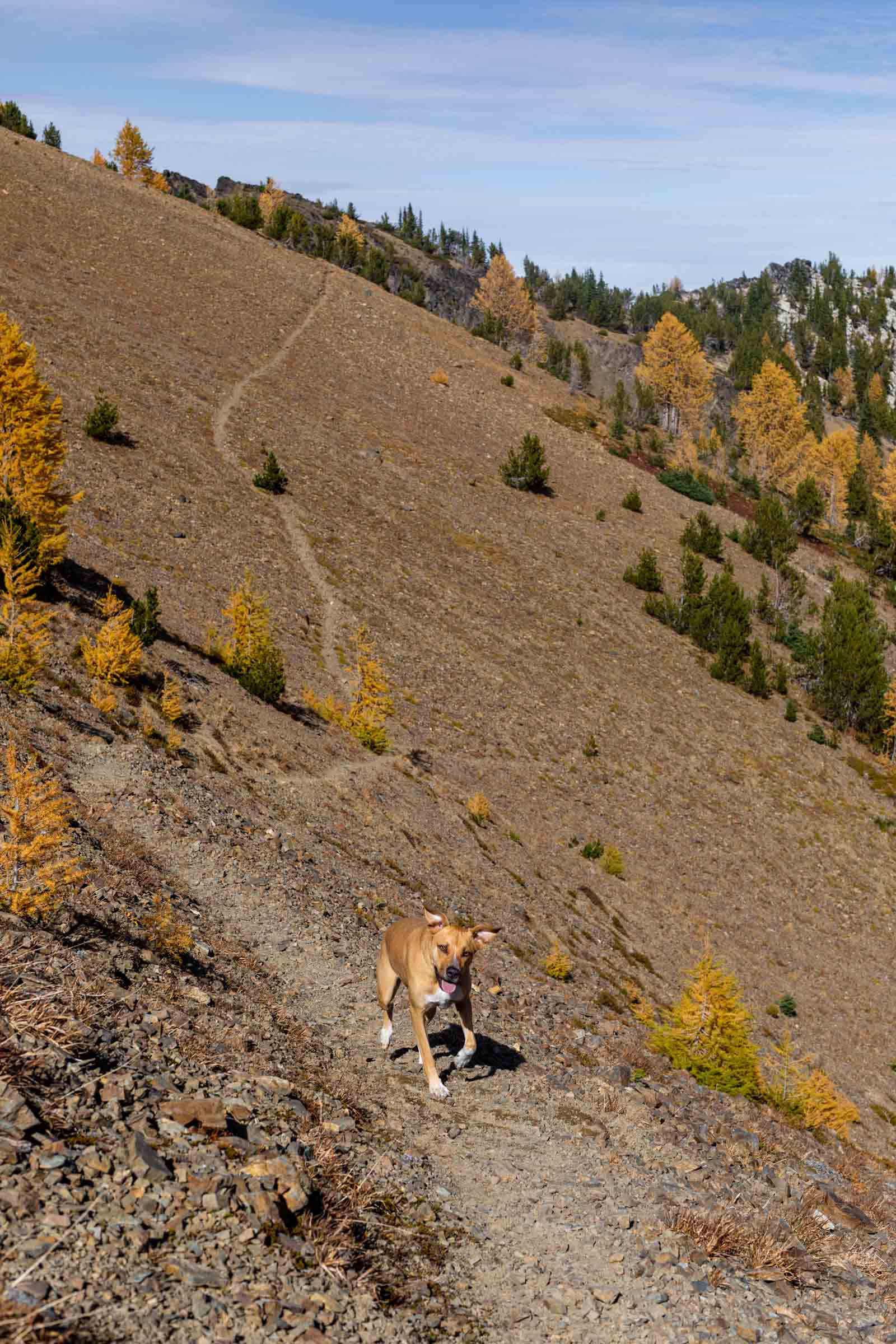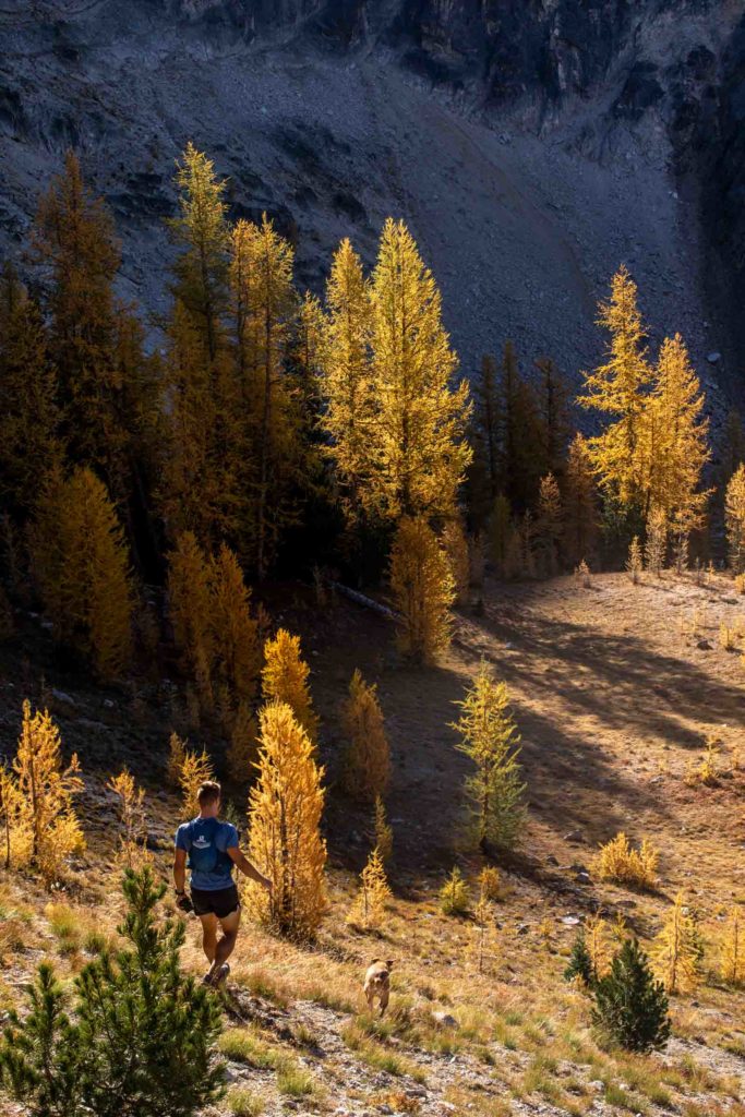 Jogging with a dog. Bugaboo has been the best dog I’ve ran/hiked with thus far and I couldn’t believe I got to go on a larch march with him! I’ve clearly been a larch madness craze lately, from the North Cascades to the Chiwaukum, it’s been a non-stop search for those beautiful yellow trees and fall alpine colors. No doubt Washington has some of the most wonderful displays of autumn colors. And the larch is the most highly sought after plant. Never mind the red vine maples or golden grasslands. Everyone still flocks to the same 5 trails and to be honest, I’m tired of seeing the same hikes! The Chelan-Sawtooth Wilderness has been on my radar for a while now, but it takes a 4 hour drive each way, making it less desirable than many other hikes.