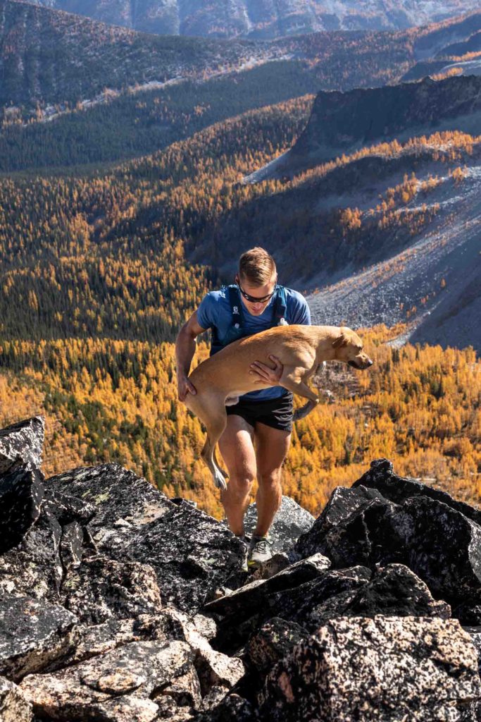 Scrambling down the west side of Courtney was somehow more boulder filled than the easterly sandy side. Quick and nimble we all got back down to the safety of the sandy slopes again much to the duo’s delight. We were a mere 50 feet away from safe haven when Bugaboo was so over it that he had to hide under a tree, unwilling to be carried further. I’m still in awe of the whole situation. The control needed to carry a 50+ pound wiggly weight and the calmness to be relocated against your knowledge.