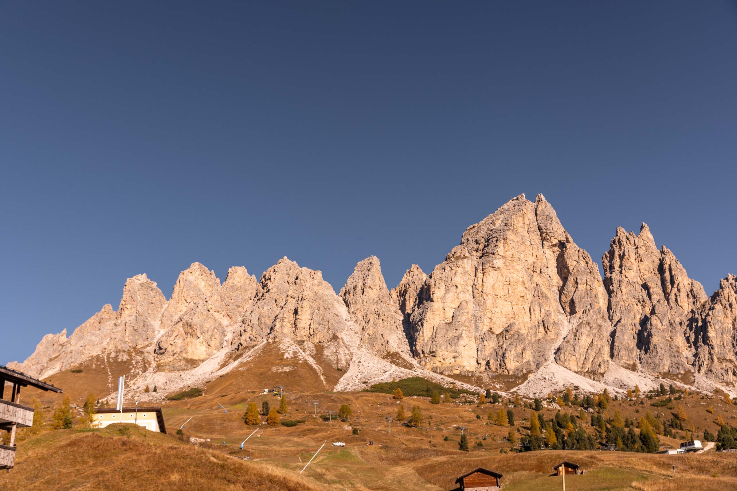 At the crack of dawn, I stepped outside, excited for the views. But little did I know there was a photography class right where I was headed. Hotel Mariaflora sits at the base of Piz Boè and a multitude of trails (major and use-trails) started from here. I kept climbing for higher views, mostly to get the hotel and other buildings out of the way. And ended right where the group was congregating. Higher up, it would’ve been too steep and too far away for me to venture. Here, the view was already incredible, better than what I could’ve planned. Alpenglow hitting all the mountains with sneaky views of Marmolada, Queen of the Dolomites.