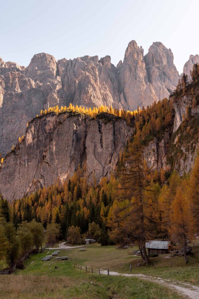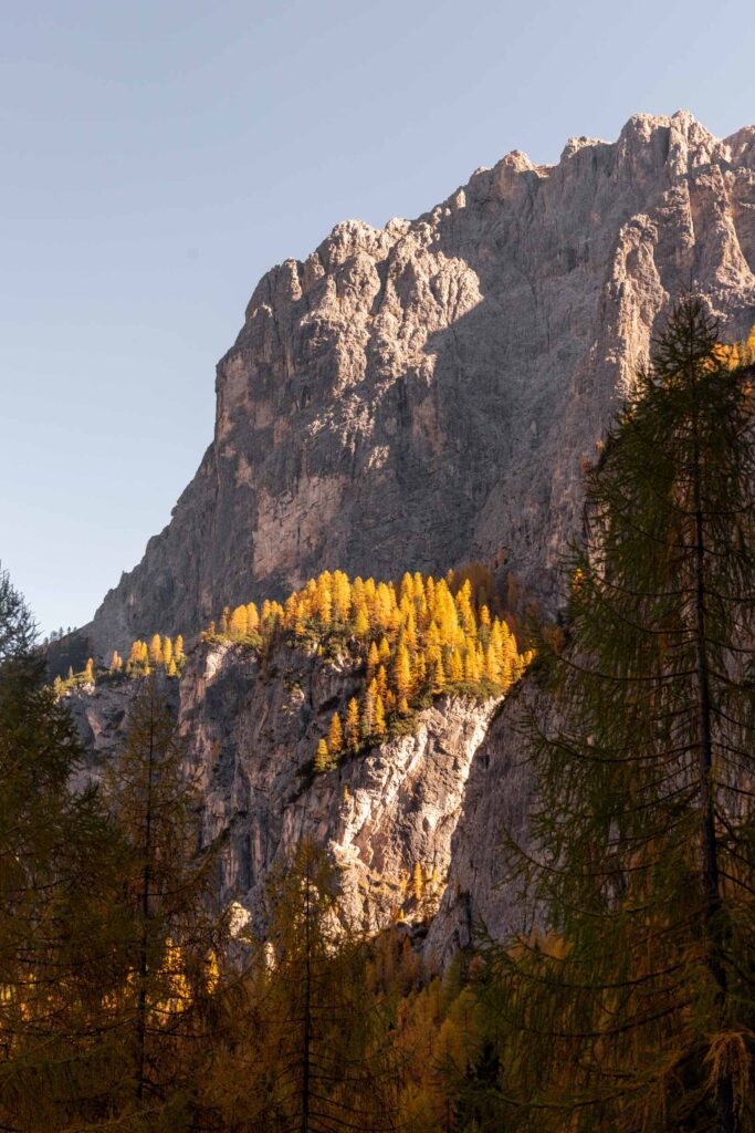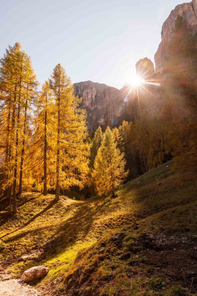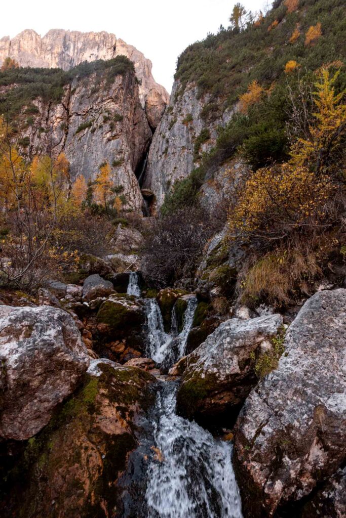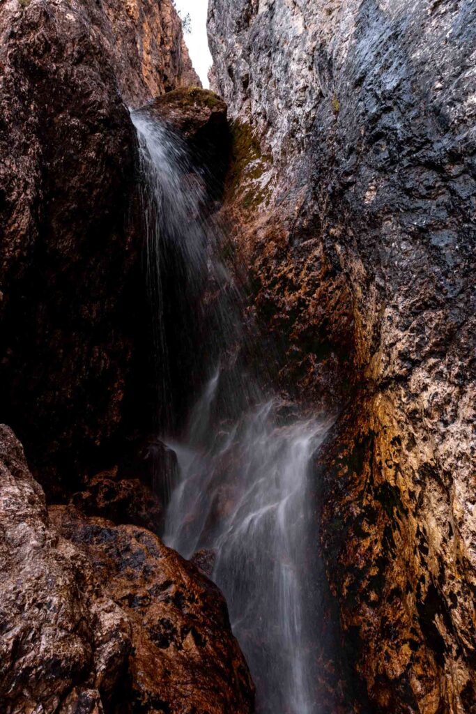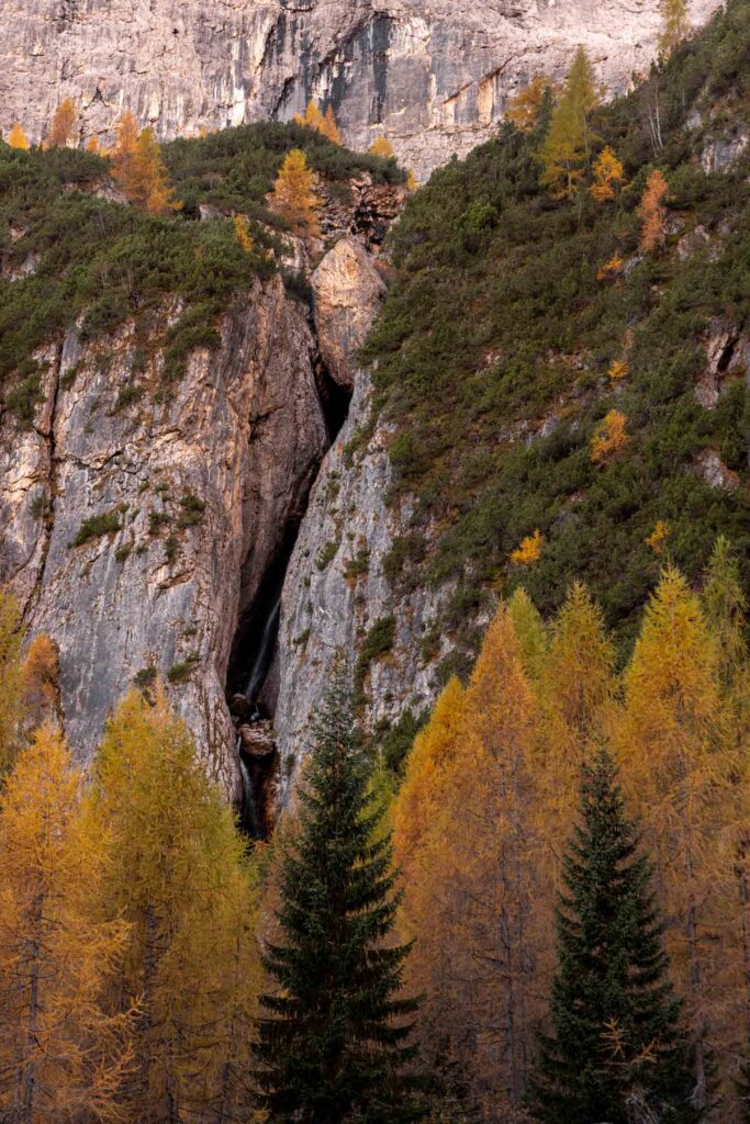We hiked through the prettiest larch grove at the base of Piz Boè and the light hit just right. Still dreaming about the views! It honestly dwarfed the waterfall views. At the base of the waterfall, there’s a little picnic area before you head up with enough signs to lead you from the trickling water to the rush of the waterfall itself. It was a rather low flow and I think it’s because it hadn’t rained recently. Probably a better spring time activity.