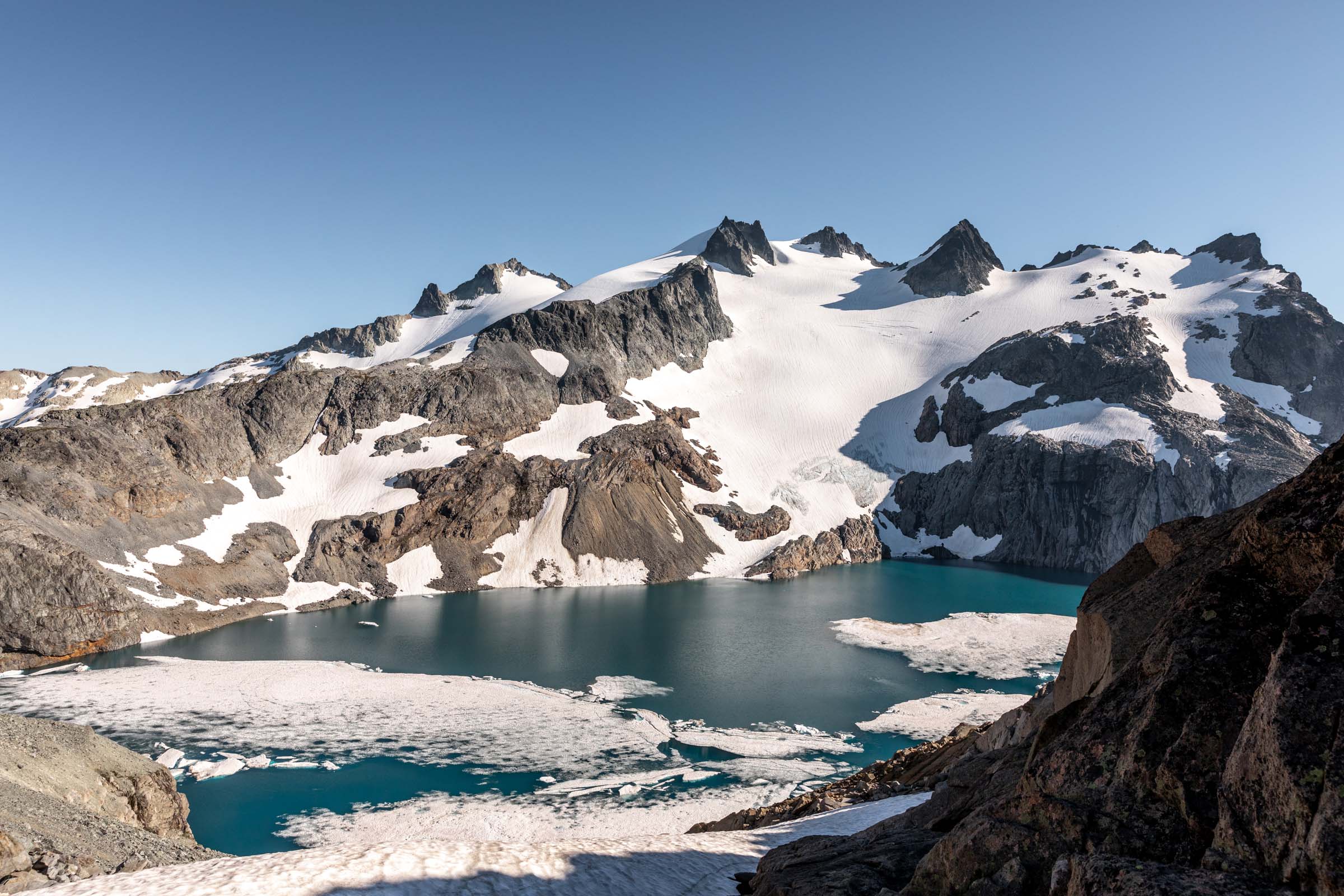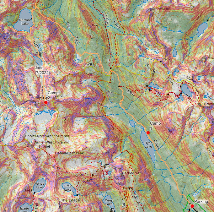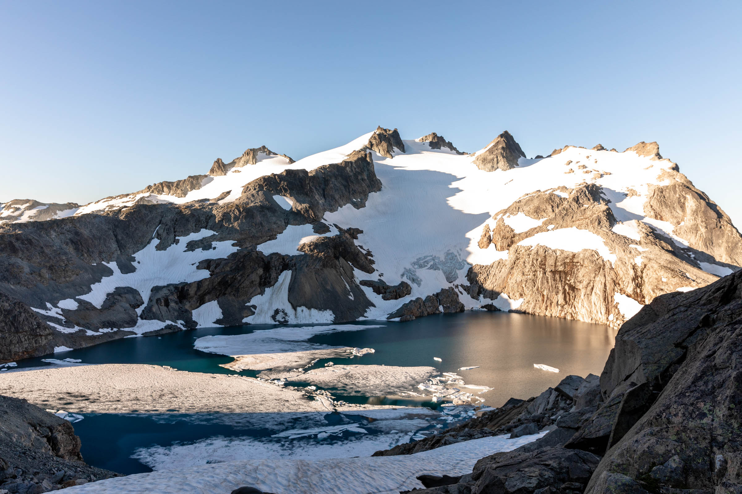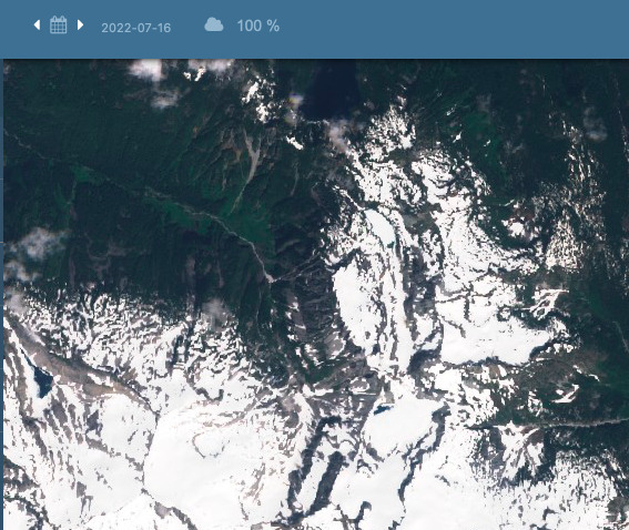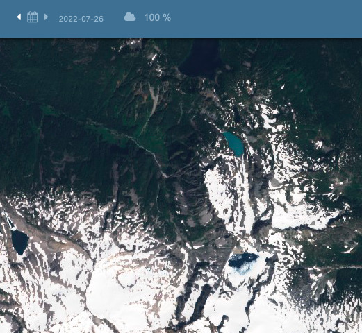 Fortunately, Sentinel Hub had a recent satellite imagery that loaded a few days before our planned trip. Between the two images, about 5 days apart, the snow had completely melted out. See above for the changes. The lake is upper right side that goes from full snow coverage to entirely clear. This is Jade Lake. The lower lake is Pea Soup Lake and the completely dark blue snow-free one is Marmot on top. This supported my prediction that the heat wave would impact a quicker thaw of the lake. Hurray! At least the aqua lake would be clear. This left us questioning Pea Soup Lake. At this rate, I’d imagine it to clear up decently as well, although possibly still have a few floating icebergs.