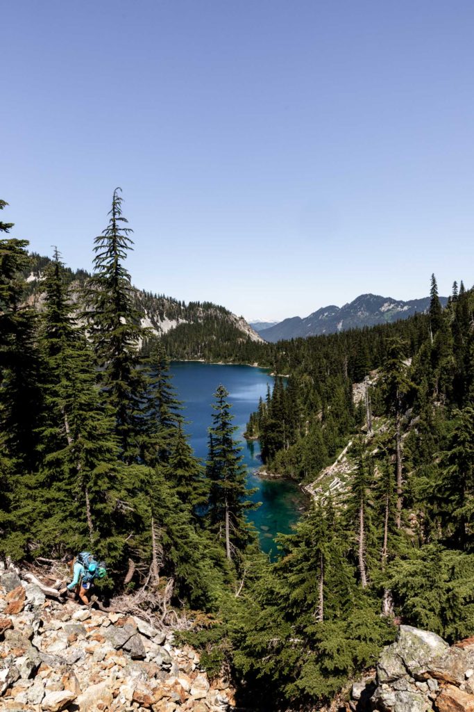 I misread the map wrong, thinking it would be another 1000 foot climb, but it was more like 800 feet up with a 200 foot descent. So I was pleasantly surprised by how short the “scramble” section would be. It’s always hard to judge what people mean by difficult or easy. The route from Marmot to Jade takes a little bit of route finding skill. To me, it is fairly easy to follow the cairns (rock stacks), but it might not be the most intuitive for all hikers. The trail also becomes a bit more narrow and primitive, climbing over trees and some amount of loose rock and boulders. But fear not because it is only a short section before you find the trail again on the left side of the boulder field. I personally enjoy boulder hopping, but following a trail is always simplest.