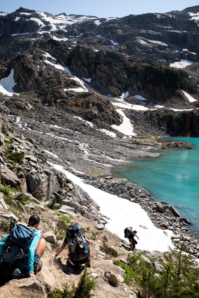 We were all a little gassed once at Marmot Lake. We took a nice long lunch break and I even took a full dip into the lake. It was surprisingly warm for an alpine lake. I’ve been trying to make it a goal to jump in more alpine lakes and figured why not both. Or at least this one because who knows how much colder Jade Lake would be. My feet especially felt refreshed and ready for the next climb. We were still on schedule – spending an hour or two at each lake with enough time to head up to Dip Top Gap for the evening and snag the spot. We passed many campsites all along Marmot Lake, many which are closer to the south end of the lake. I didn’t count how many but they were all very empty (I think only about 2 groups camped there this night).