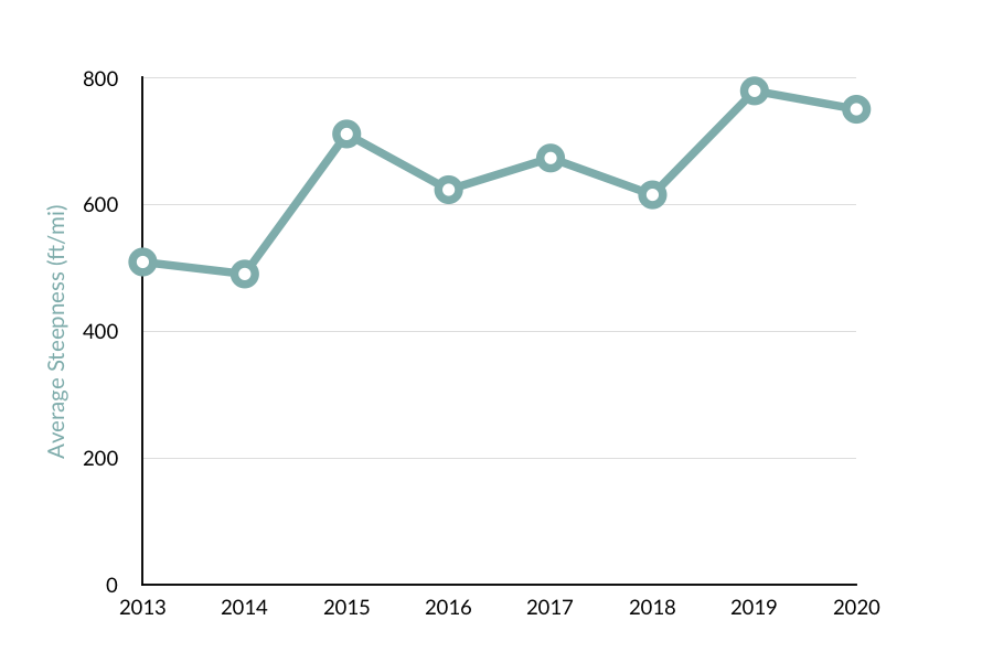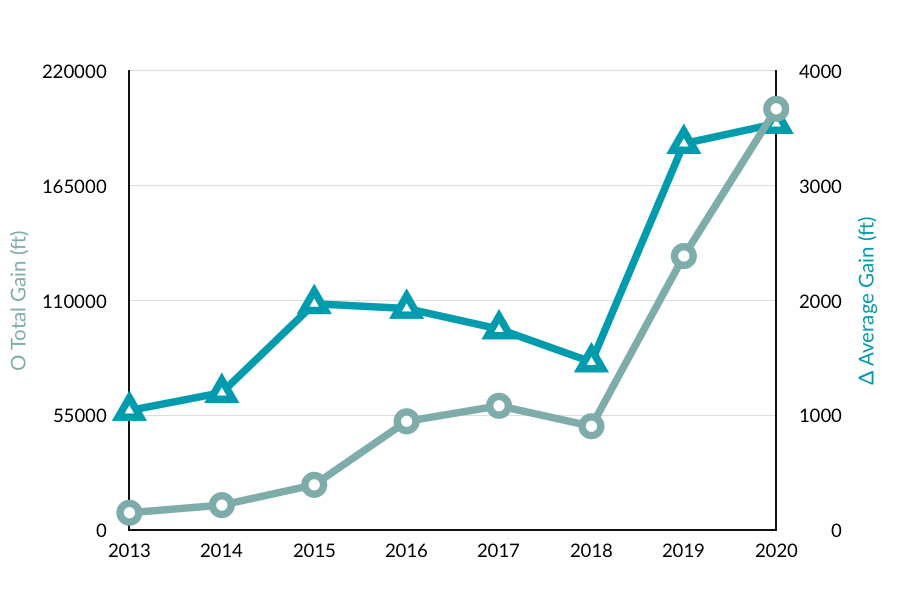 And to merge the distance with gain data, we can look at average steepness too! Again, 2015 shows how I got overly enthusiastic and was searching for more gains and didn’t value the shorter hikes like I did the next couple years. And most recently, I’ve been climbing more technical mountains with steeper trails (up to 2000 ft/mi), but also some easier trails (and less elevation with backcountry skiing) mixed in to get that slightly lowered average. But an overall there is an upwards trend. I think this is more reflective on the types of trails I’ve been on.
