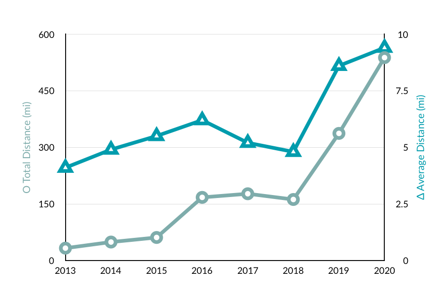 Another cool point is the sharp increase in 2019 and 2020 for the elevation gain, both total and average gains are much more than before. During 2015 through 2018, it seems like I only pushed myself the same amount, but took a huge leap last year as I tackled more mountains! Up till 2018, I generally did not hike more than 8 miles and 4000 ft gain at a time. So it’s been an eye-opener to know that the human body can do more than you expect sometimes! Total distance reflects a similar trend to the gain.